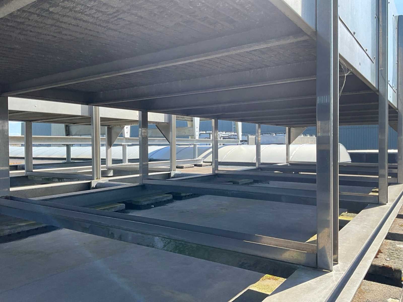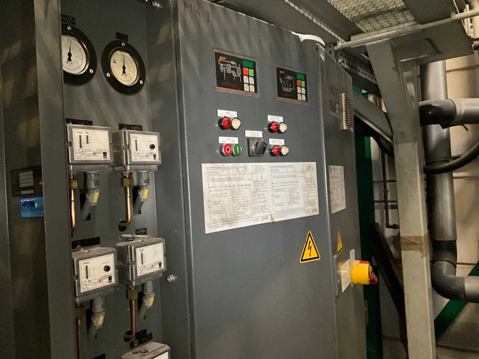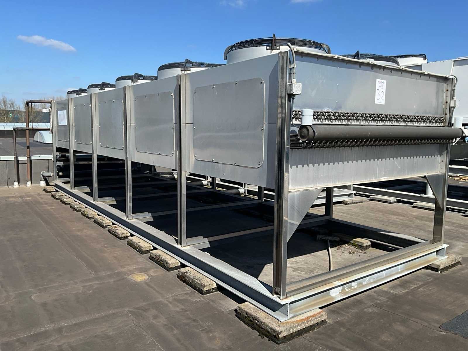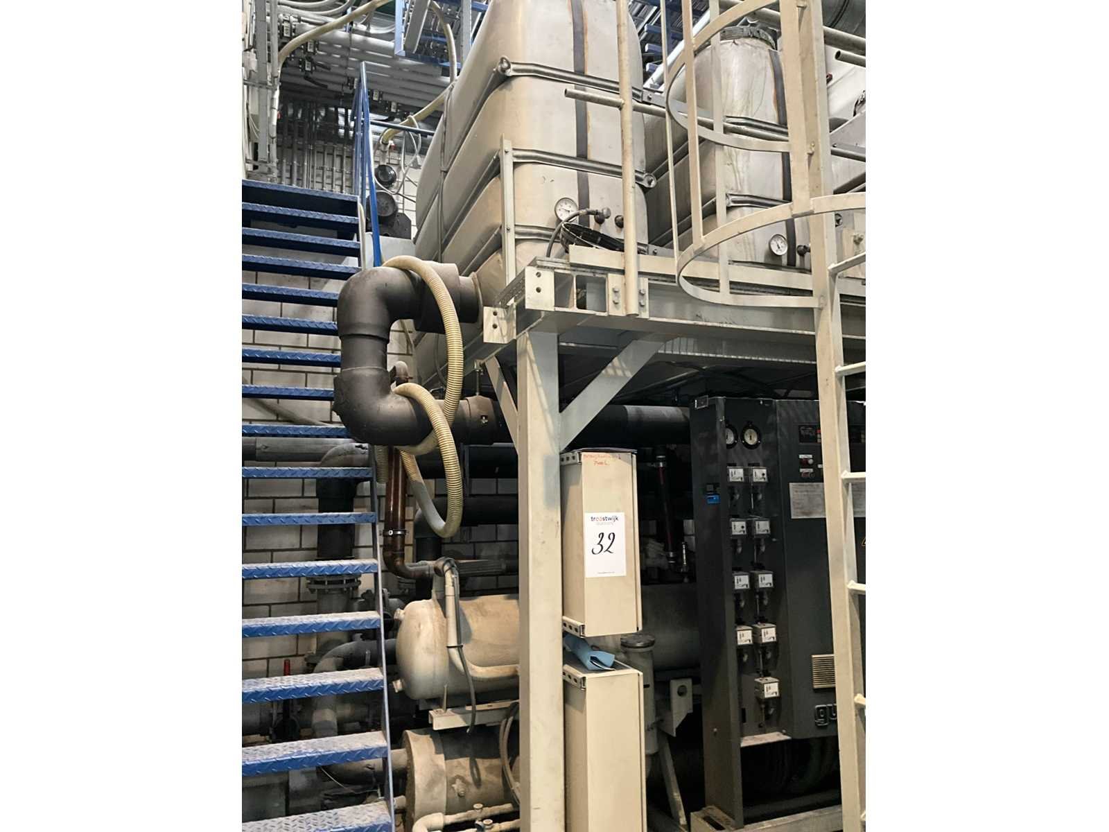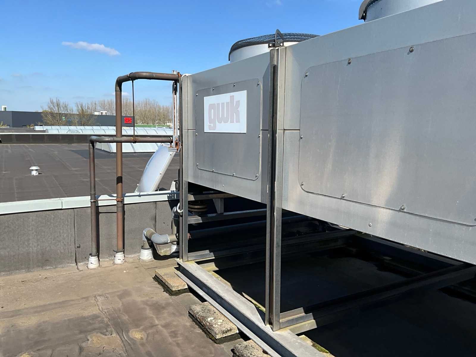 Bestaande uit 1x koelwater pompunit, voorzien van 2x DWM Copeland koelcompressor, 3x koelwater tanks, circulatie pompen, besturingskast, vloeroppervlakte 4100x2400 mm, 1x condensor op het dak, voorzien van 10x ventilator, condensor afmeting (LxWxH) 8100x2500x2200 mm, Let op! afhalen op afspraak, leidingwerk naar de condensor niet inbegrepen, koudemiddel is reeds afgetapt Merk: GWK Aansluiting: 400V Type koudemiddel: R407C