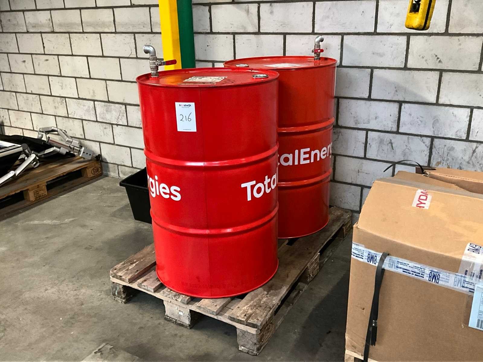 2x aangebroken vat; totaal circa 250 liter; inclusief diverse kunststof olie kannen; Merk: Total Energies Type: Drosera MS 68 / Carter EP 460