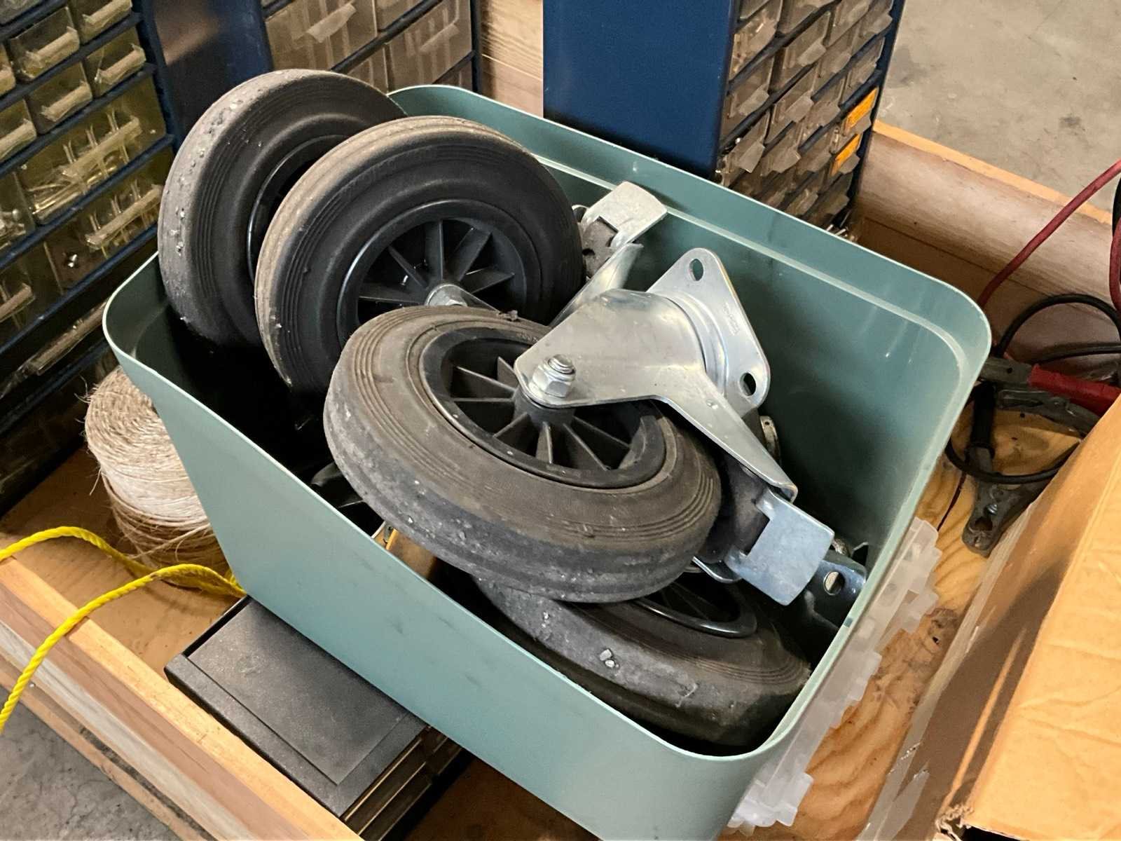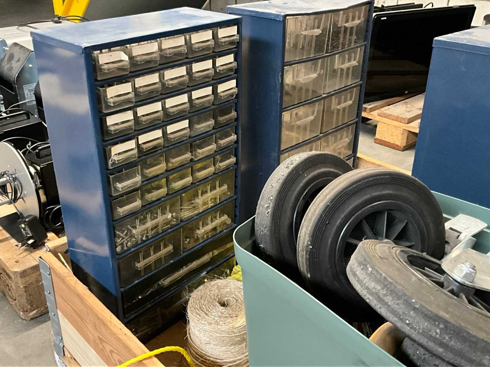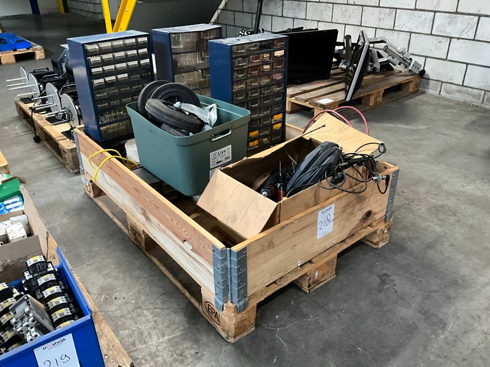 Waaronder: 2x pneumatische schroefmachines; diverse zwenkwielen; 3x staal assortibox voorzien van diverse inhoud waaronder spijkers; schroeven; glaszekeringen; klinknagels;