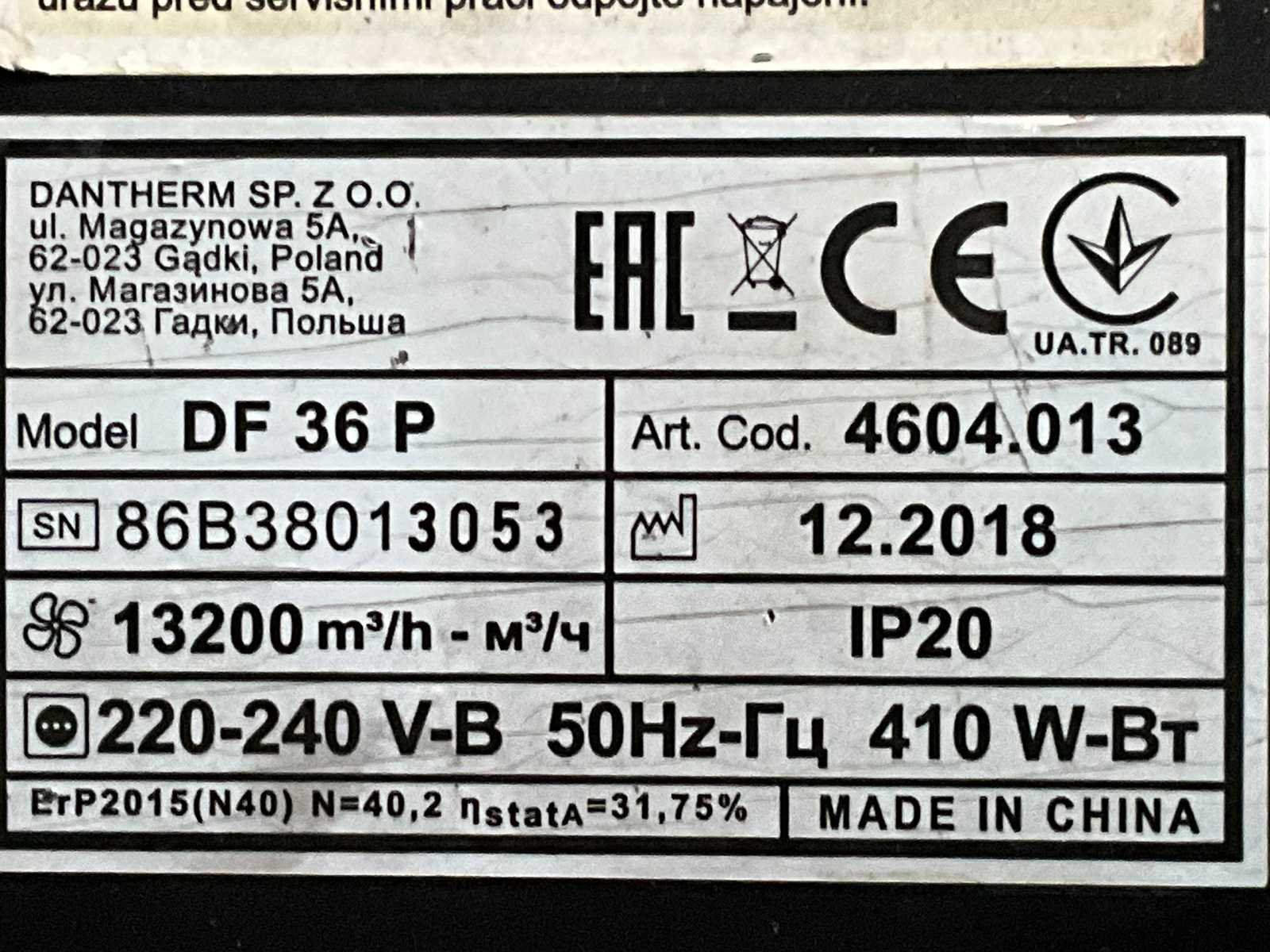 2018 danther / master df 36 p industriële ventilator