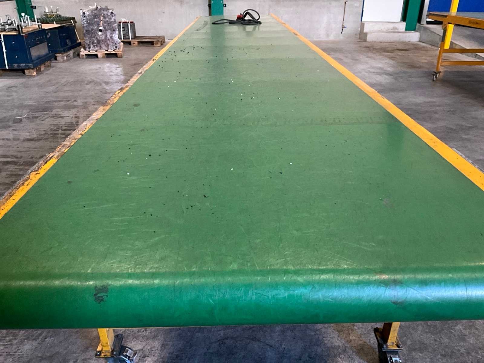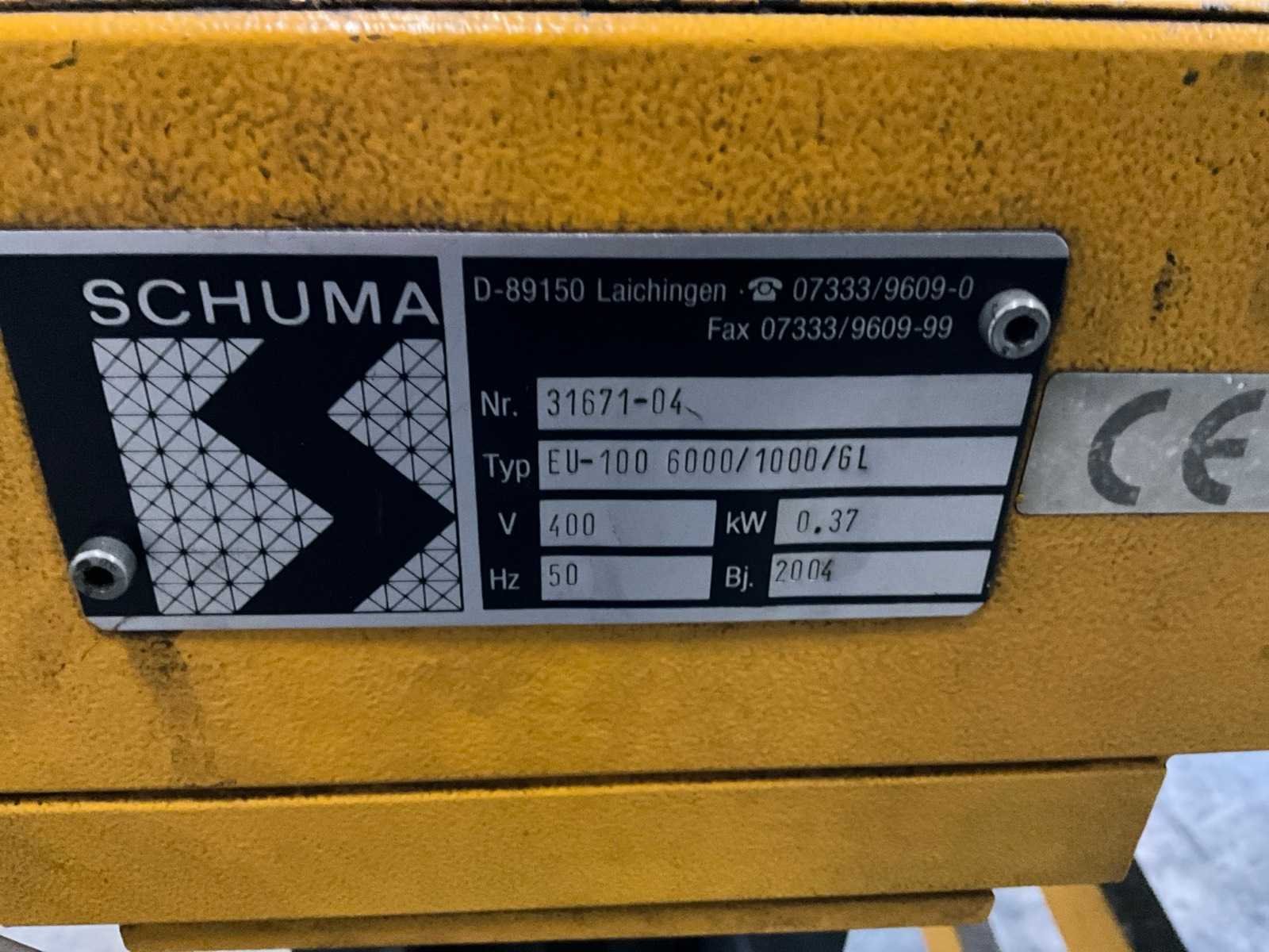 Voorzien van zwenkwielen, hoogte verstelbaar, Merk: Schuma Type: EU-100 6000/1000/GL Bouwjaar: 2004 Band afm. b: 1000mm Band afm. l: 6000mm Elektrisch aangedreven: true Aansluiting: 400V Totale afmeting Hoogte: 950mm