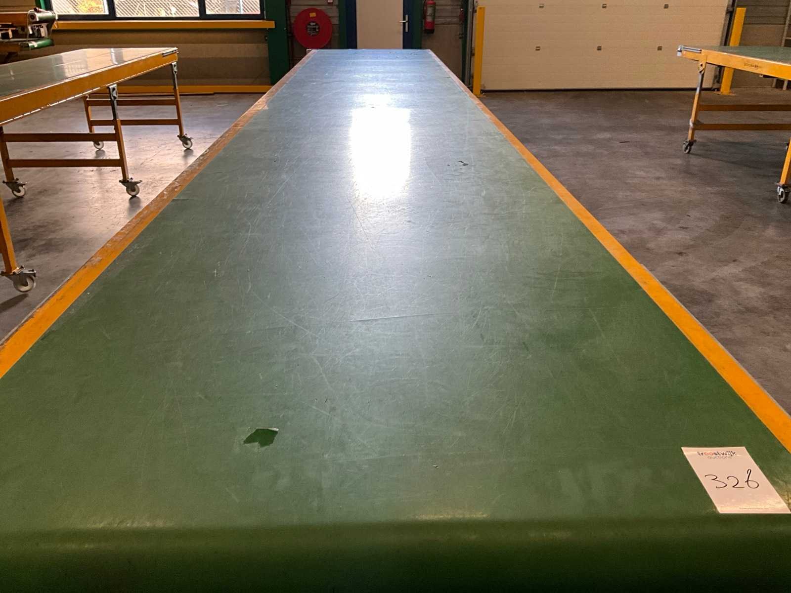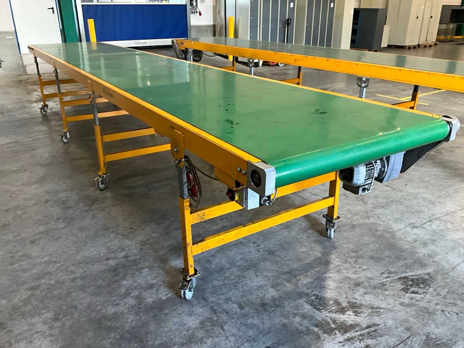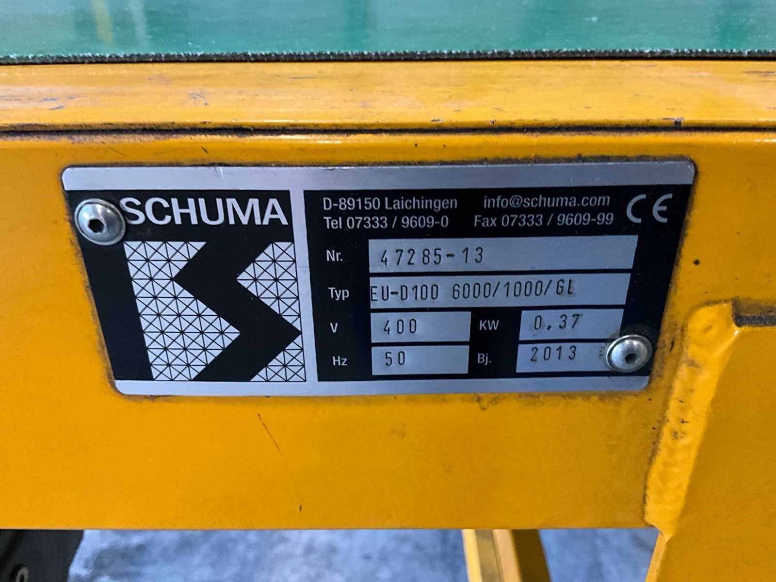 Voorzien van zwenkwielen, hoogte verstelbaar, Merk: Schuma Type: EU-D100 6000/1000/GL Bouwjaar: 2013 Band afm. b: 1000mm Band afm. l: 6000mm Elektrisch aangedreven: true Aansluiting: 400V Totale afmeting Hoogte: 950mm
