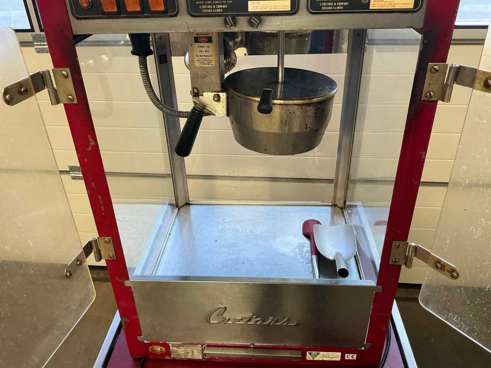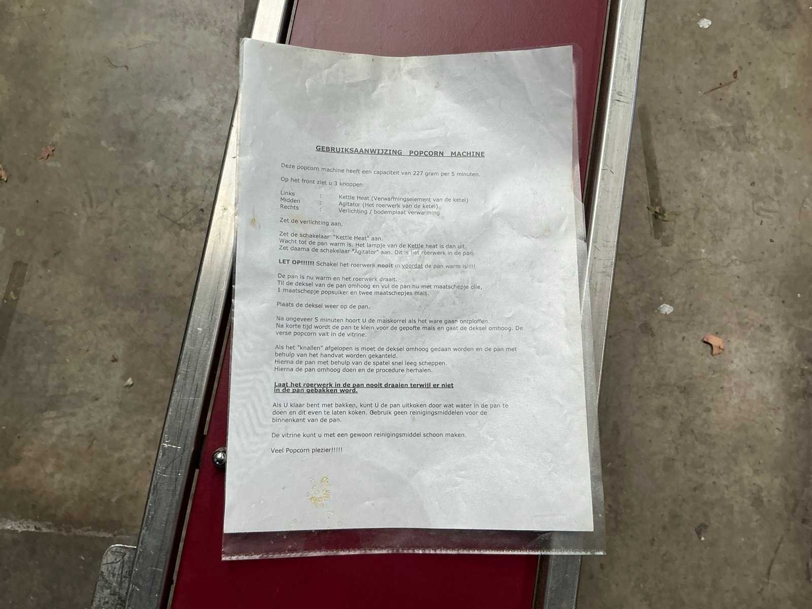Met transportkist Merk: Cretors Totale afmeting L: 800mm Totale afmeting Breedte: 690mm Totale afmeting Hoogte: 1780mm Serienummer: 05010619 Aansluiting: 230V