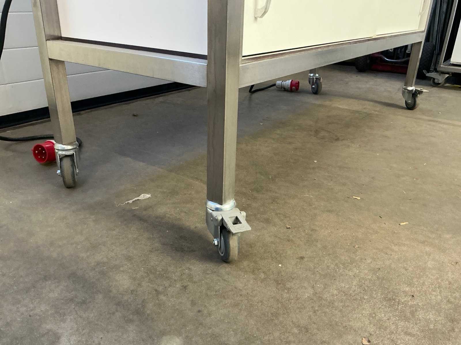 Mobiel, voorzien van onder andere, plaat, 4 pits, opbergruime. 400v aansluiting Lengte: 60cm Breedte: 160cm Hoogte: 107cm