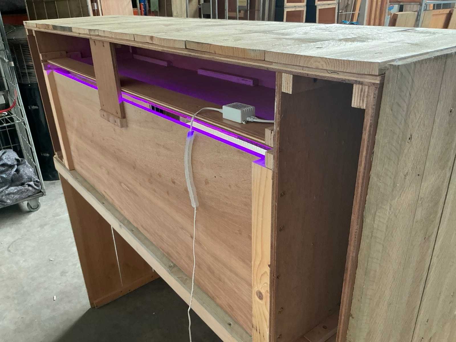 Afmetingen backbar (LxBxH:800x1560x1650mm) voorzien van led verlichting. Gedemonteerd Totale afmeting L: 123cm Totale afmeting Breedte: 255cm Totale afmeting Hoogte: 120cm Hout: true