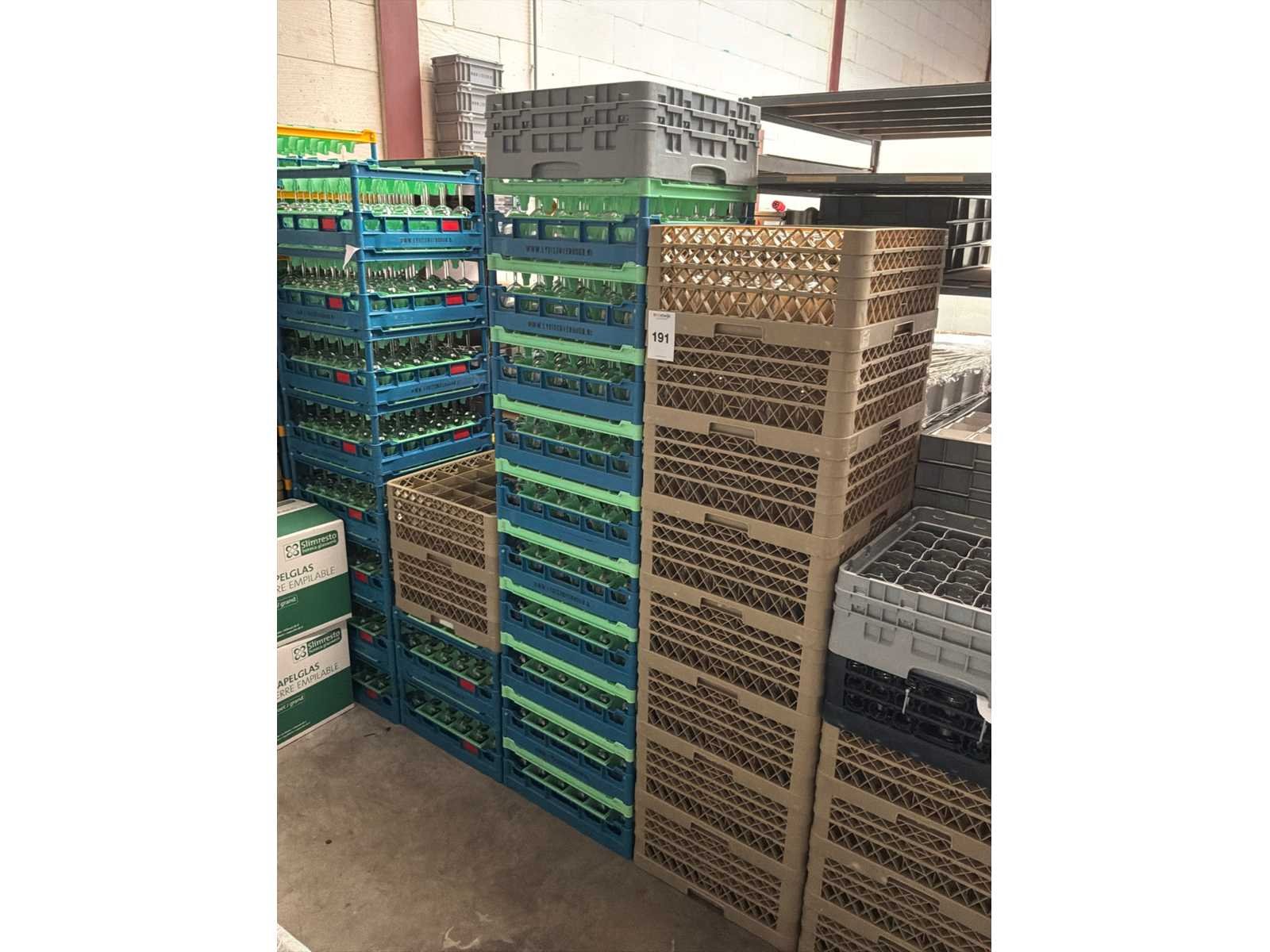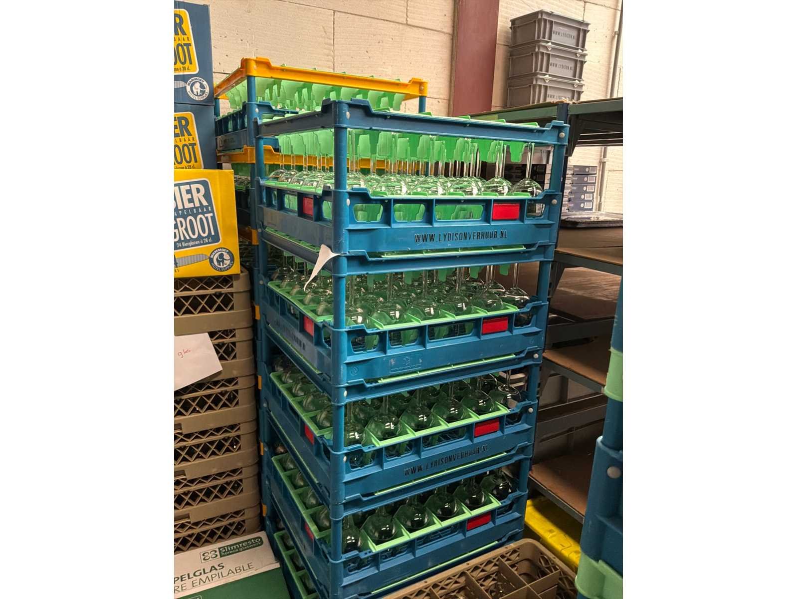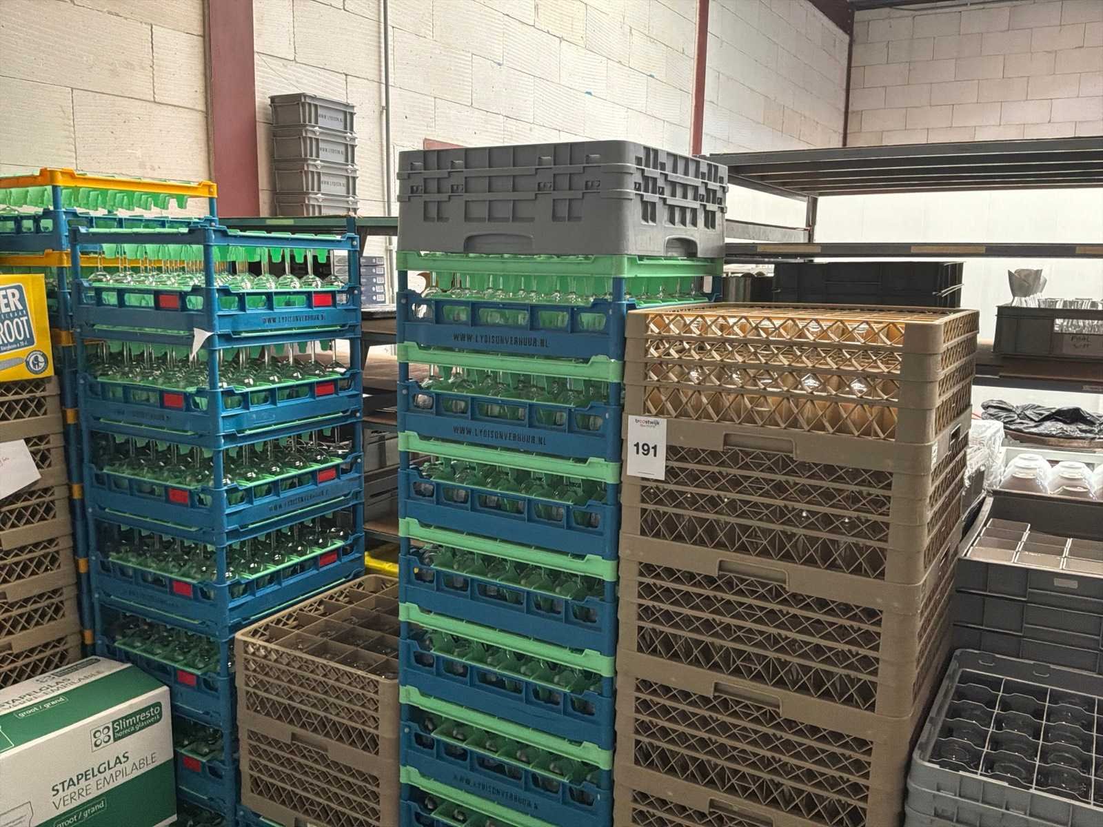 In ca. 43 kratten en dozen. 363x Champagne flute, 1108x wijnglas.