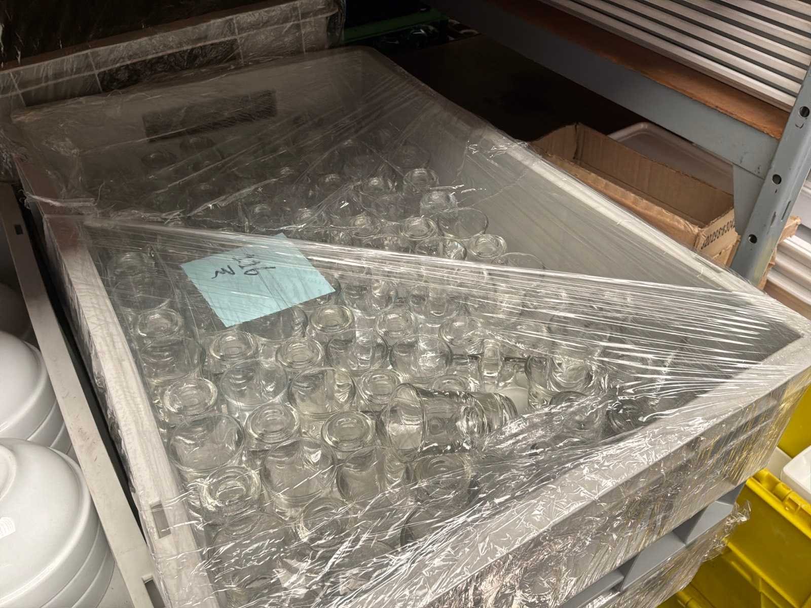 In 19 kratten/bakken w.o soepkommen, vaasjes, suikerpotjes, borden. 631x shotglas. 180x schaaltjes vierkant, suiker en roomkan 21x
