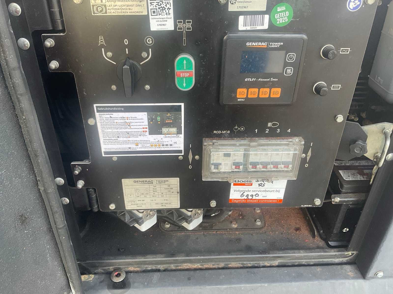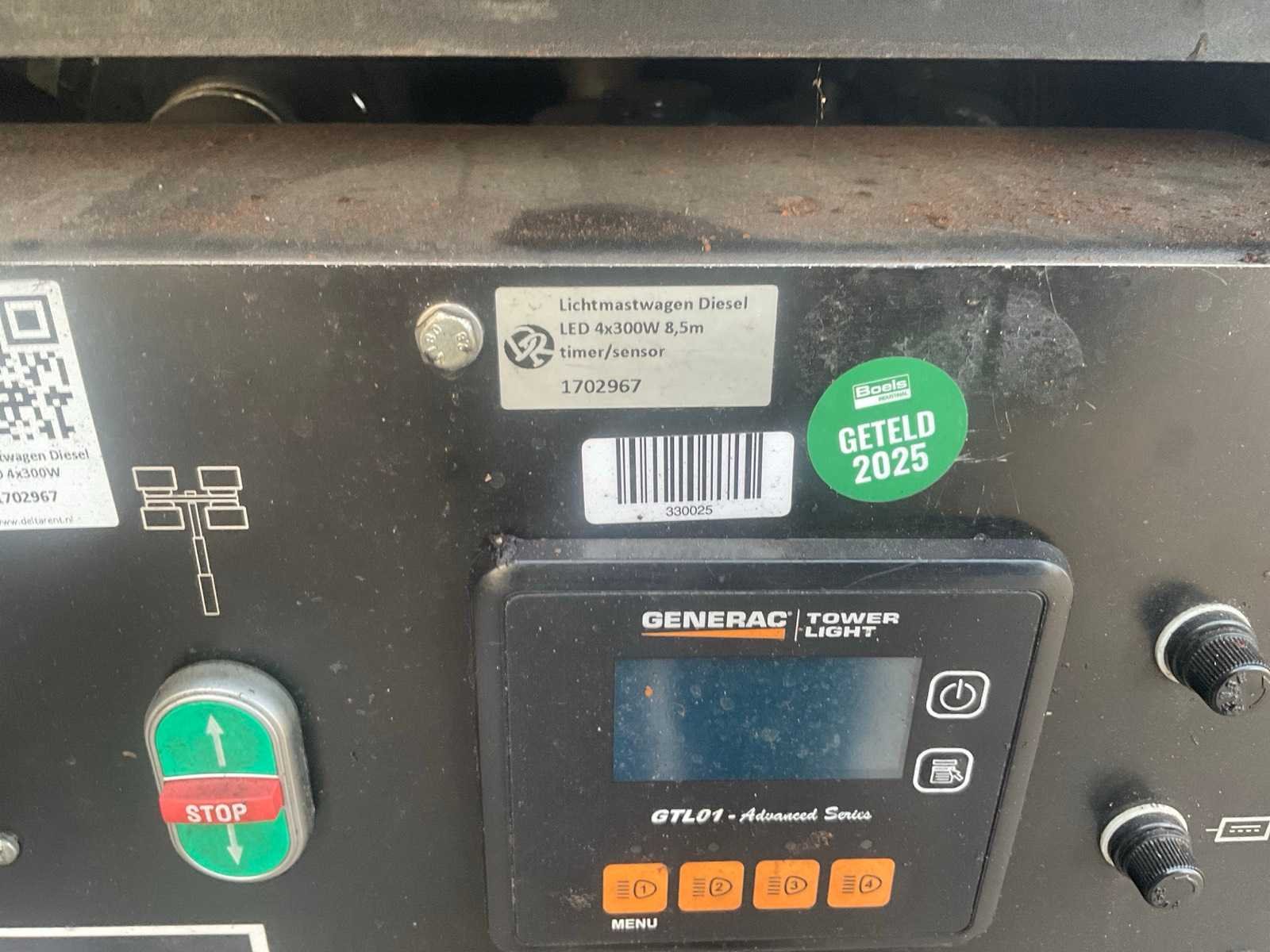 Diesel. Kubota 6500 uur Storing slaat uit. Naar paar minuten Kabel mast 1 gebroken Mast gaat wel uit 2 delen Merk: Generac Type: V 20 Bouwjaar: 2017 LED: true Eigen gewicht: 1200kg Totale afmeting L: 2200mm Totale afmeting Breedte: 1400mm Totale afmeting Hoogte: 2600mm