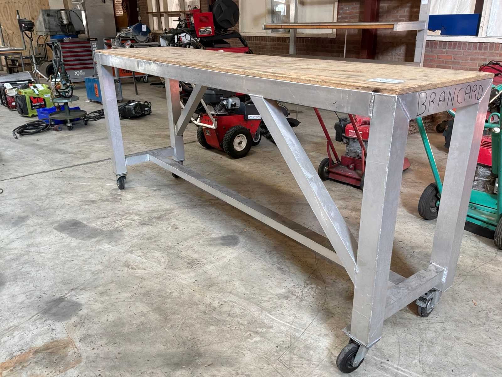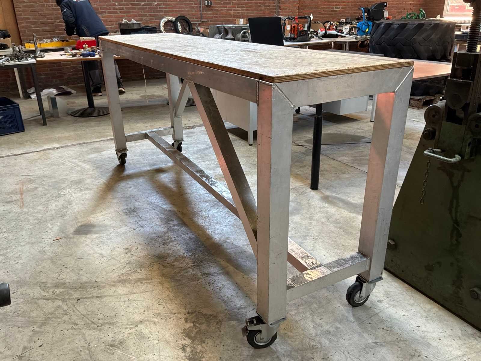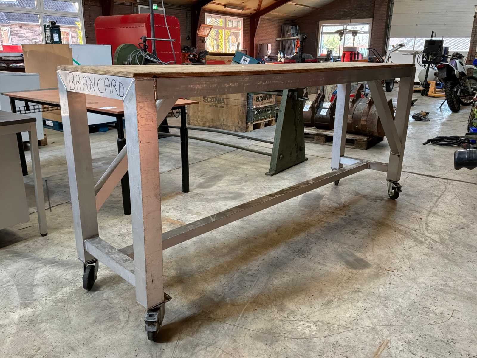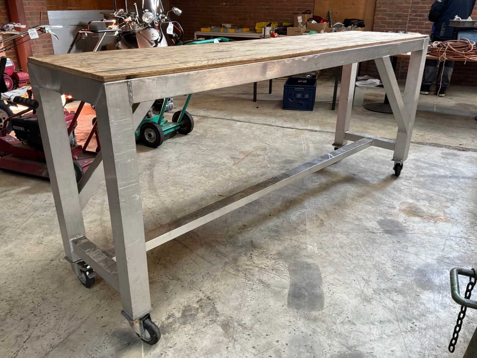Aluminium tafel met een houten werkblad, verrijdbaar. Breedte: 2460mm Lengte: 600mm Hoogte: 10mm Materiaal: Aluminium