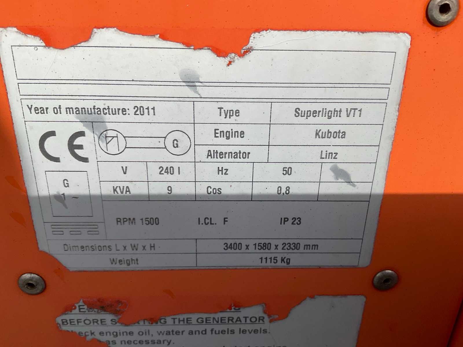 KUBOTA motor Merk: TOWER LIGHT. Type: VT1 Bouwjaar: 2011 Gasontladingslamp: true Statief: true Totale afmeting L: 3000mm Totale afmeting Breedte: 1000mm Totale afmeting Hoogte: 2200mm