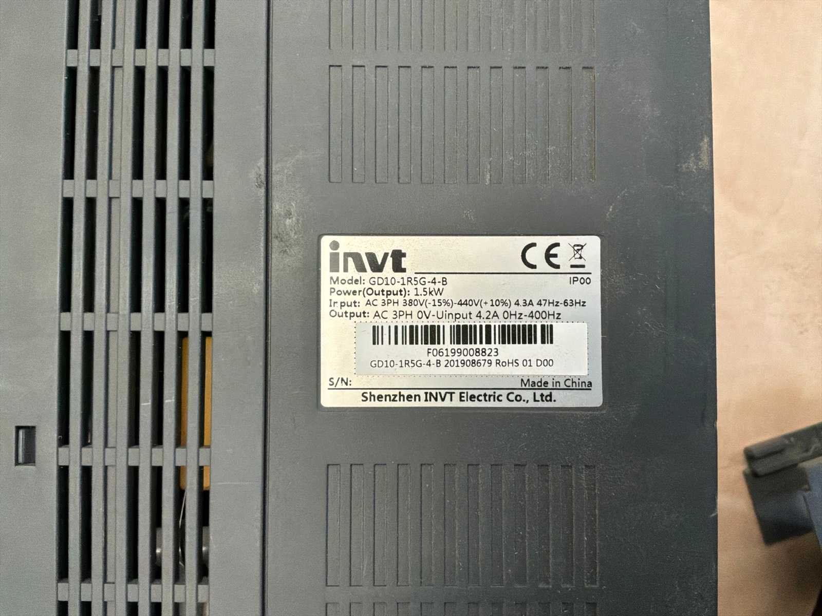 Merk: INVT Model: GD10-1R5G-4B Vermogen (kW): 1.5kW