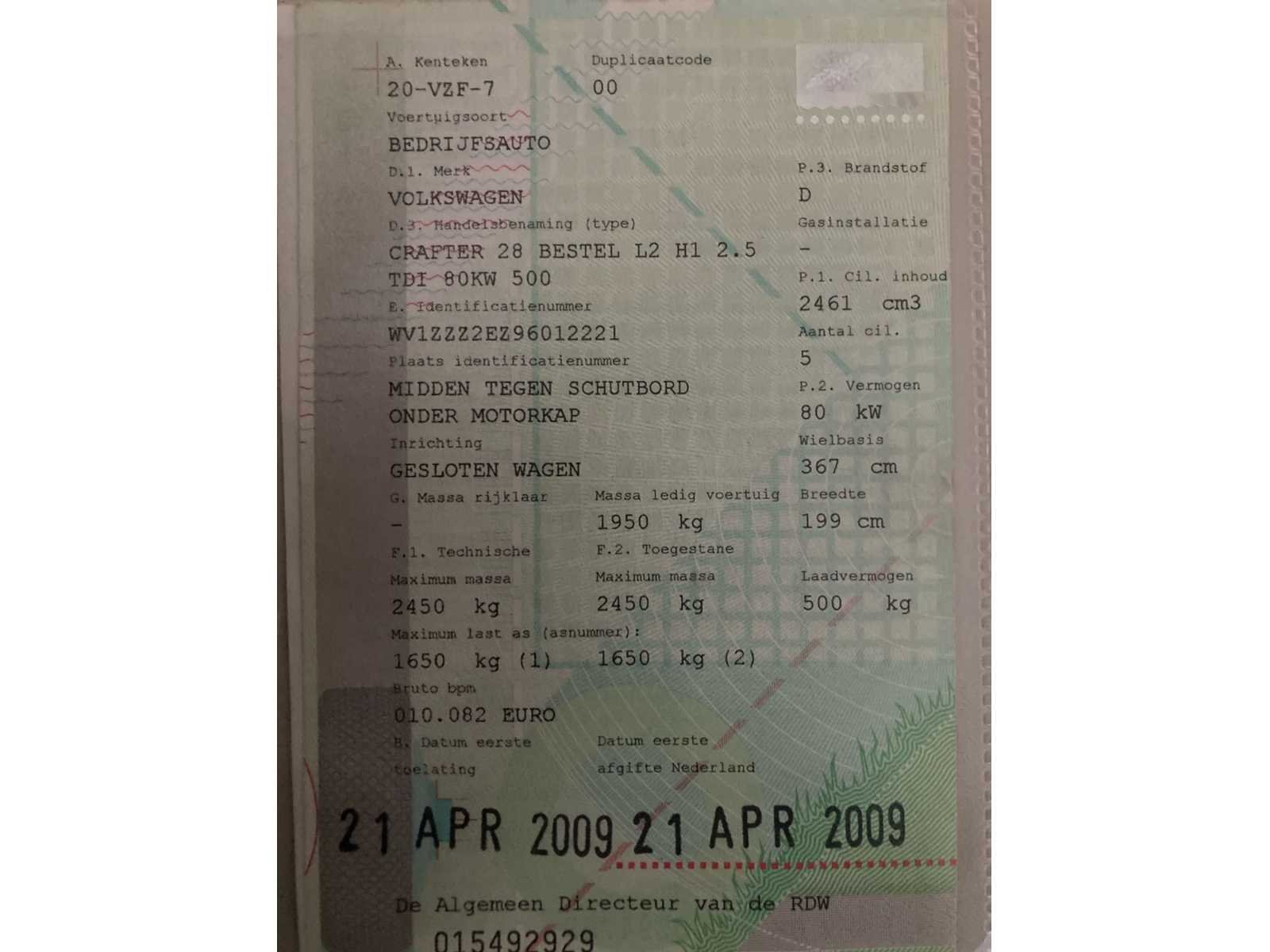 Omdat dit kavel niet in Spijkenisse staat moet u ons een mail sturen dan krijgt u van ons het adres. Vermeld wel het veilingnummer en kavel nummer zodat het voor ons makkelijker zoeken is. INFO@COLLECTCARS.NL Kenteken: 20-VZF-7 Merk: Volkswagen Model: Crafter Type: 28 2.5 TDI L2H1 Bouwjaar: 2009 Afgelezen kilometerstand: 270076km Cilinderinhoud: 2461cc Vermogen (kW): 80kW Brandstof: Diesel Chassisnummer: WV1ZZZ2EZ96012221 NAP status: Logical Datum eerste toelating: 2009-04-21 APK vervaldatum: 2026-04-21 Vermogen (pk): 107hp Aandrijving: RWD Aantal zitplaatsen: 3 Maximaal trekgewicht geremd: 750kg Kleur: niet van toepassing Transmissie: Handgeschakeld (6) Emissieklasse: 4 Ledig gewicht: 1950kg Aantal cilinders: 5 Carrosserie: Gesloten opbouw Carfax Link: https://was.carfax.eu/v0/api/ccdid/5100016408/svc/201/vinreg/20VZF7/checksum/eyJhbGciOiJIUzI1NiIsInR5cCI6IkpXVCJ9.eyJleHAiOjE3Nzc3MjkxMTF9.IxnveU38-Q2bE7M5bUiJIpzfaxyu7xwH9CIESx3PPkA startinformatie : Start en rijdt