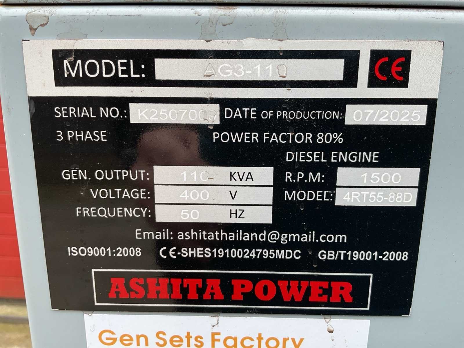 Voorzien van silent diesel generator; Generator vermogen: 110 kVA; Power factor: 0.8; Effectief vermogen: 88 kW; Spanning: 400 V / 230 V; Frequentie: 50 Hz; Fasen: 3-fase; Nominale snelheid: 1500 rpm; Motormodel: 4RT55-88D; Type: turbocharged dieselmotor; Aantal cilinders: 4; Cilinderinhoud: 5.3 L; Vermogen motor: 88 kW @ 1500 rpm; Lengte: 260 cm; Breedte: 110 cm; Hoogte: 131 cm; Gewicht: 2000 kg; 2× 400V CEE krachtstroom aansluitingen; 1× 230V CEE aansluiting; Automatische zekeringen (CHINT); Hoofdschakelaar / breaker; Silent canopy (geluidsarm); Digitale genset controller; Noodstop; Circuit breakers; Geluidsisolatiekast; Hefpunten / vorkheftruck openingen Merk: Ashita power Type: AG3-110 Diesel: true
