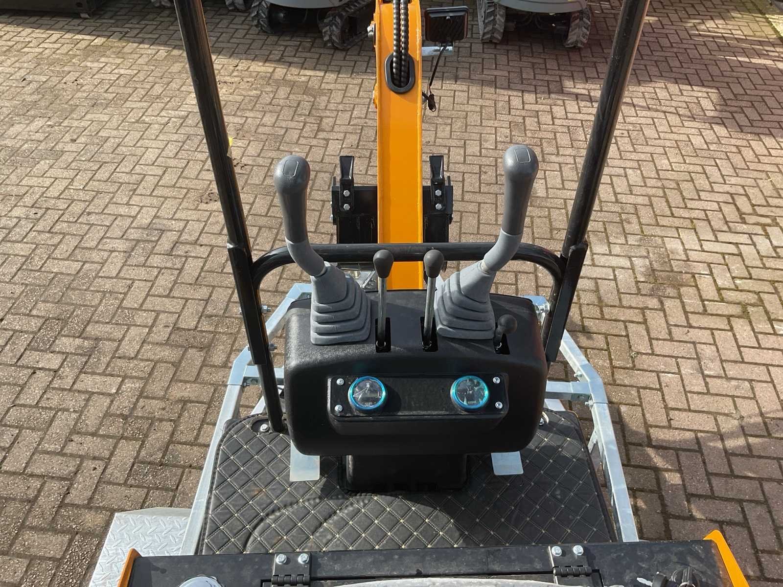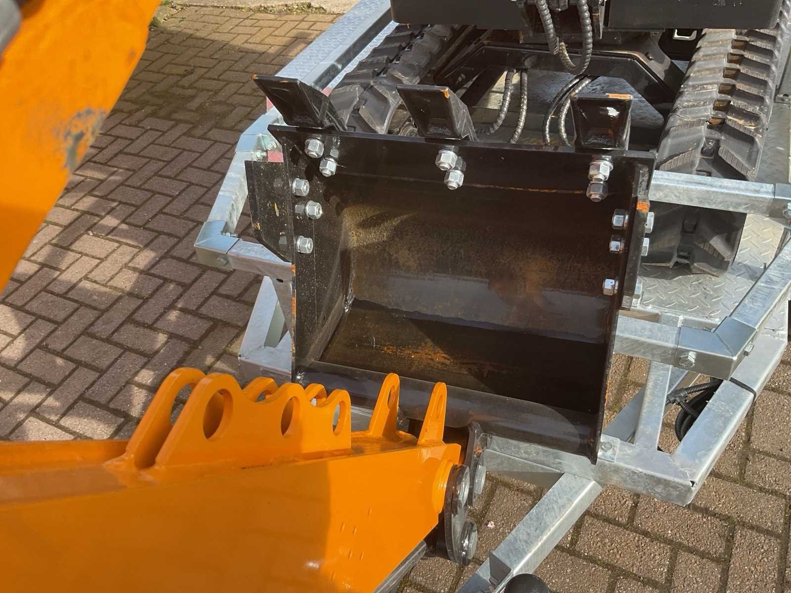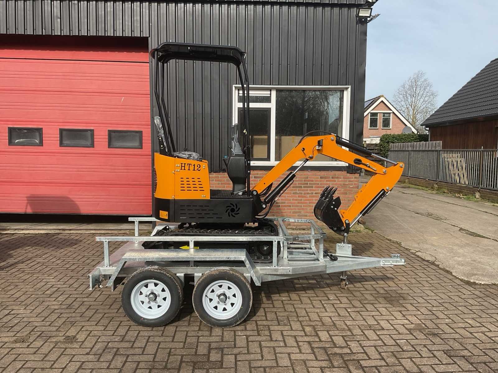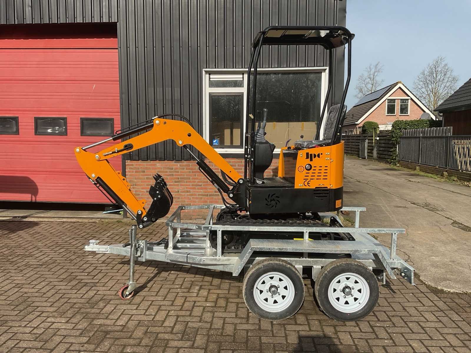 Voorzien van Brandstofmotor: Diesel; Motorvermogen: 12 PK; Motor: 1-cilinder Gewicht en afmetingen (machine); Bedrijfsgewicht: 1.020 kg; Lengte: 2.50 m; Breedte: 0.95 m; Hoogte: 2.20 m; Max. graafdiepte: 1.65 m; Bakbreedte: 300 mm Bakinhoud: ± 0.02 – 0.06 m³; Zwenkbereik: 360° continu; Rubber rupsen; Rupsbreedte: 180 mm; Aandrijving: hydraulisch rupsonderstel; Hulphydrauliek voor accessoires; Aansluiting voor hydraulische hamer; Dozerblad voor nivelleren; Joystick bediening; Werkverlichting; Elektrisch display; Trailer (bij set geleverd); Dubbelas machinetransporter; Oprijplaten; Transportafmetingen combinatie: ca. 3100 × 1700 × 3050 mm; Totaalgewicht combinatie: ca. 1.350 kg Merk: JPC Type: HT12 op trailer