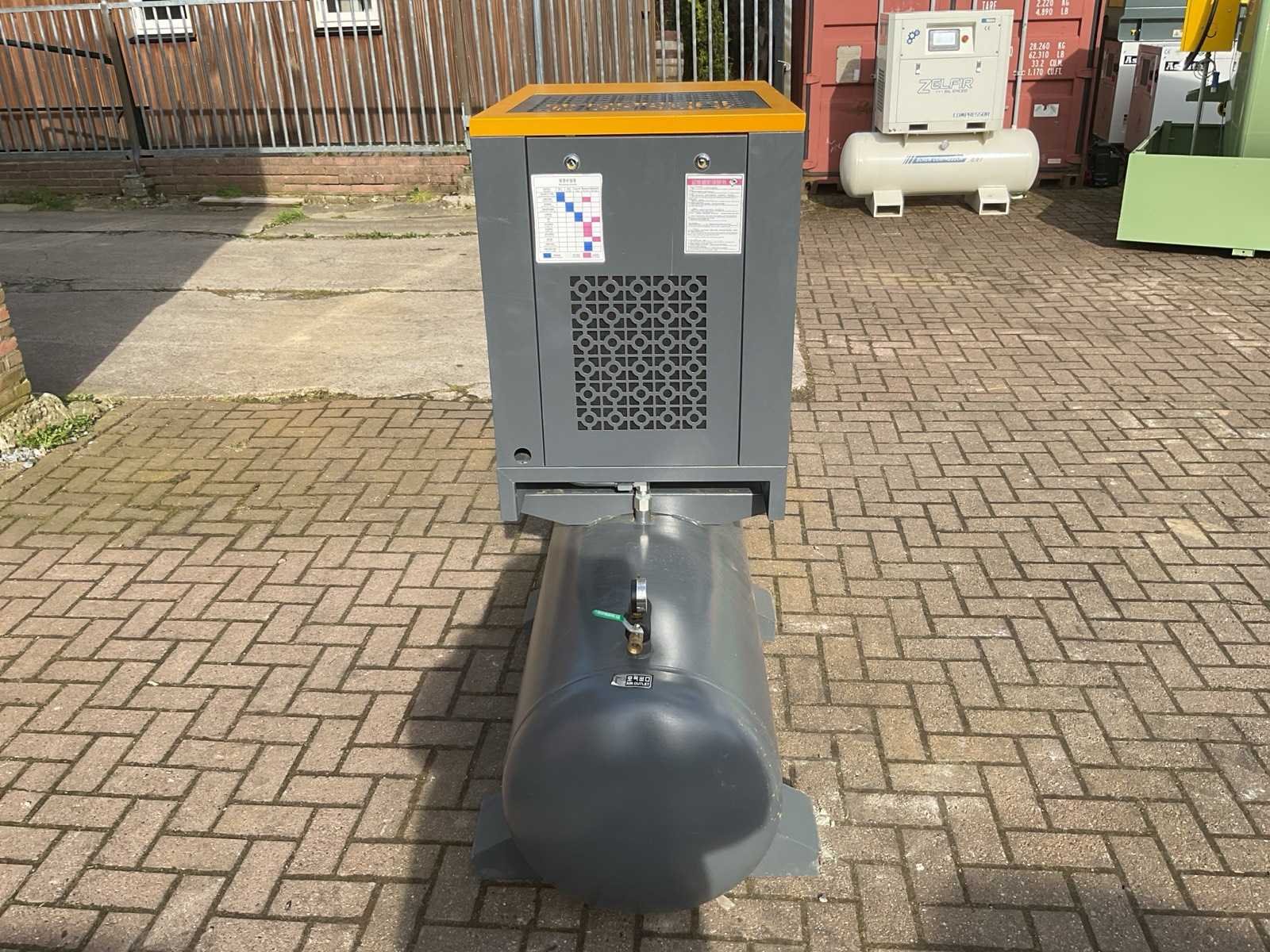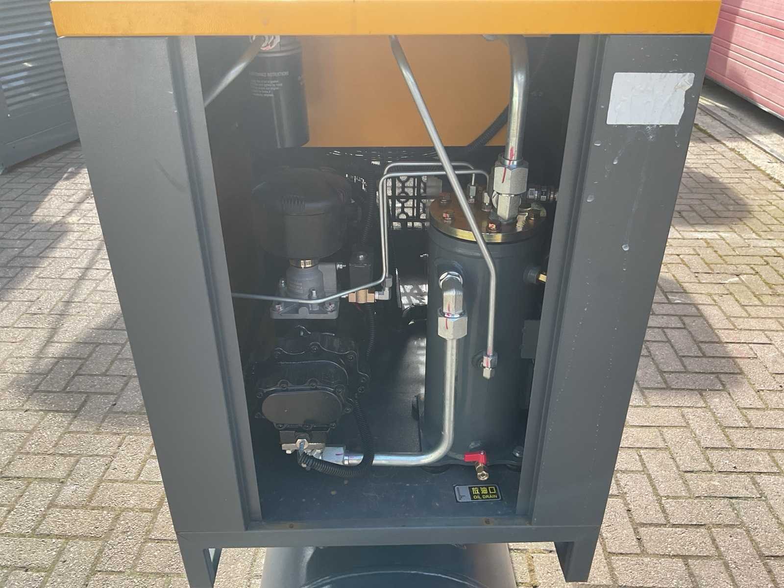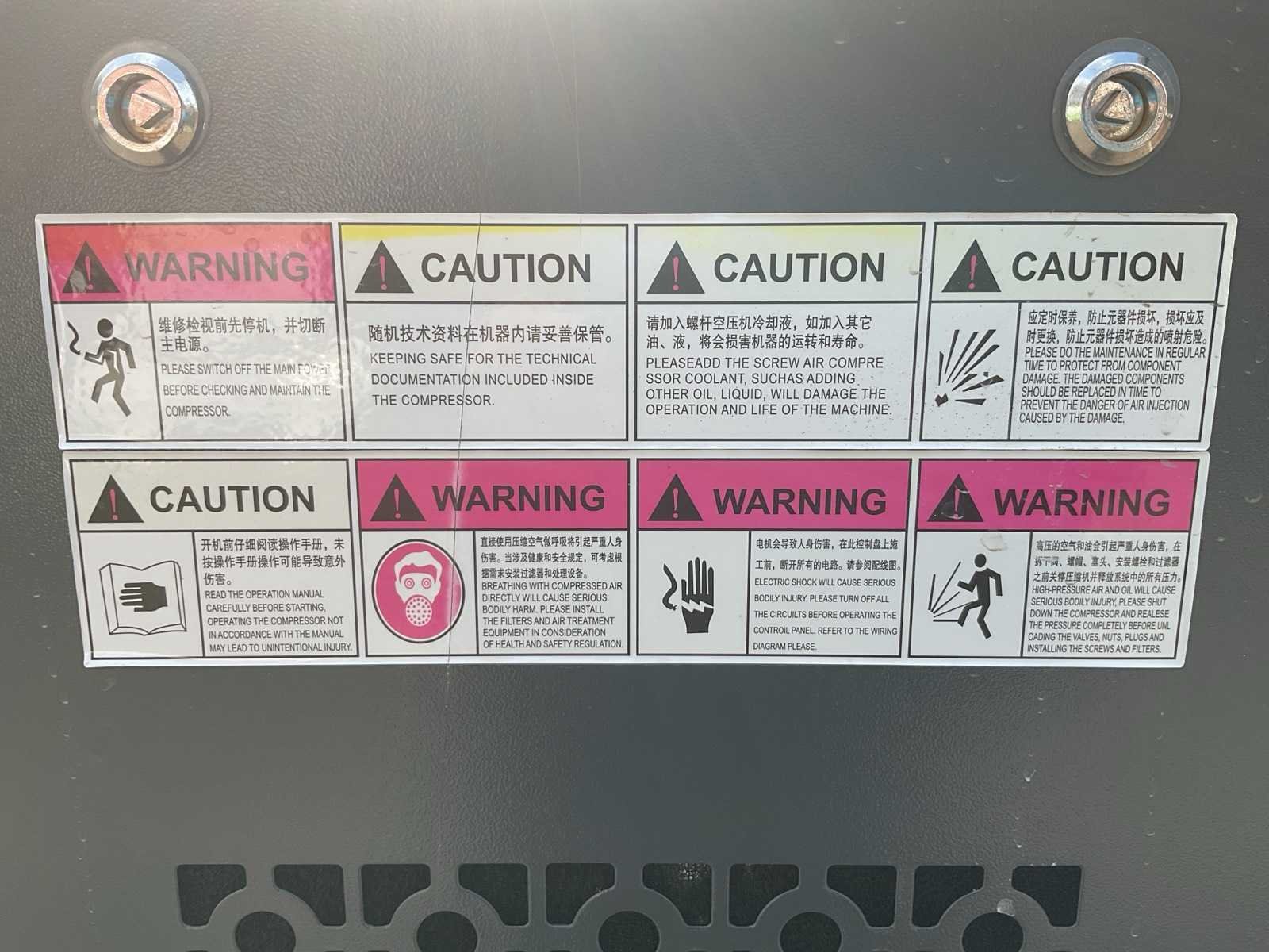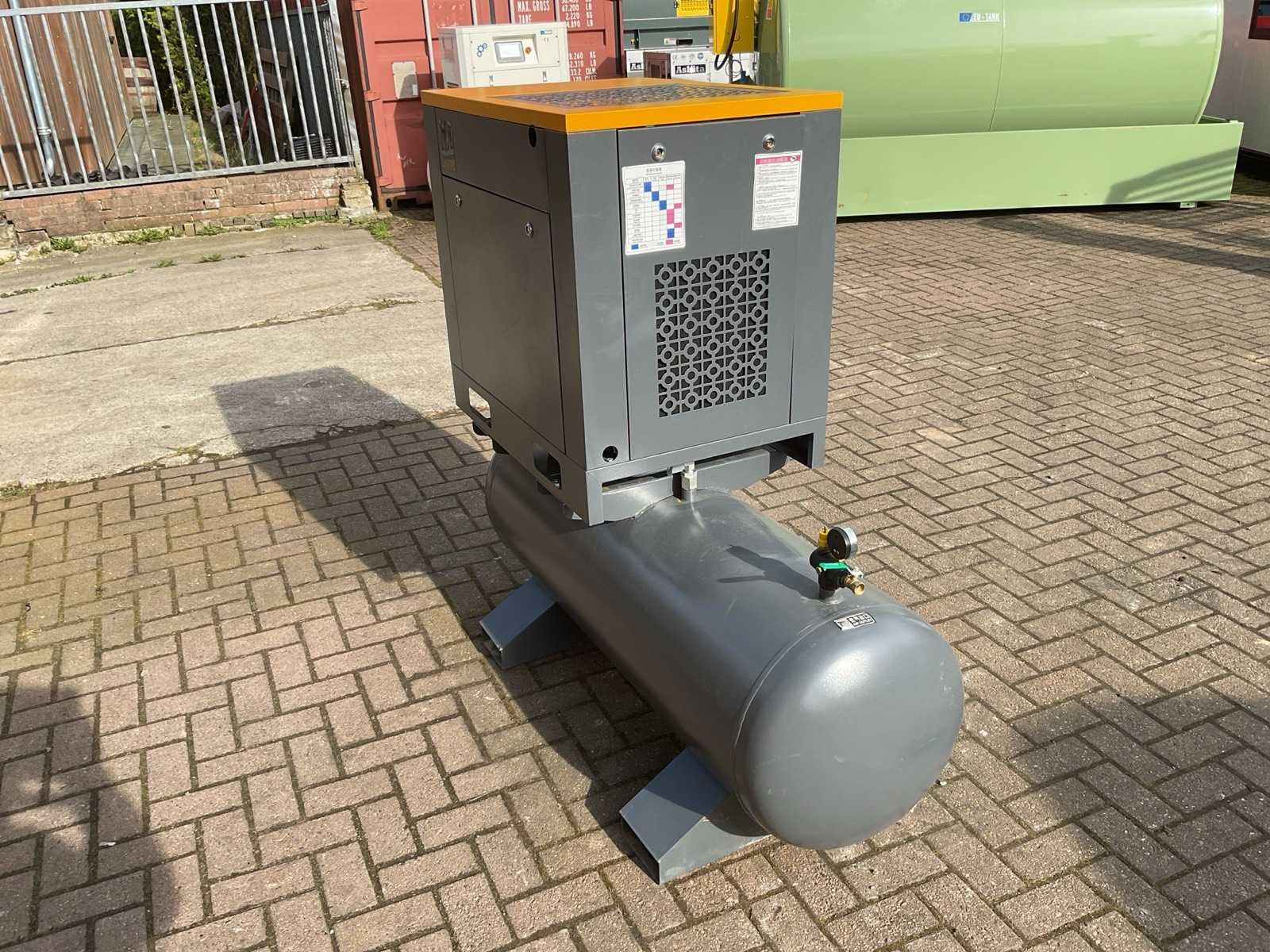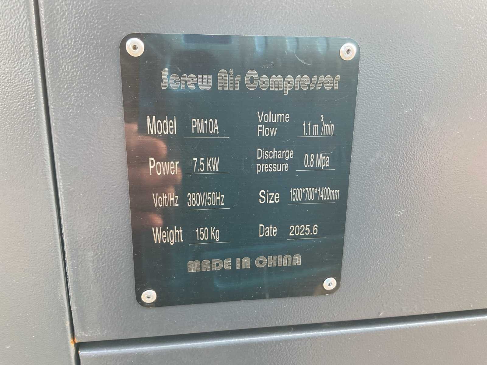 Voorzien van Motorvermogen: 7.5 kW (≈ 10 HP); Voeding: 380 V; Frequentie: 50 Hz; Fasen: 3-fase elektromotor; Luchtcapaciteit (Volume flow): 1.1 m³/min; Werkdruk: 0.8 MPa (≈ 8 bar); Afmetingen: 1500 × 700 × 1400 mm; Gewicht: 150 kg; Olie-geïnjecteerde rotary screw compressor; Geluidsarme behuizing Merk: Screw Air Compressor Type: PM10A