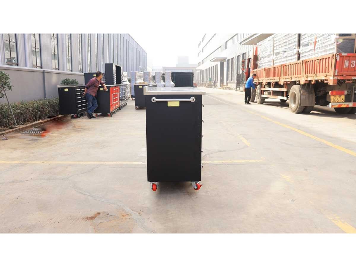 Voorzien van Gepoedercoat staal met RVS lades; 10 lades; Ongebruikt (Transportafmeting 1720x660x970mm) Merk: Rhino-Cross-Workbench Type: 7ft-20D-01C RVS Aantal laden: 28