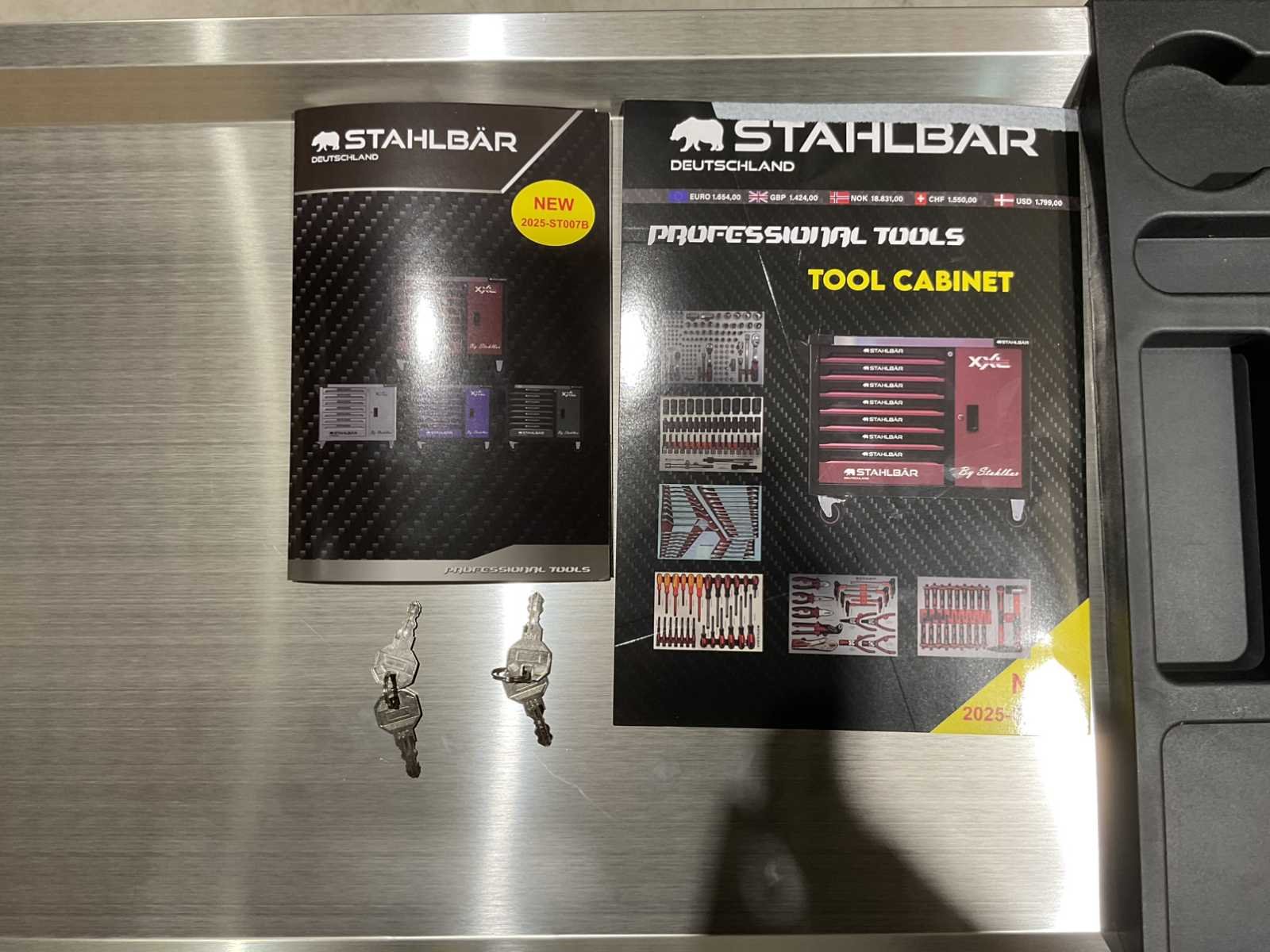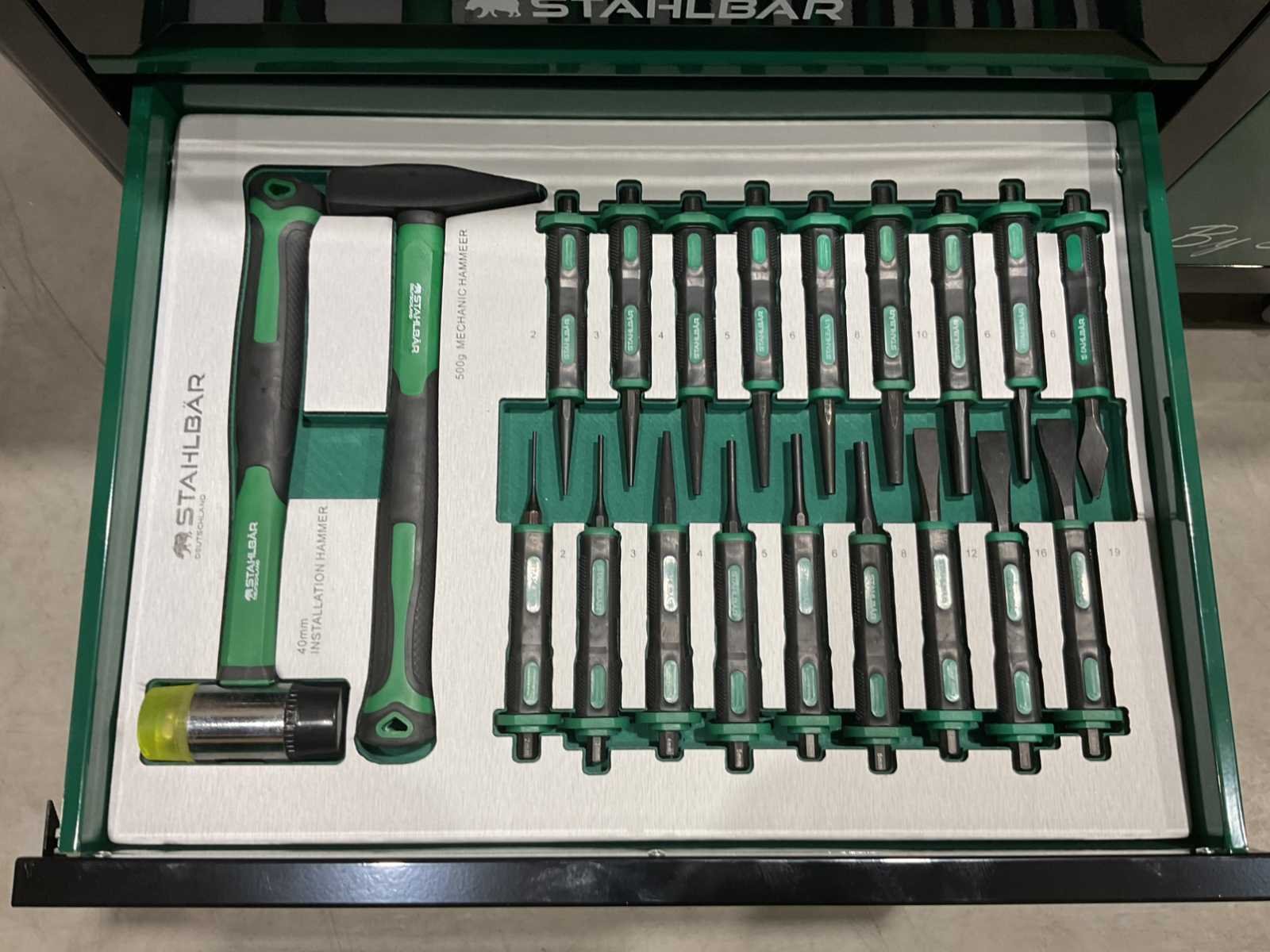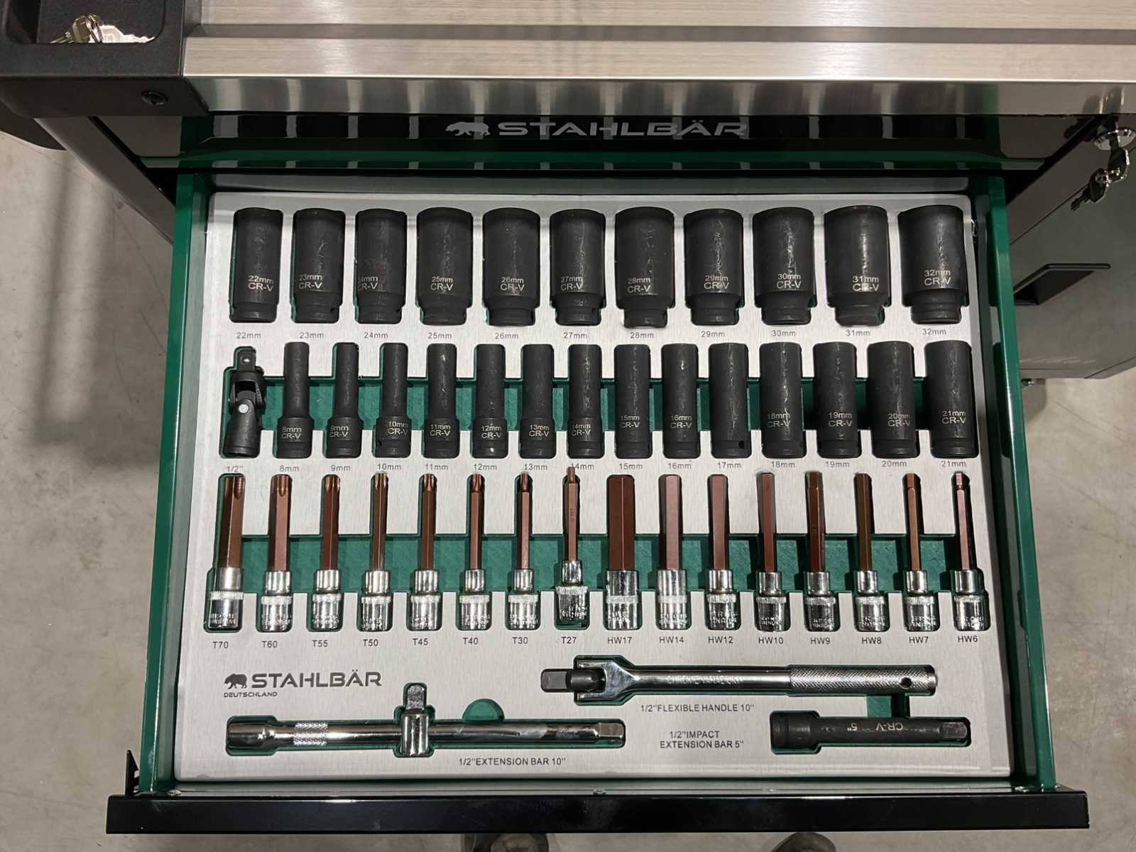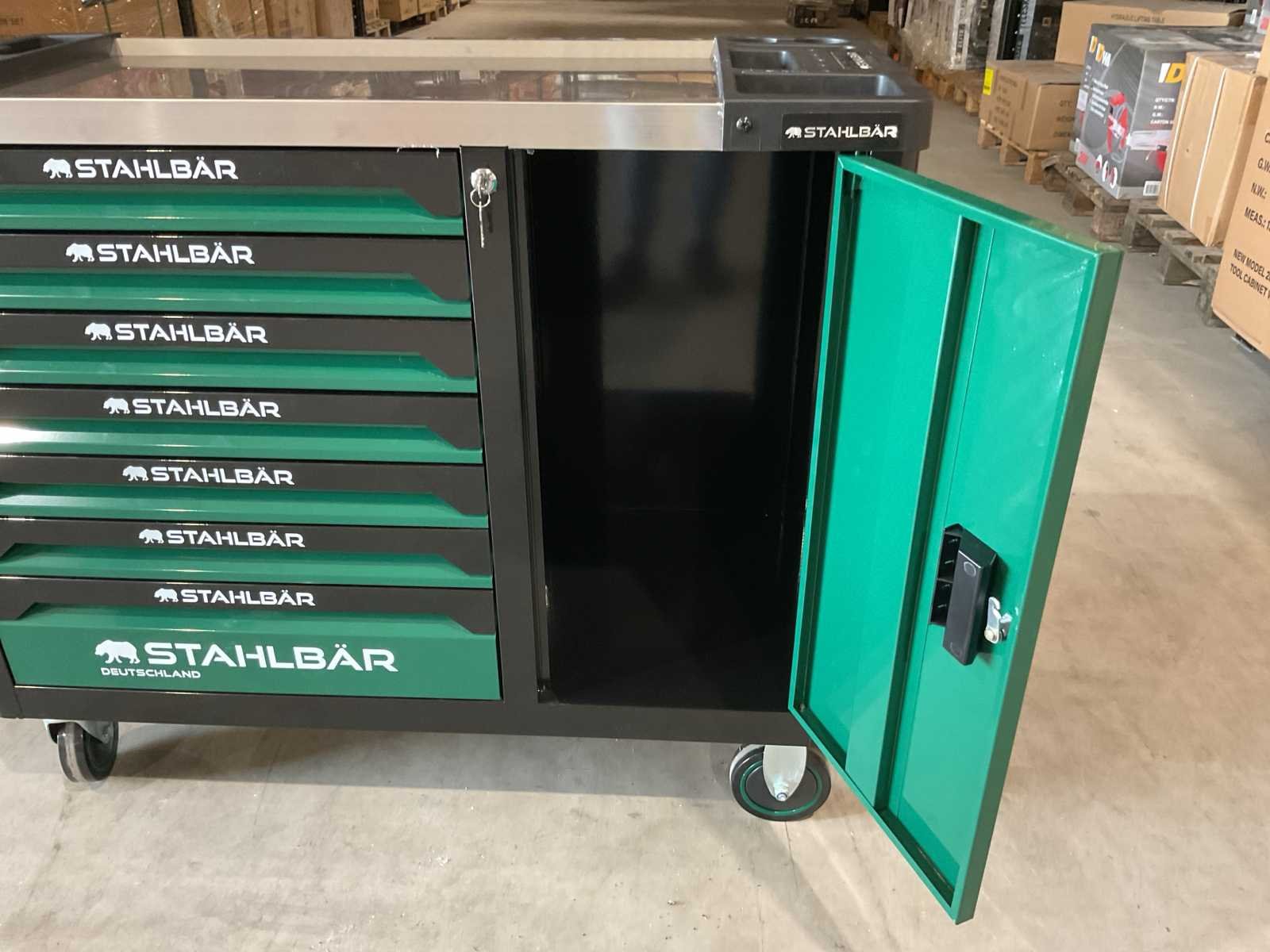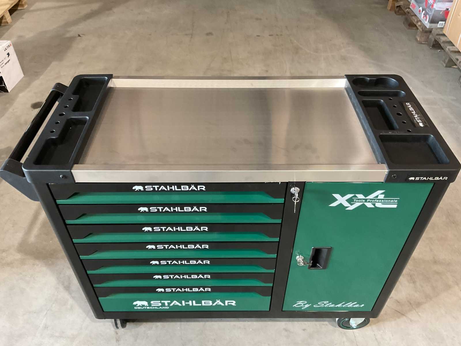Voorzien van 7 lades waarvan 7 gevuld met gereedschap; zijdeur; professioneel chroom-vanadium gereedschap; heavy duty gereedschapswagen; 4 wielen; stevig handvat; ongebruikt in doos (transport afmetingen 110x50x80 cm) Merk: Stahlbär Type: Deutschland jumbo Bouwjaar: 2025 Aantal laden: 7 Met inhoud: true Eigen gewicht: 75kg Totale afmeting L: 1100mm Totale afmeting Breedte: 500mm Totale afmeting Hoogte: 800mm