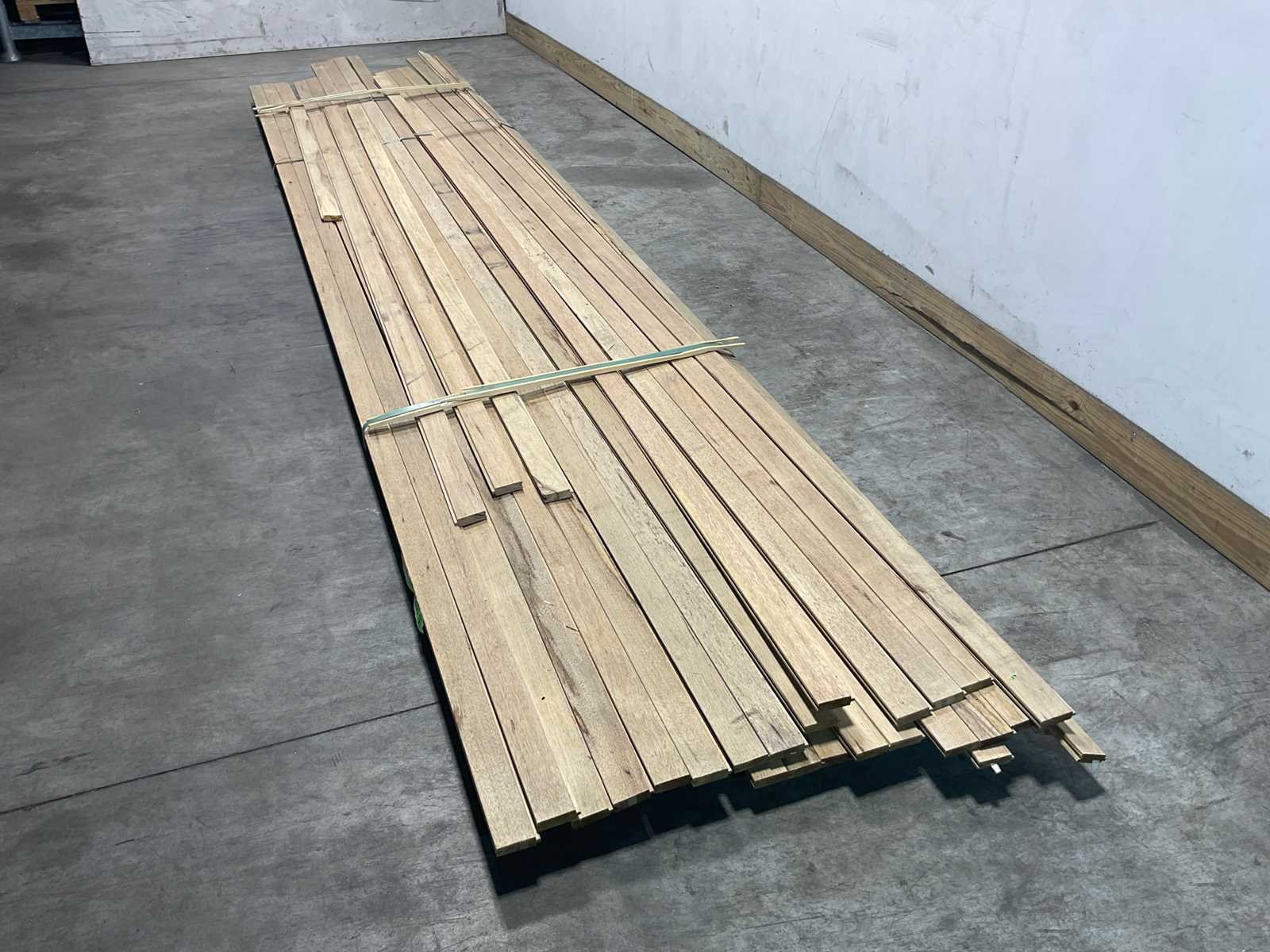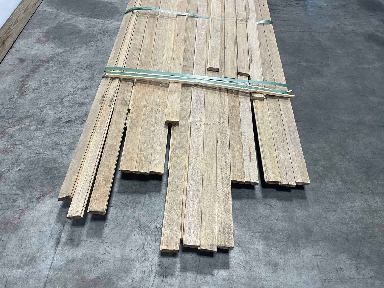 Mix partij diverse wit Afrikaans eikenhouten planken fraké mes & groef, diverse lengtes van 330 tot 520 cm x 6,5 breed x 2 cm dik. Zie foto's voor details. Model: Plank Materiaal: Fraké