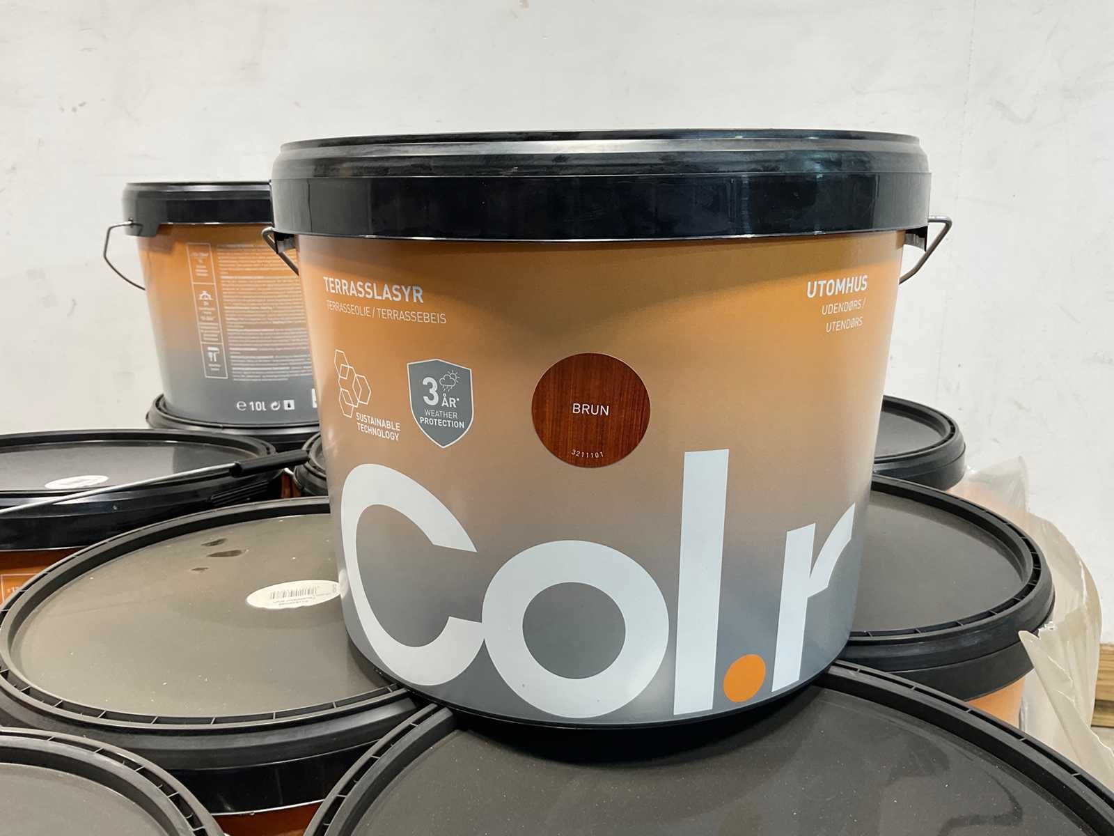 Pallet Col.r tuinbeits - Bruin - 240 liter. Bestaat uit pallet met 24 emmers tuinbeits a 10 liter. Merk: Col.r Kleur: Bruin Type: Tuinbeits