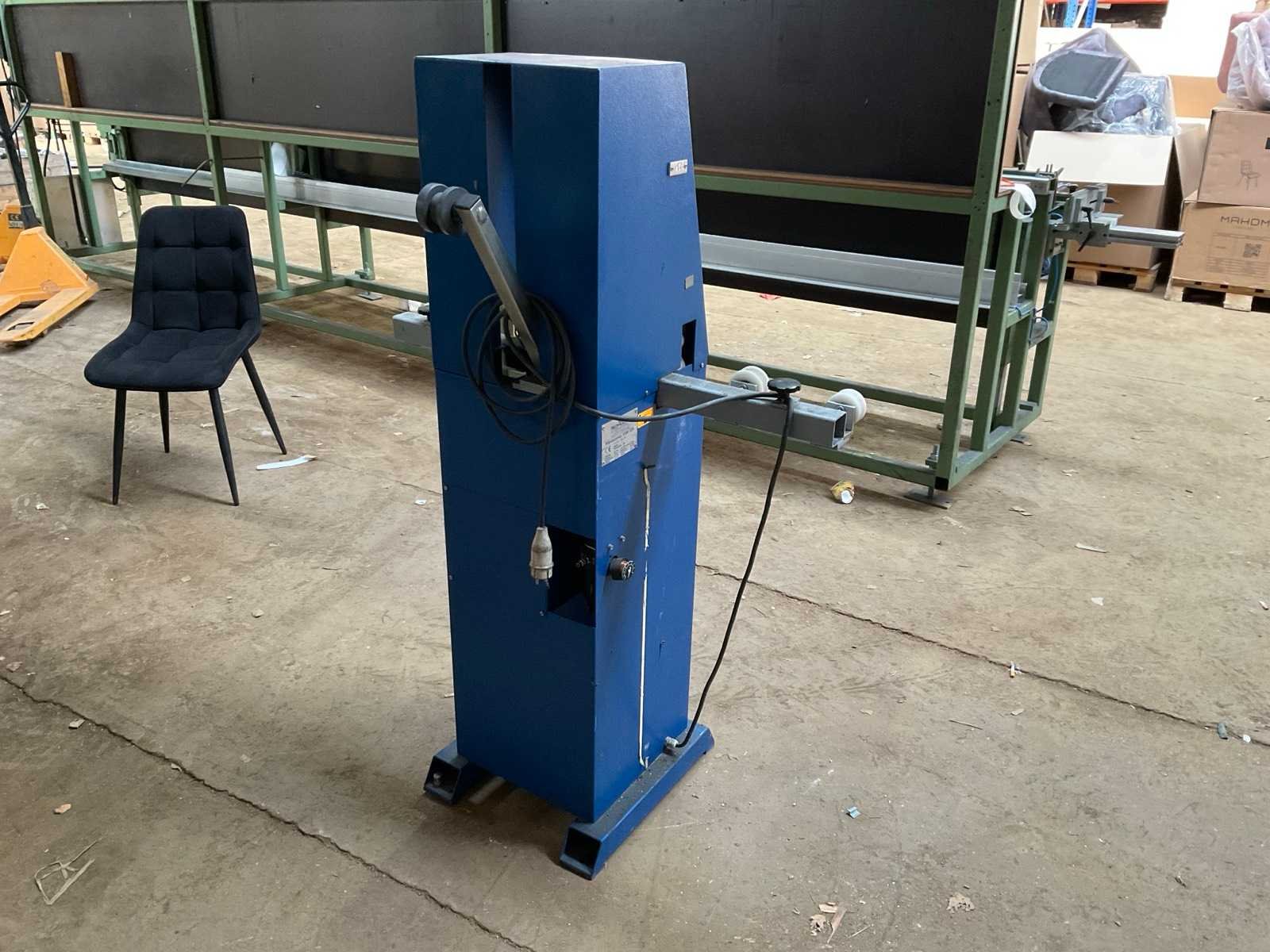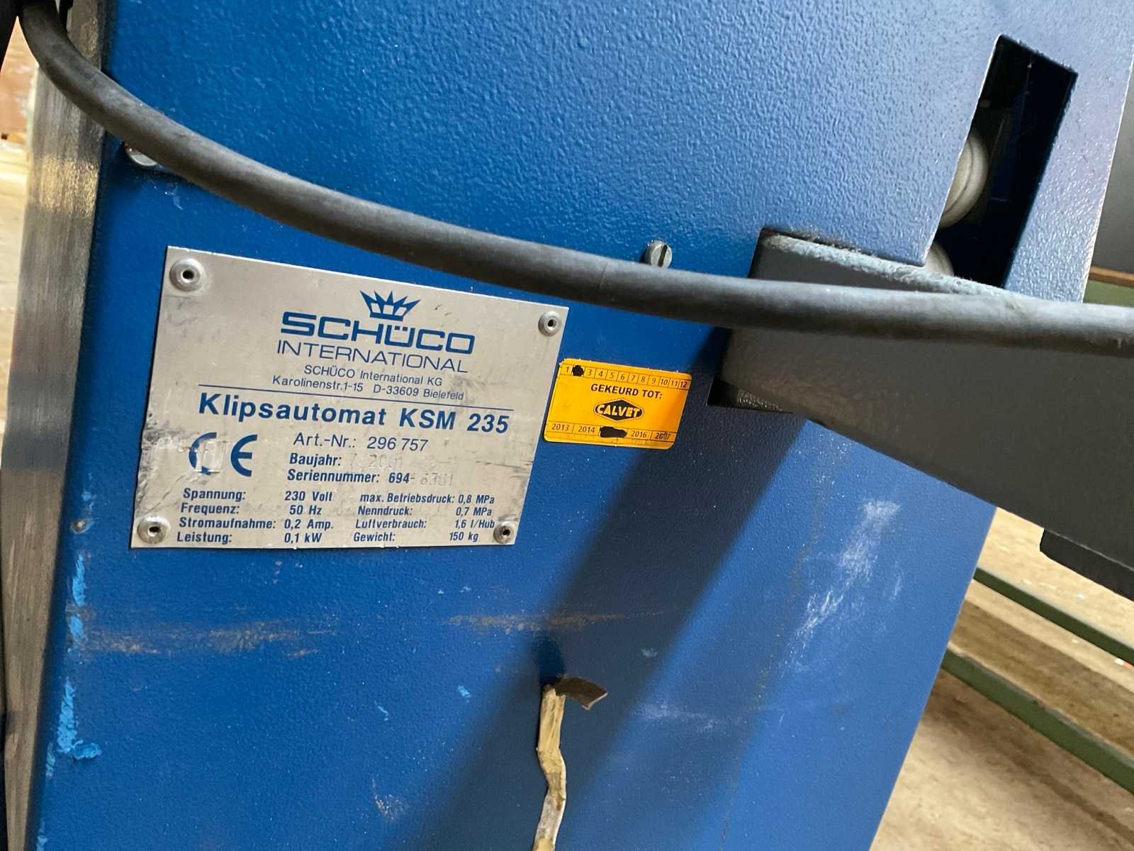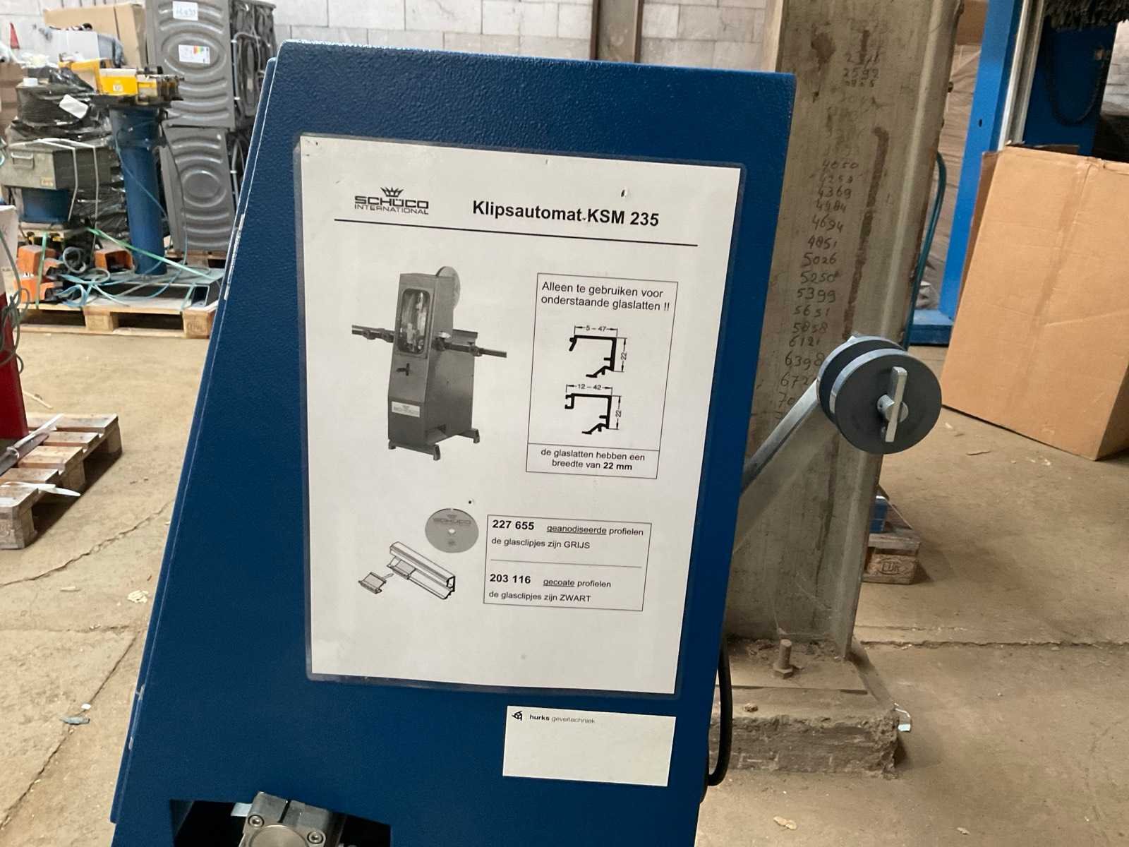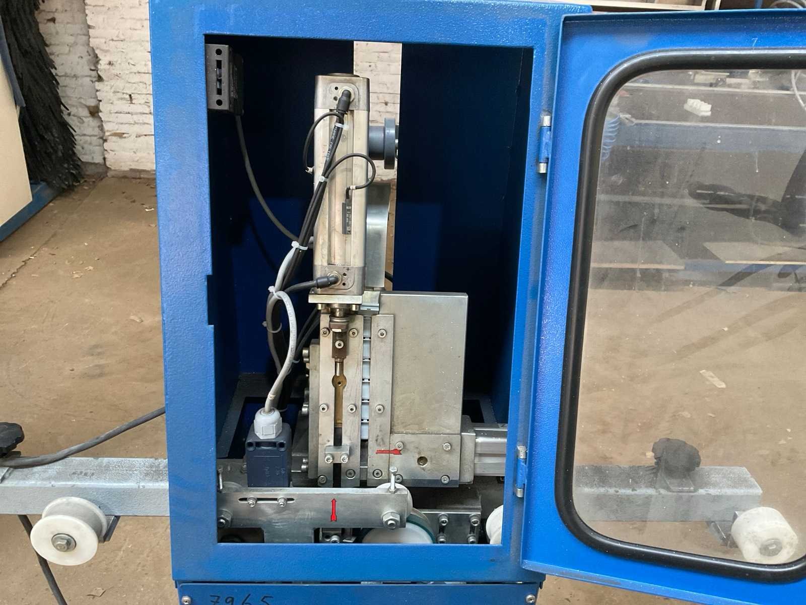 Pneumatische klipsautomat voor aluminium glaslatten en glasclips Werkdruk 0,8mpa Luchtverbruik 1,6l/hub Merk: Schüco Type: KSM 235 Bouwjaar: 2001 Serienummer: 694-c551 Slag: 30mm Aansluiting: 230V Machinegewicht: 150kg Afmeting l: 880mm Afmeting b: 1200mm Afmeting h: 1470mm
