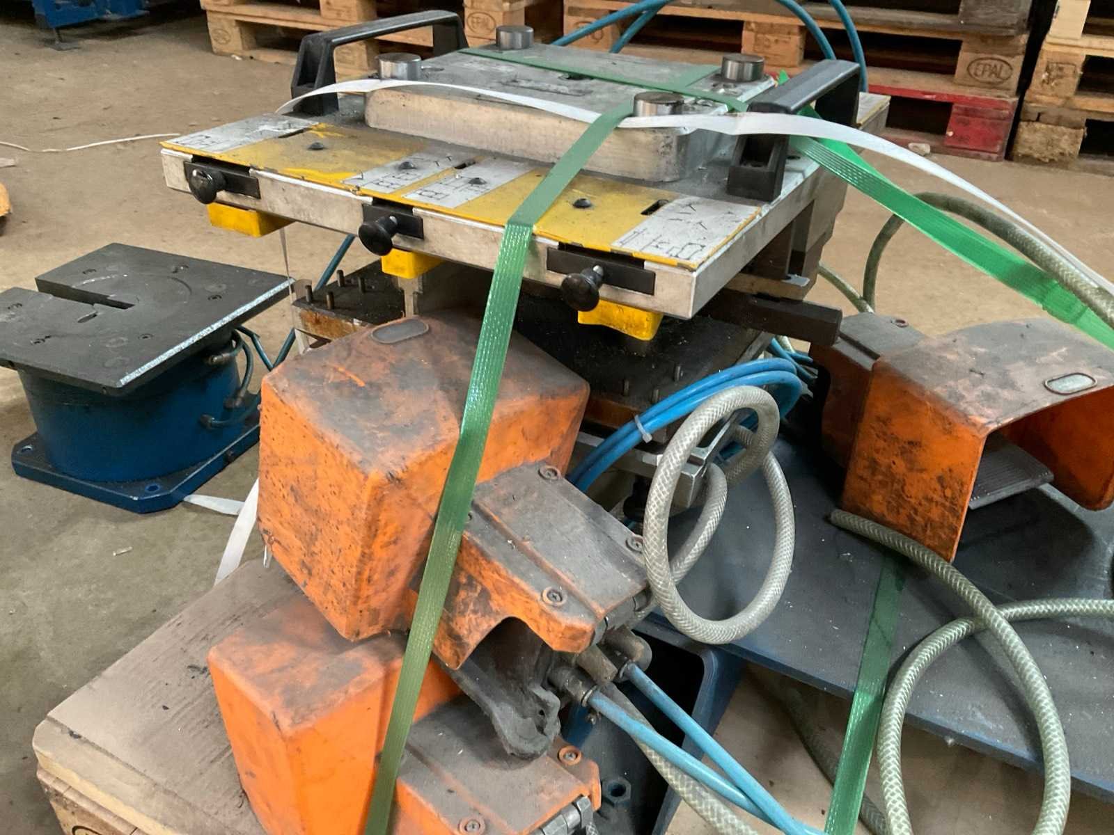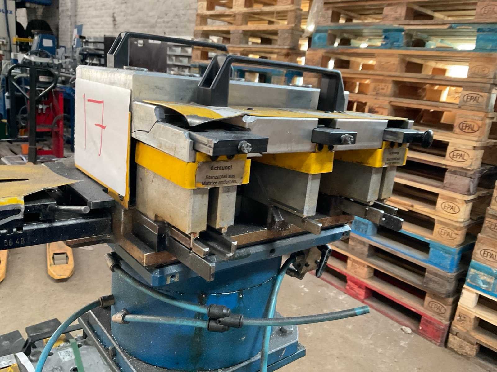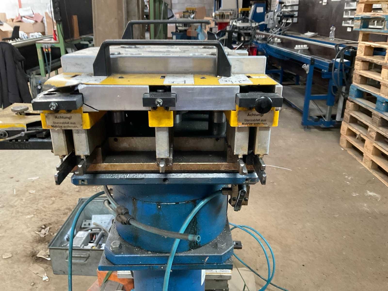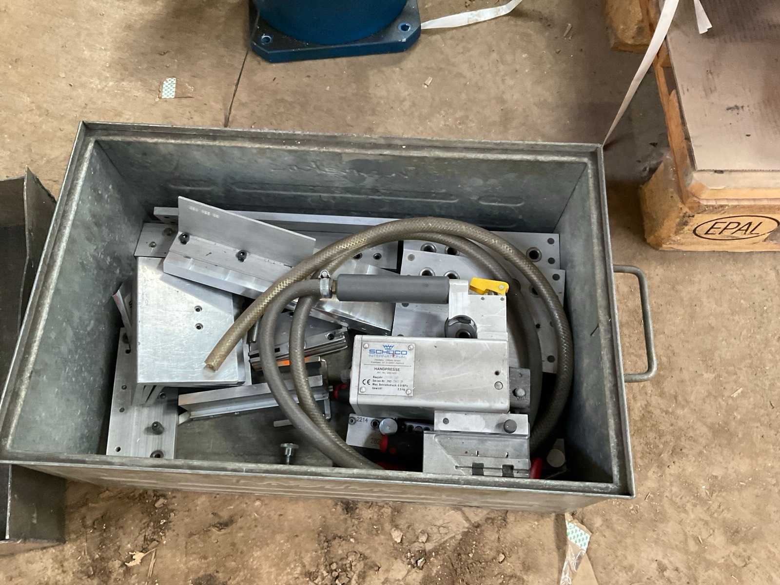 Incl diverse persgereedschappen en 3x voetbediening pneumatische aansluitingen aluminium profiel mallen gereedschap metalen bak. Voor aluminium raam en deurprofielen hoekverbindingen Merk: Schüco Type: Basispresse Bouwjaar: 2004 Serienummer: 792-484 Slag: 20mm
