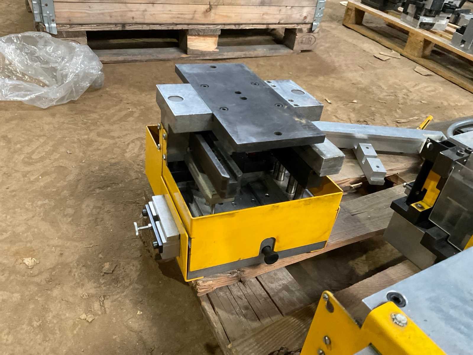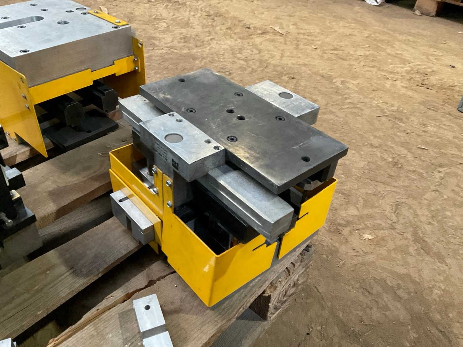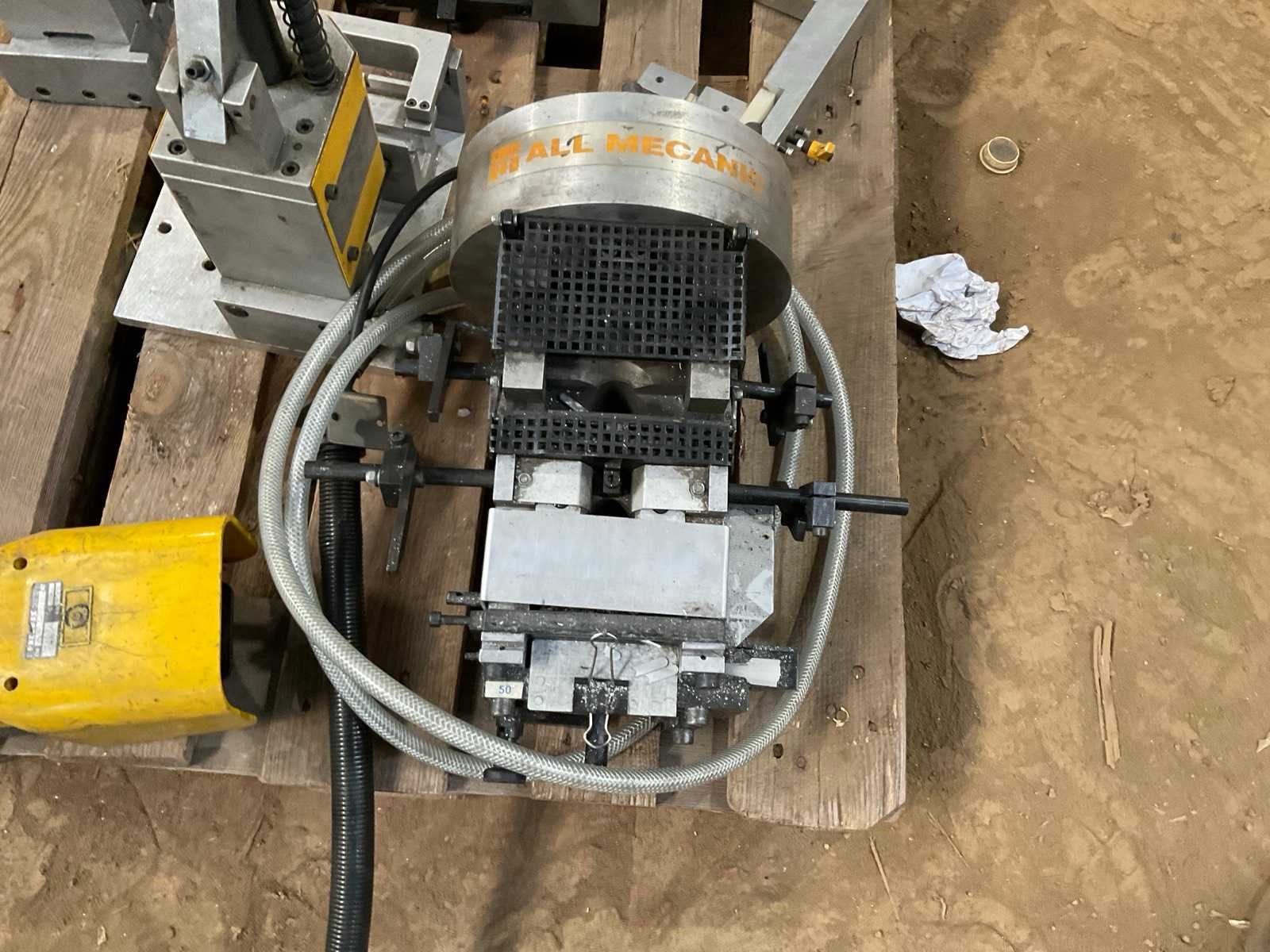 Complete opspan- en positioneerunit voor aluminium profielbewerking, bestaande uit meerdere All Mecanic modules gemonteerd op een basisframe. Het systeem is voorzien van verstelbare opspanblokken, lineaire geleidingen en een Hurks handverstelmechanisme voor nauwkeurige positionering van profielen. De installatie bevat diverse aluminium en stalen opspanmodules, positioneerblokken en een centrale aandrijfunit. Het systeem werd gebruikt voor het positioneren en bewerken van aluminium profielen binnen een industriële productieomgeving. Inclusief meerdere All Mecanic opspanmodules en stations, handverstelmechanisme, lineaire rails en montageframe. Merk: All Mecanic Locatie fabrikant: Antwerpen (België) Bouwjaren modules: ca. 2007 – 2008 Staat: gebruikt, afkomstig uit productieomgeving. Belangrijke kenmerken merk: All Mecanic aluminium profiel positioneersysteem meerdere opspanmodules Hurks handverstelling industriële tooling gemonteerd op pallet