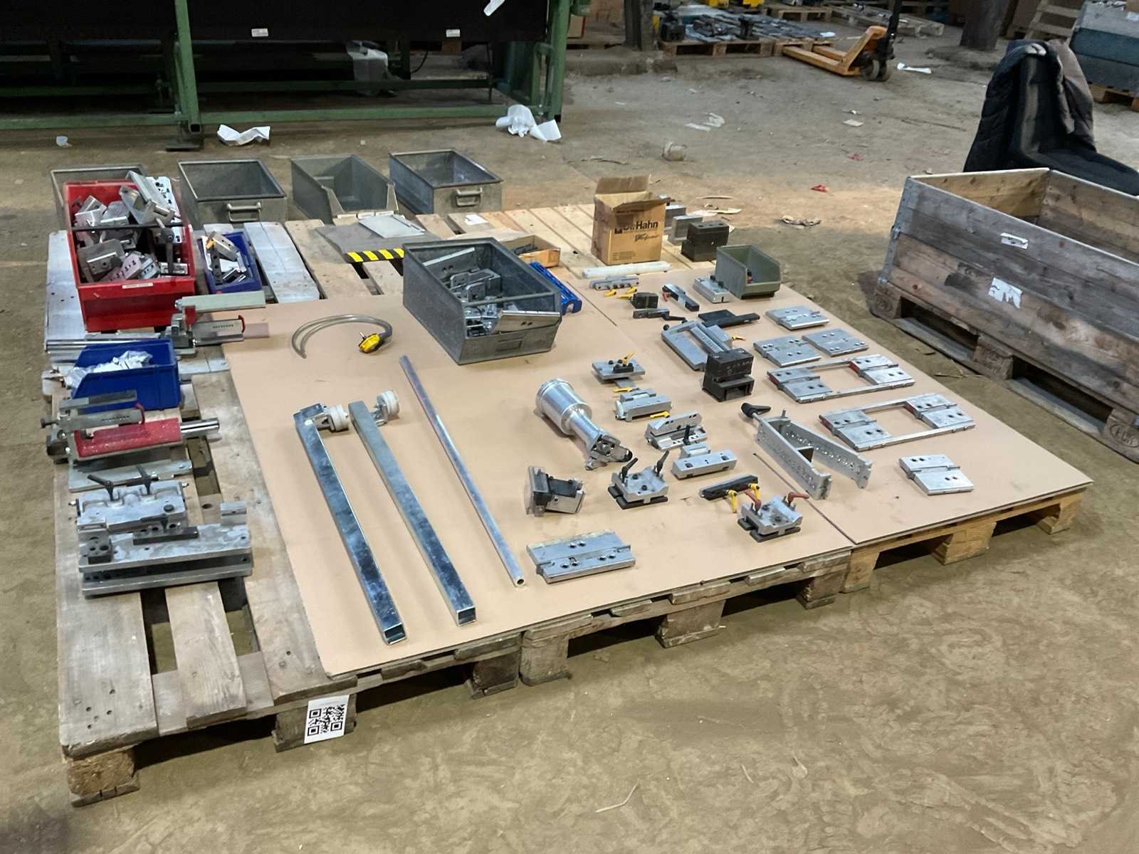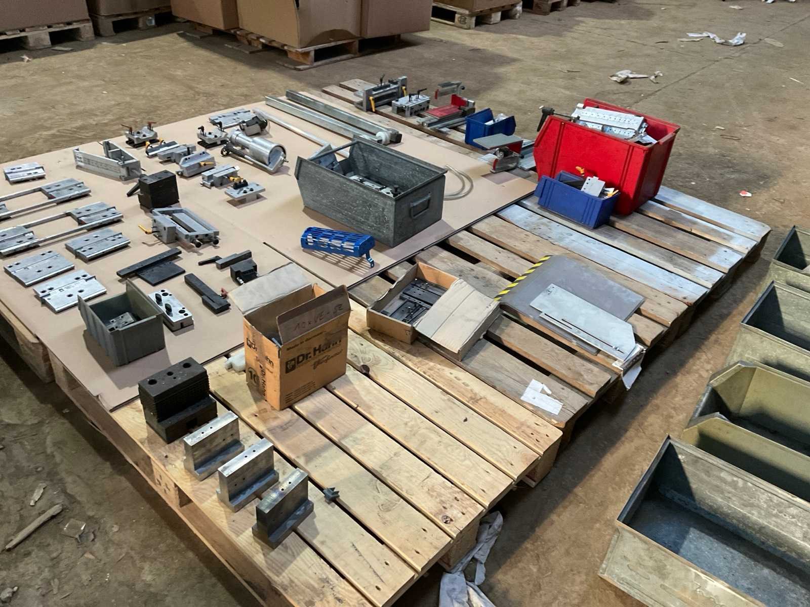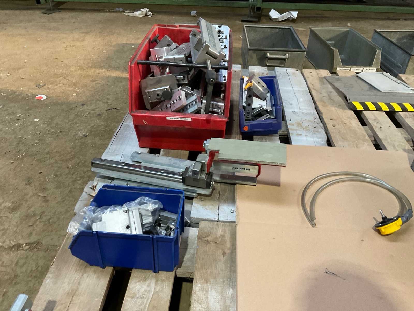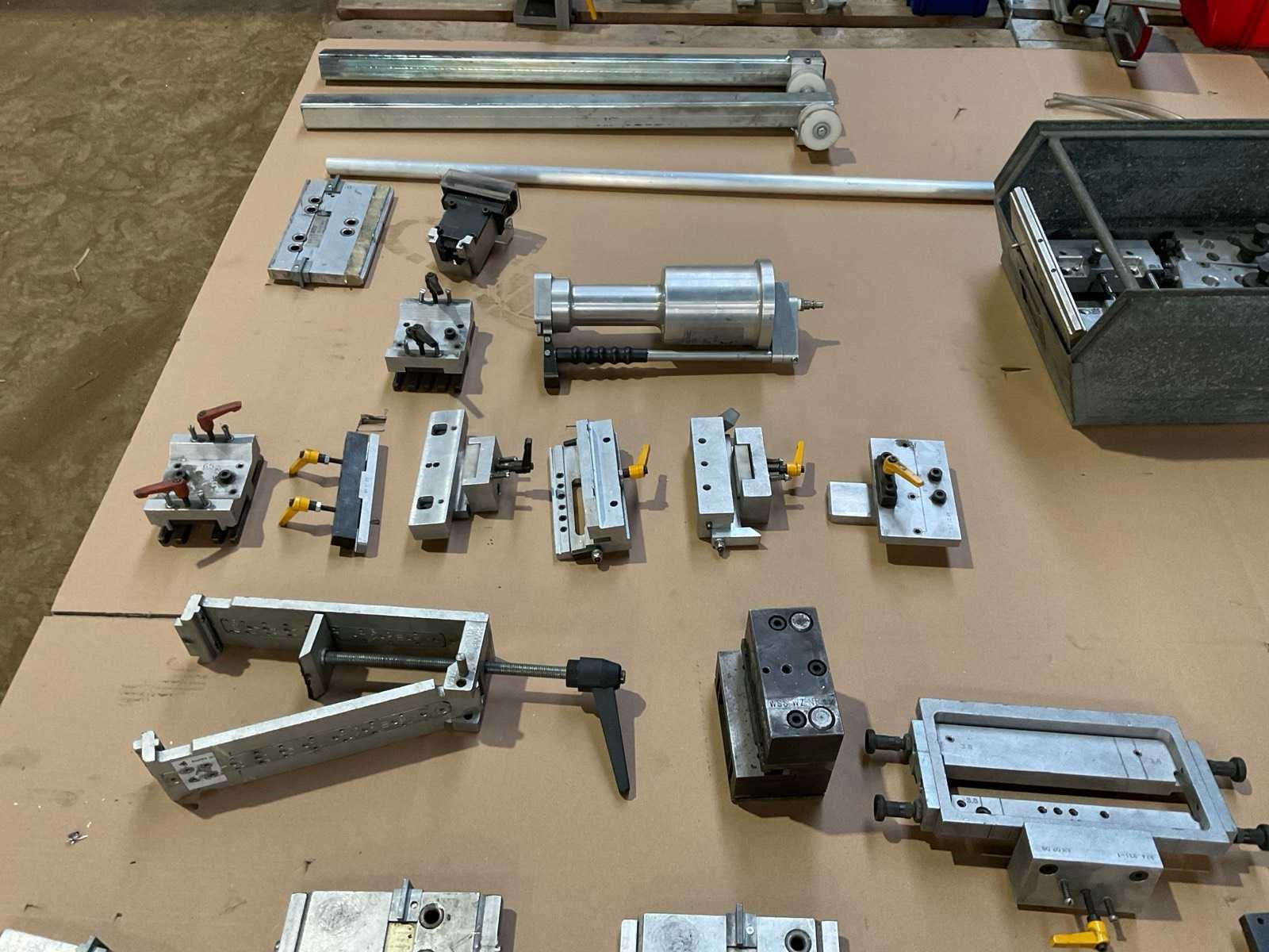 Gemengde partij gereedschappen voor aluminium profielbewerking. Bevat o.a. ponsblokken, opspanframes, pneumatische units, geleiders en diverse tooling. Geschikt voor aluminium raam- en profielbewerking.