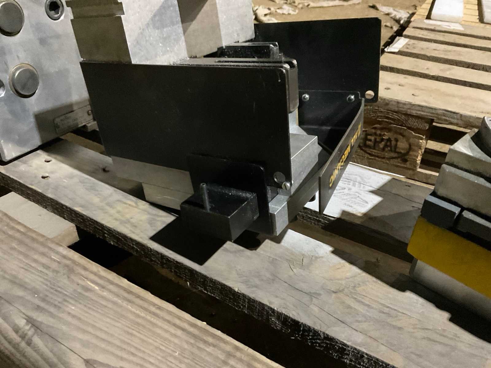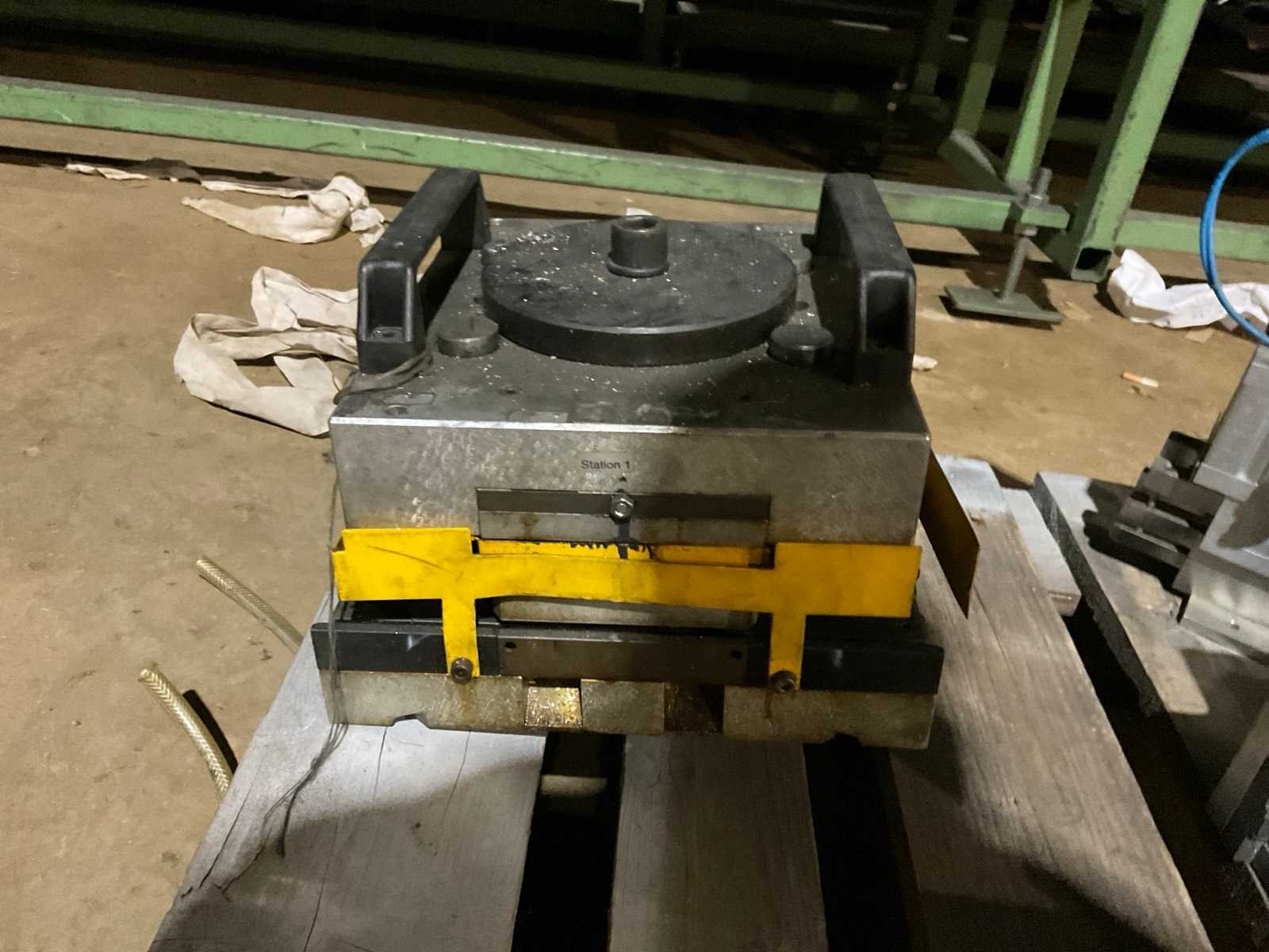 1. Draai-/positioneerstation Massief aluminium positioneerstation met rond draaiplateau voor het positioneren van aluminium profielen tijdens bewerking. Voorzien van handgrepen en opspanmogelijkheden. 2. Profielklem / geleidingsunit Aluminium klemstation met verstelbare profielgeleiders voor het nauwkeurig positioneren en fixeren van aluminium raam- en deurprofielen tijdens pons- of bewerkingsprocessen. 3. Rolgeleidingstation Bewerkingsunit met rolgeleiding en veermechanisme voor het soepel doorvoeren en positioneren van aluminium profielen tijdens productie. 4. Pneumatische klemunit Compacte pneumatische klem met handgreep en luchtaansluitingen voor het fixeren van aluminium profielen in een bewerkingslijn. 5. Pons-/bewerkingsstation Modulaire pons- of bewerkingsunit met opspanplaat voor montage van matrijzen en gereedschap voor profielbewerking.