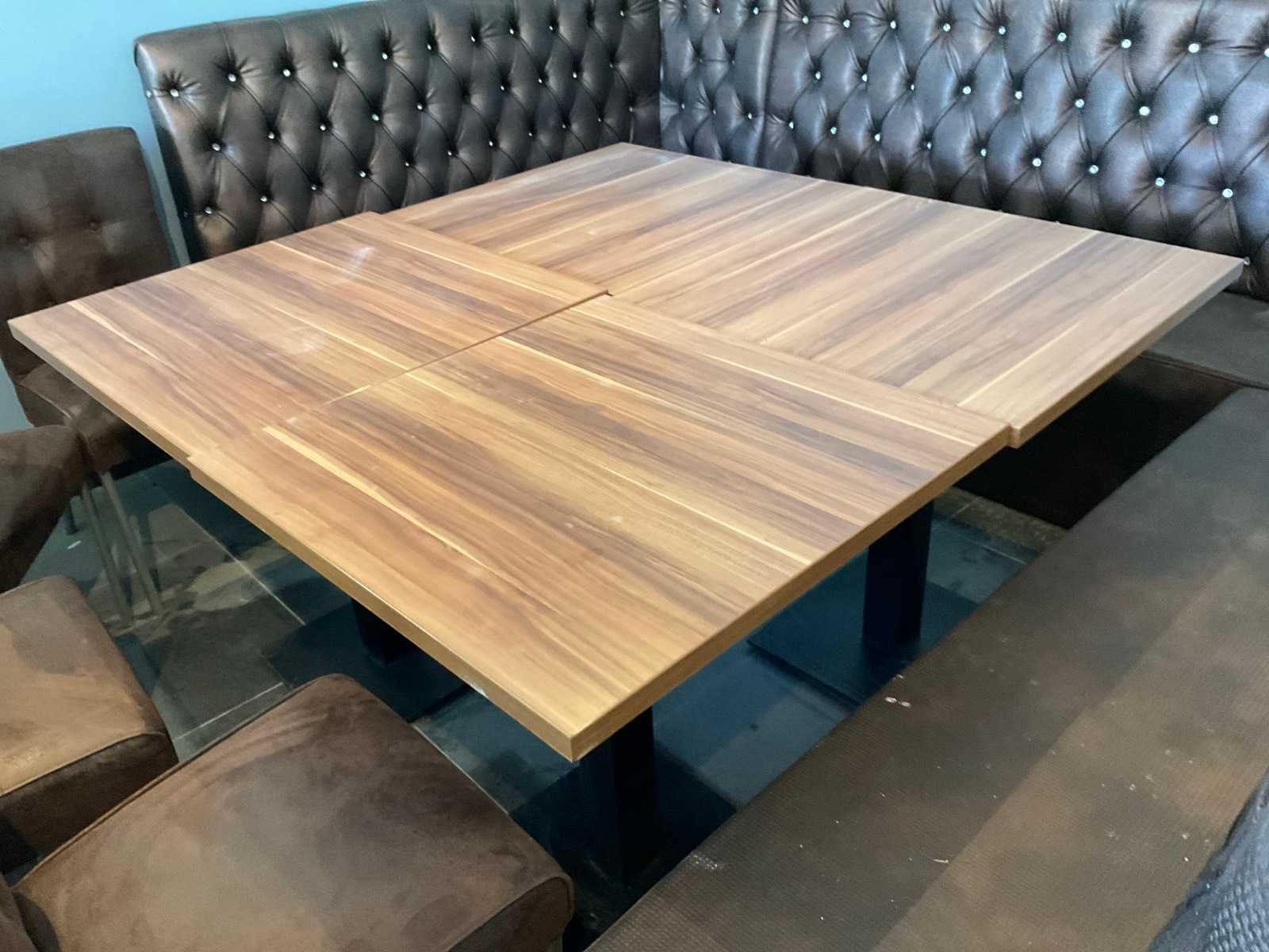 Bestaande uit: 2x hoekbank (57x170x105 cm), 2x rechte bank (57x167x105 cm), 2x rechte bank (57x170x105 cm), 1x rechte bank (57x138x105 cm), 7x tafel (70x70x74 cm, 8x stoel.