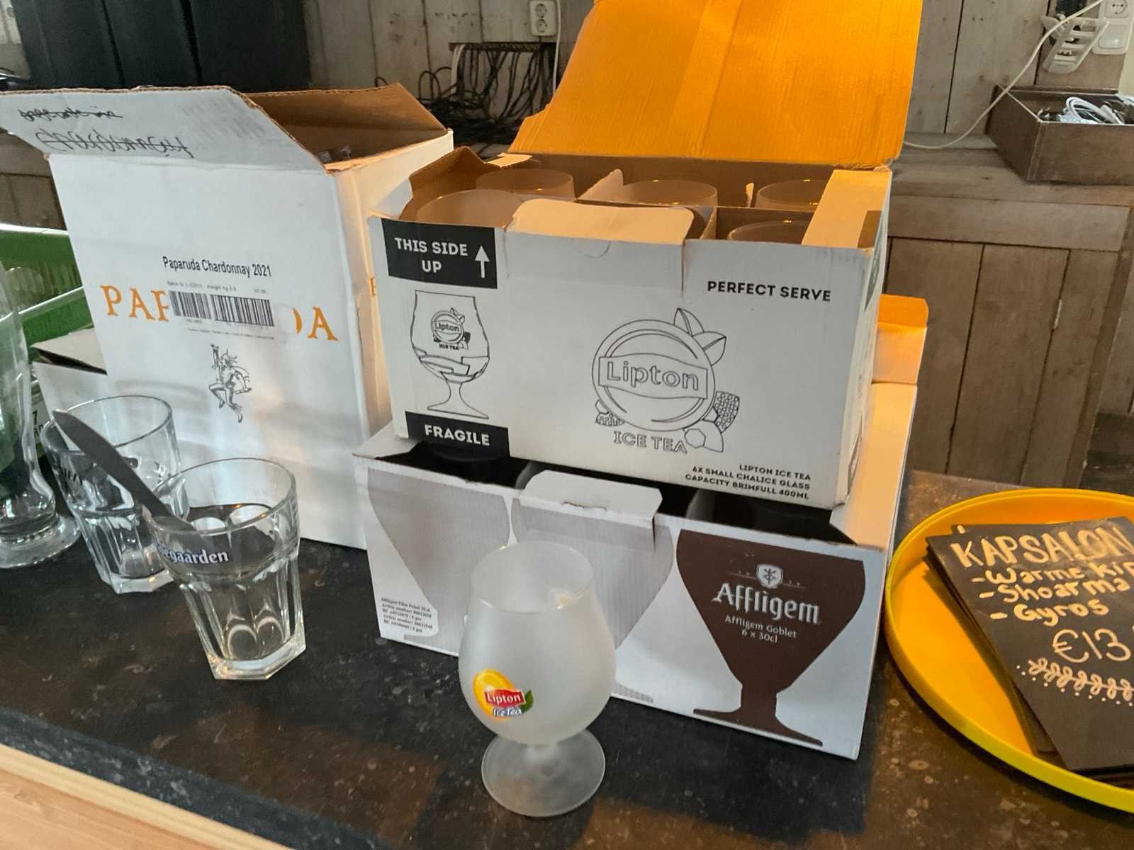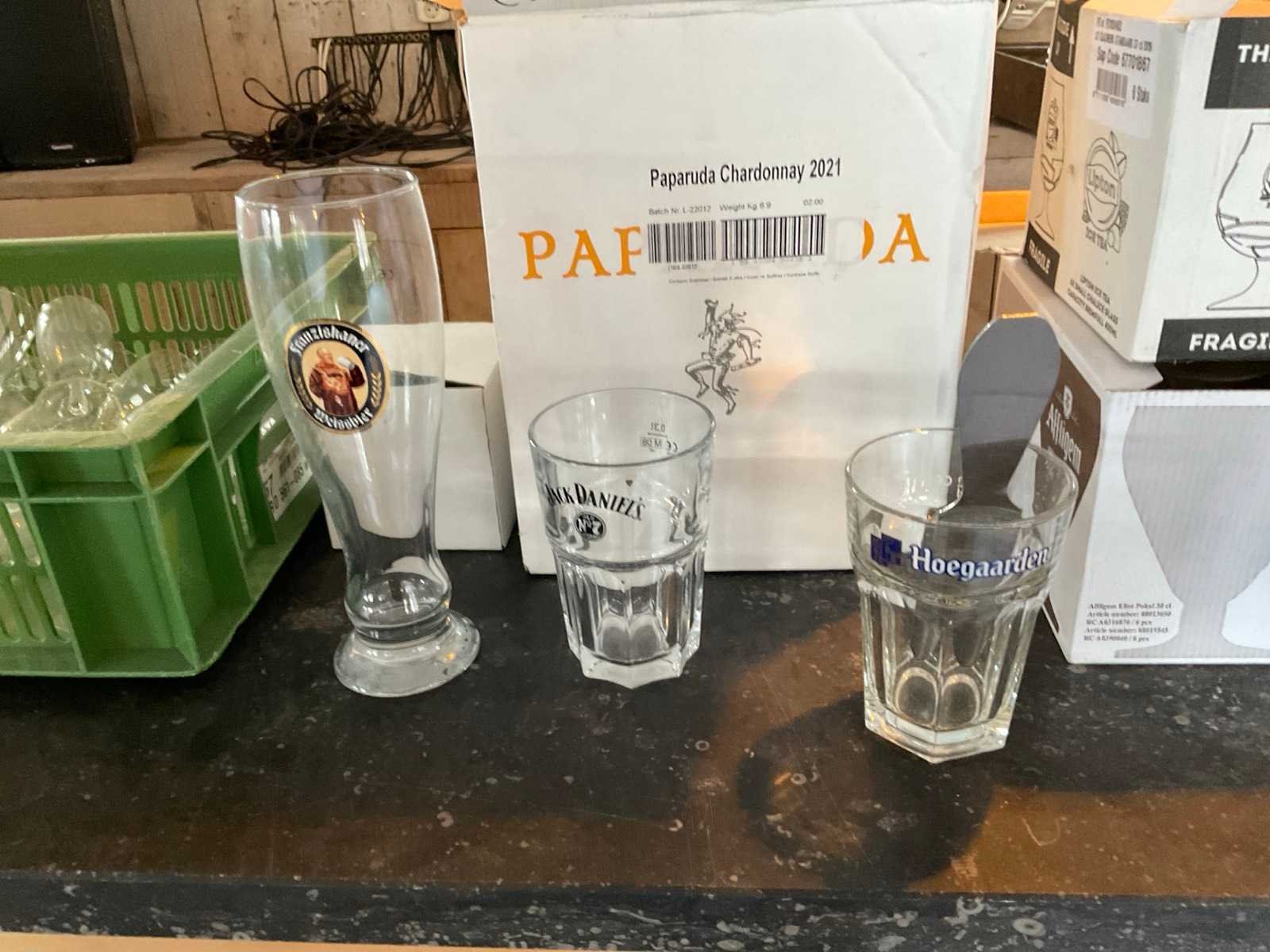 Diverse soorten en maten, inclusief kratten 1e: Lipton 2e: Limonade 3e: Wijn 4e: Bier 5e: Hertog Jan 6e: Speciaal bier