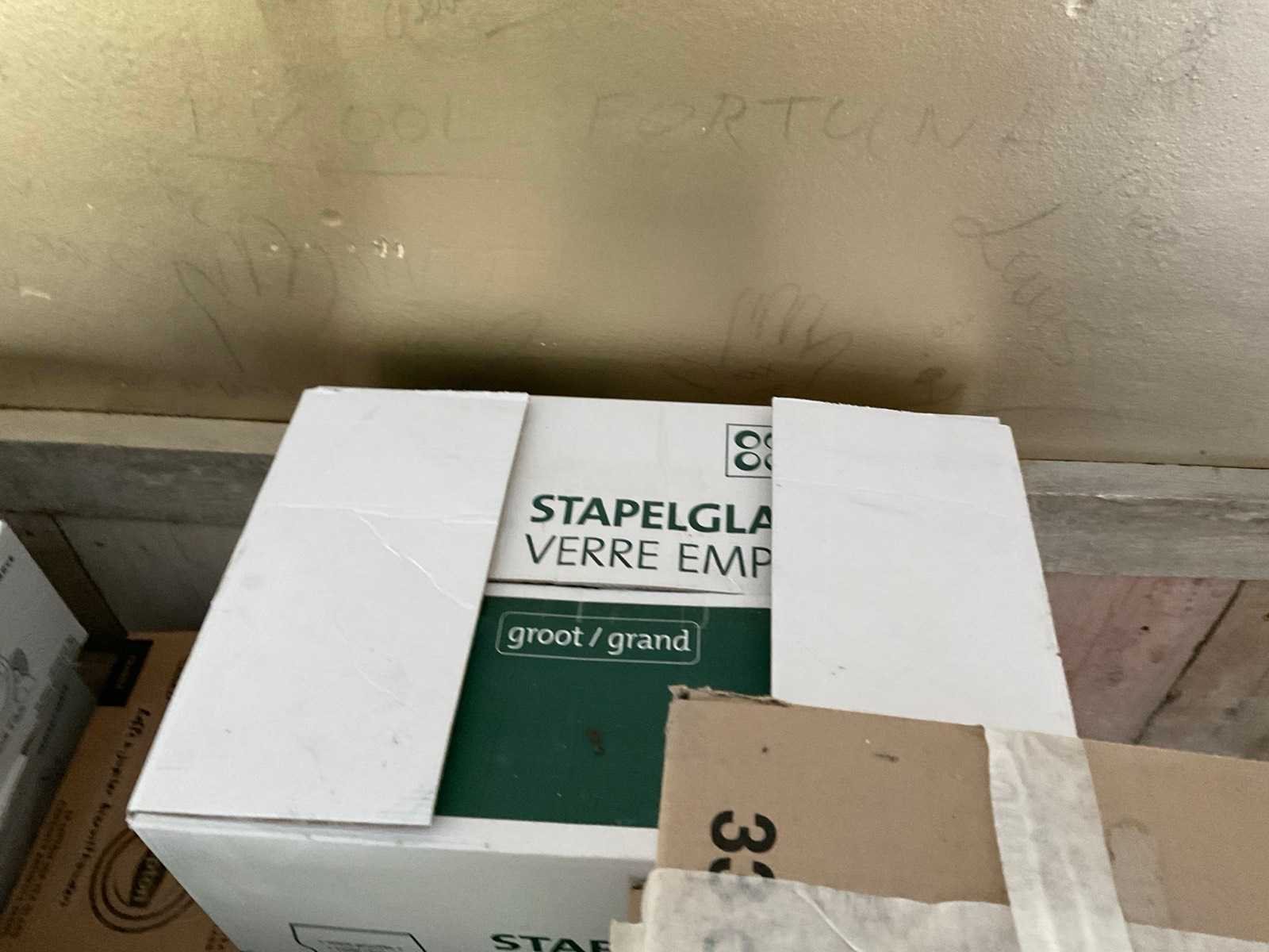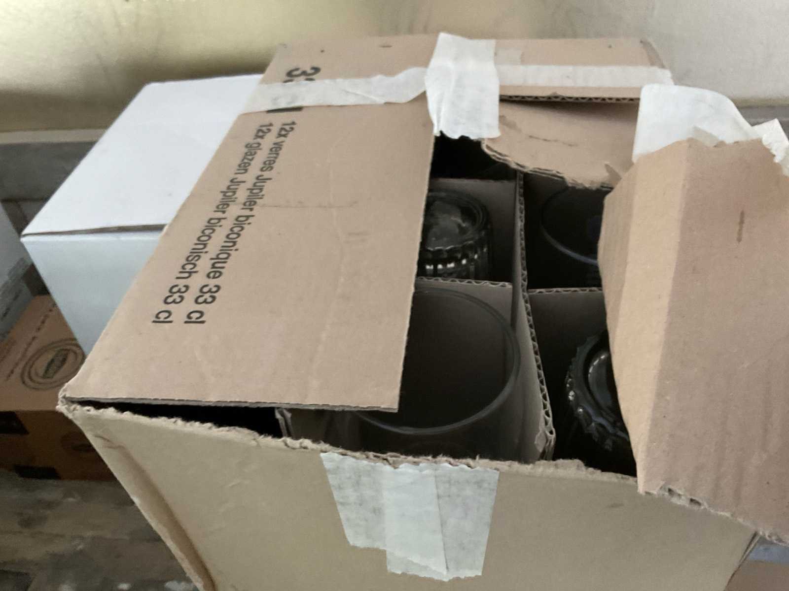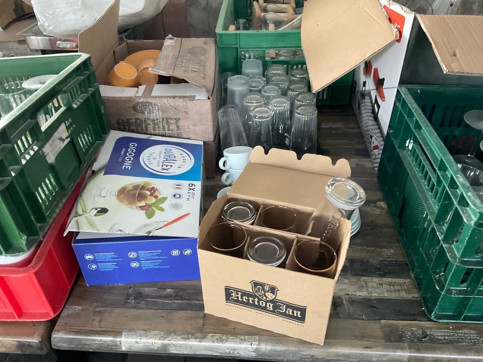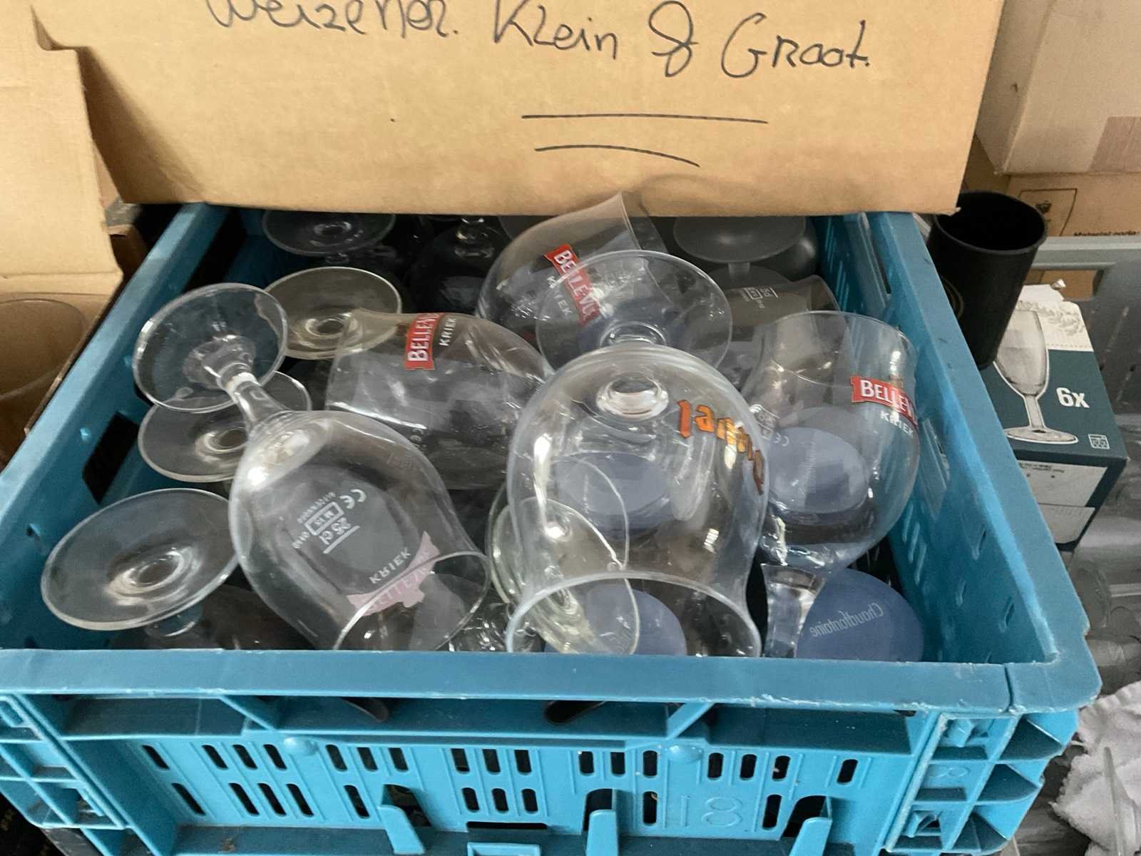 Inclusief kratten Bestaande uit: Onder andere: 1e: Glazen 2e: Belle-Vue 3e: Duvel 4e: Lipton 5e: Leffe 6e: Chocomel 7e: Borden 8e: Voedsel bakjes 9e: Gastronoom bak
