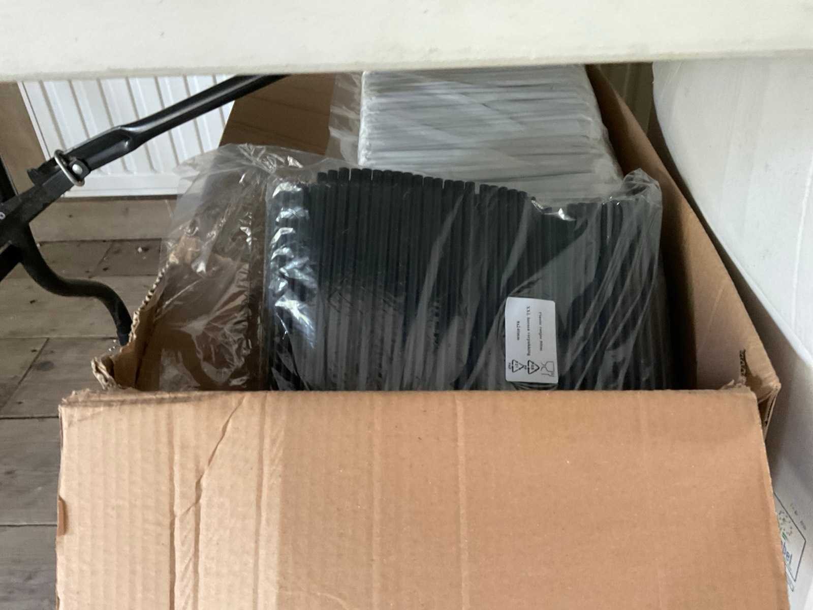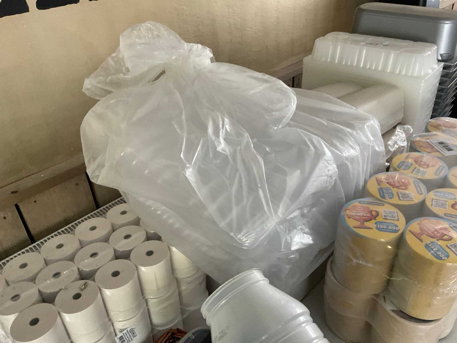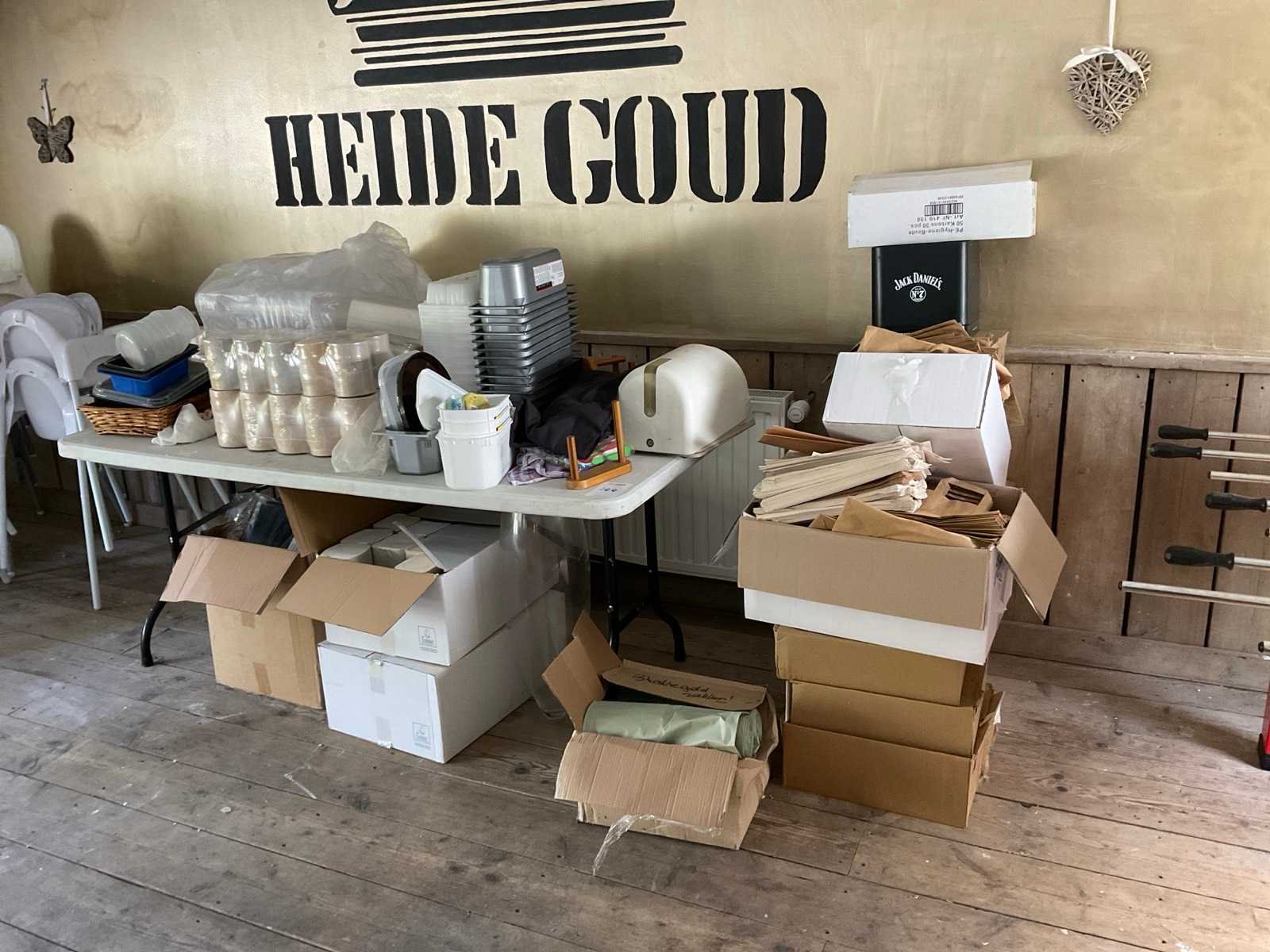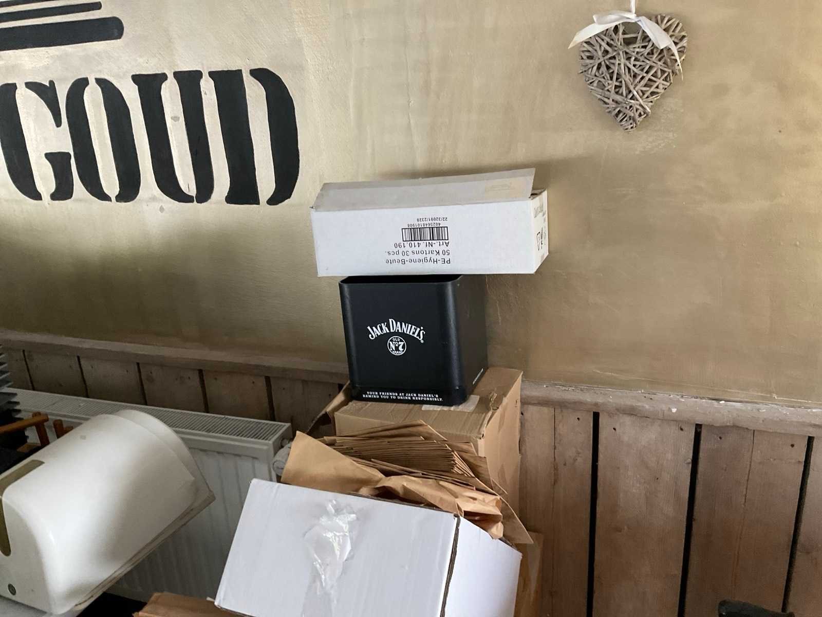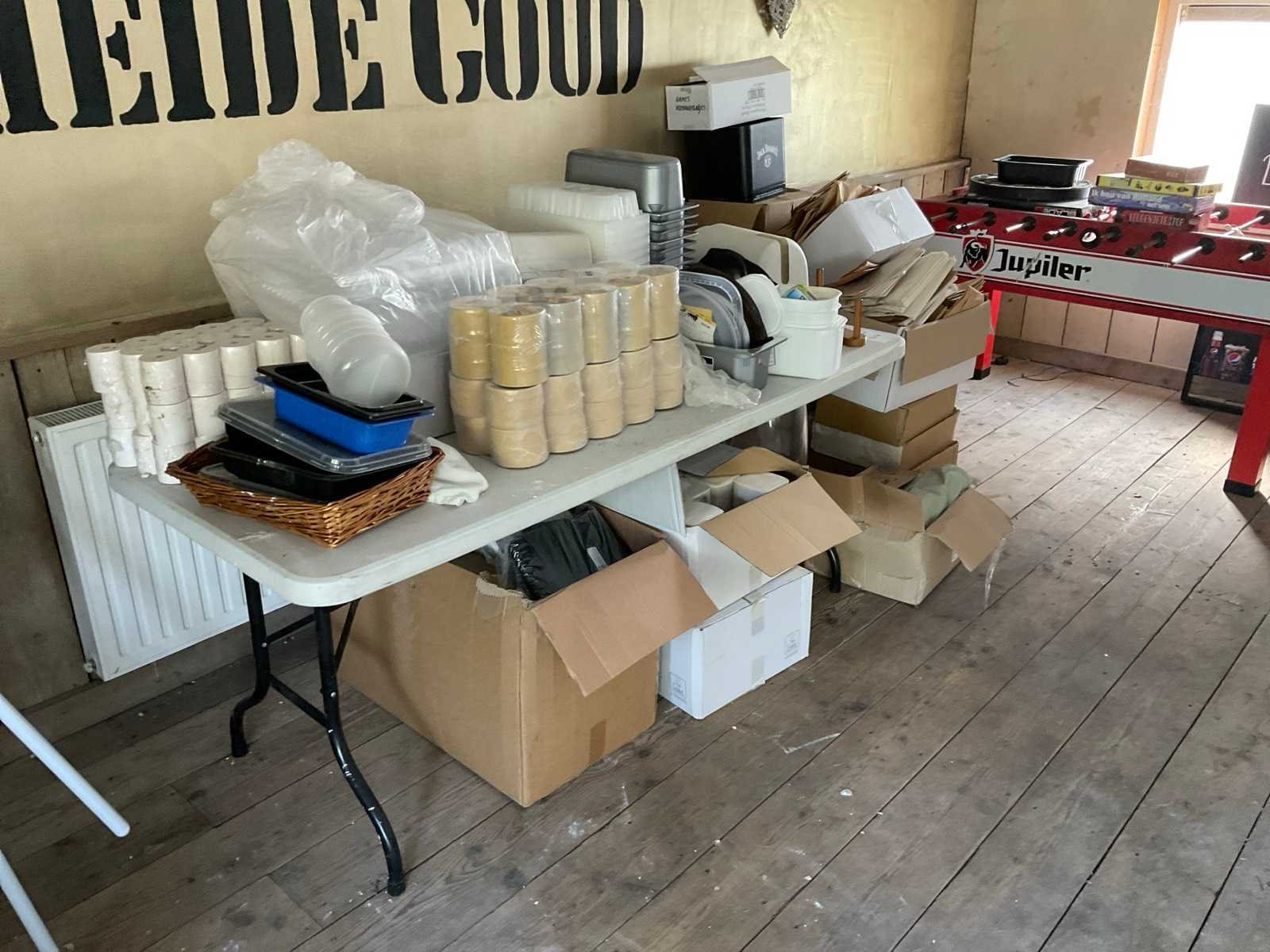 Bestaande uit: Onder andere: 1e: Viltjes 2e: Dispencer en papier 3e: Bakjes 4e: Tassen 5e: Vuilniszakken 6e: Rietjes 7e: Kassa rollen 8e: Mandjes 9e: Tafel (75x180x74 cm)