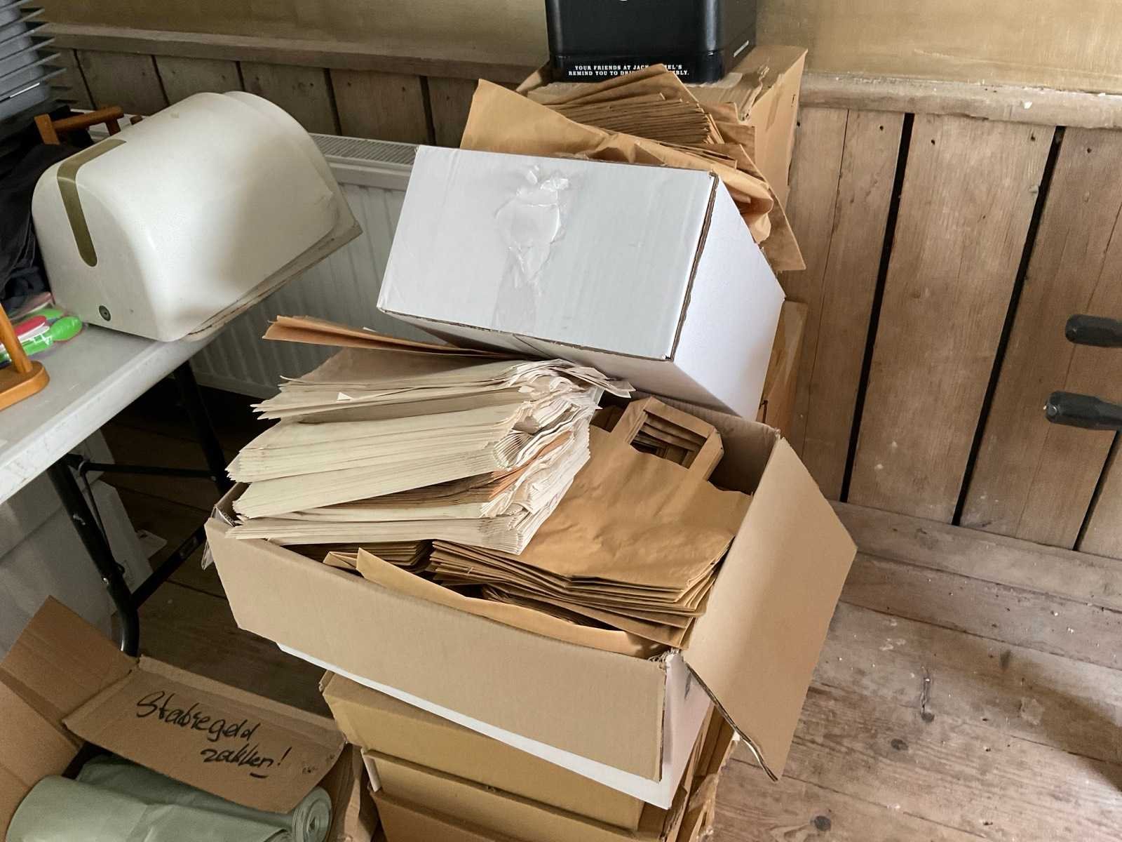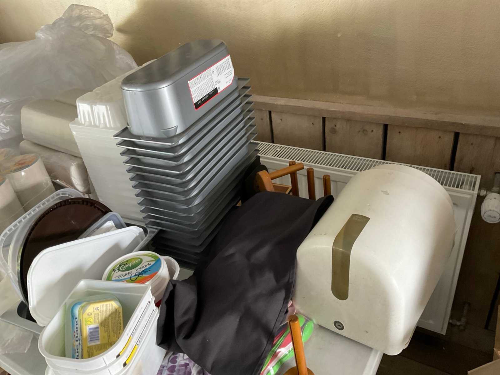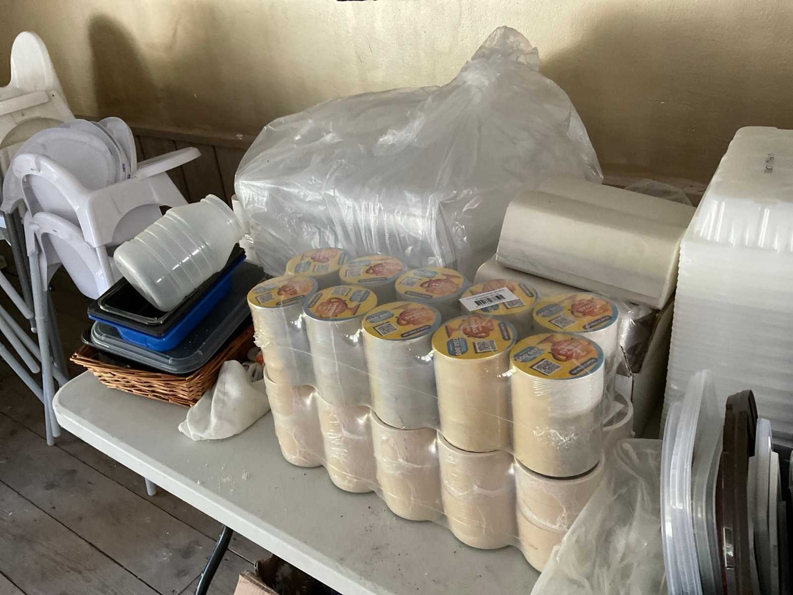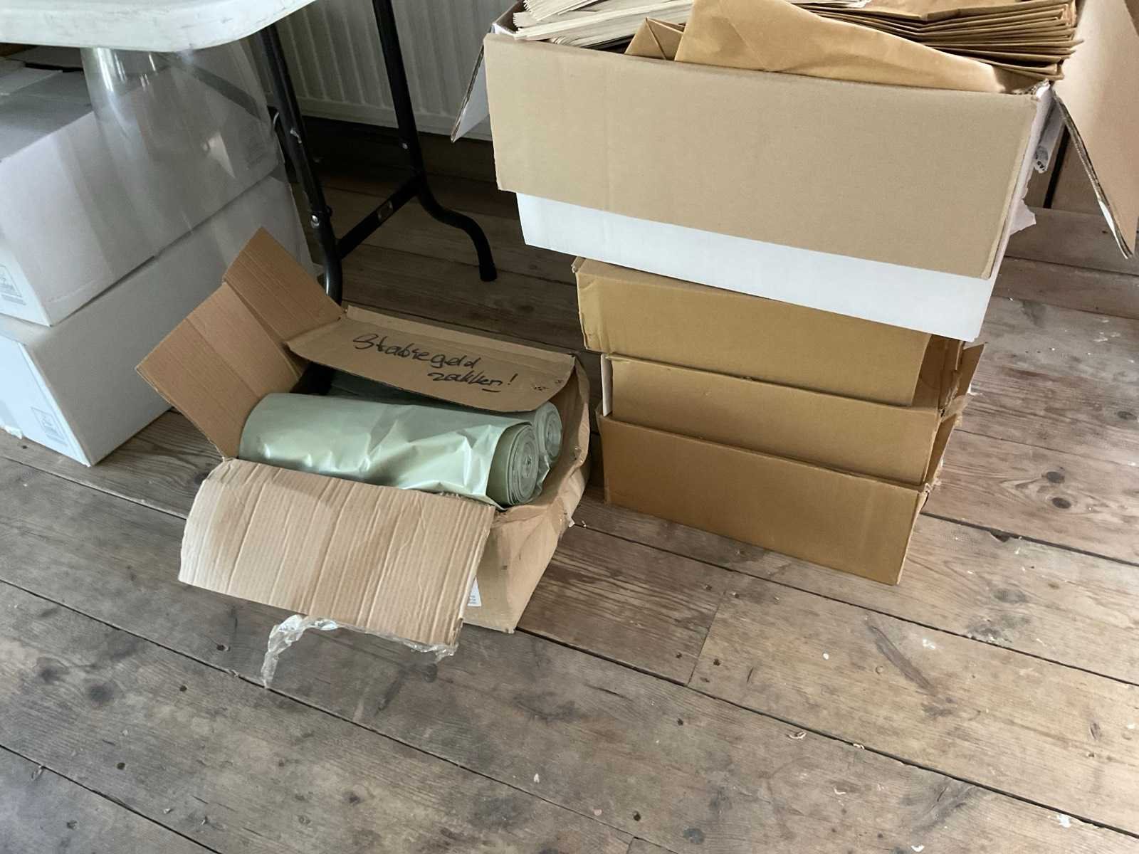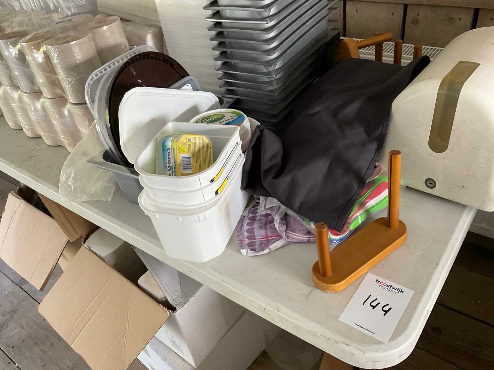 Bestaande uit: Onder andere: 1e: Viltjes 2e: Dispencer en papier 3e: Bakjes 4e: Tassen 5e: Vuilniszakken 6e: Rietjes 7e: Kassa rollen 8e: Mandjes 9e: Tafel (75x180x74 cm)