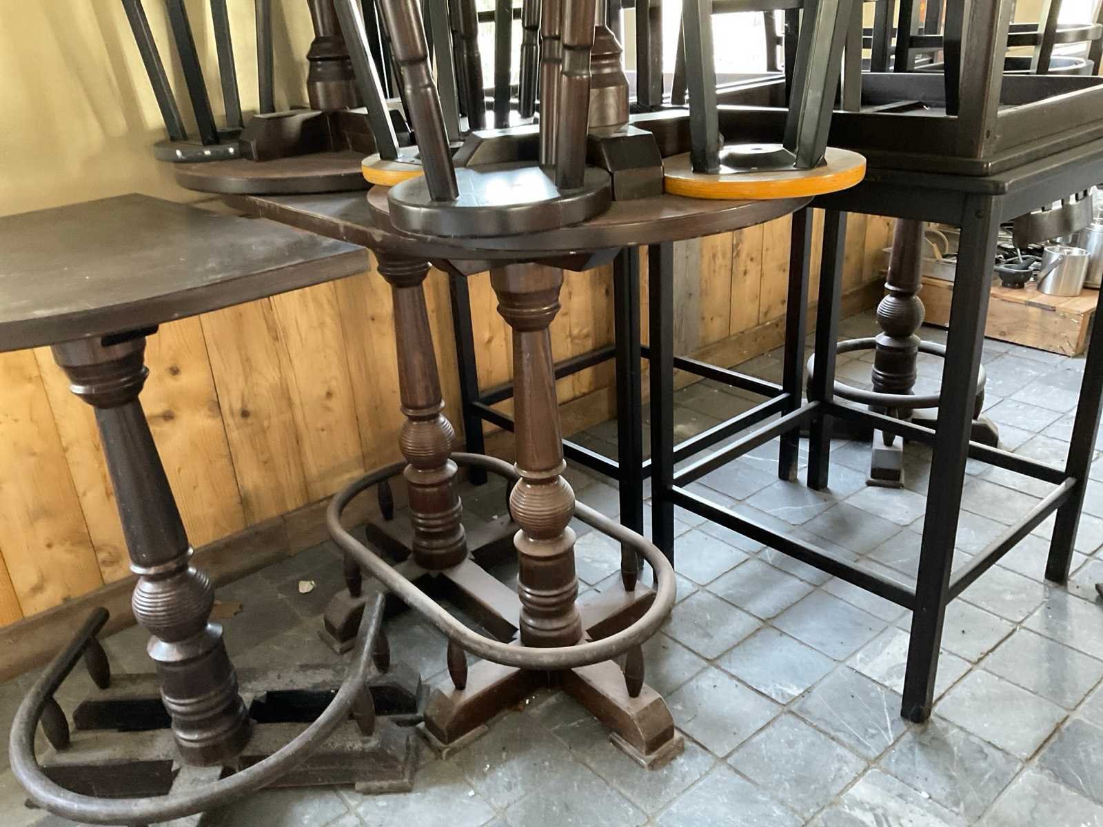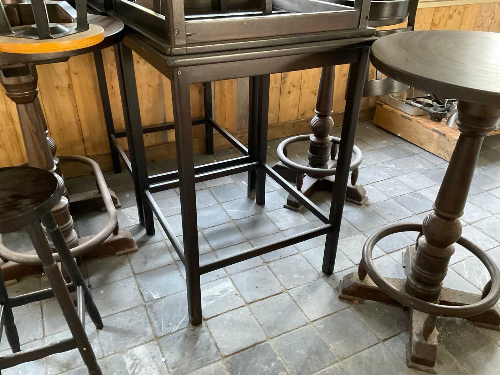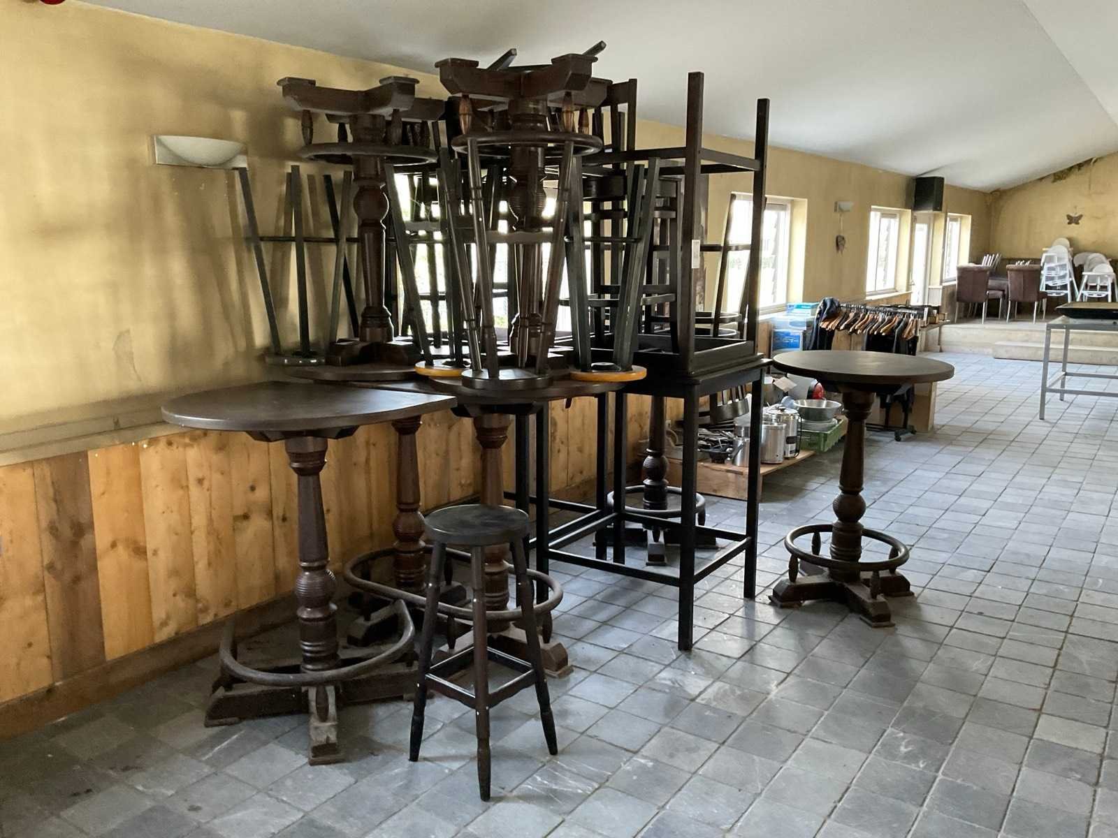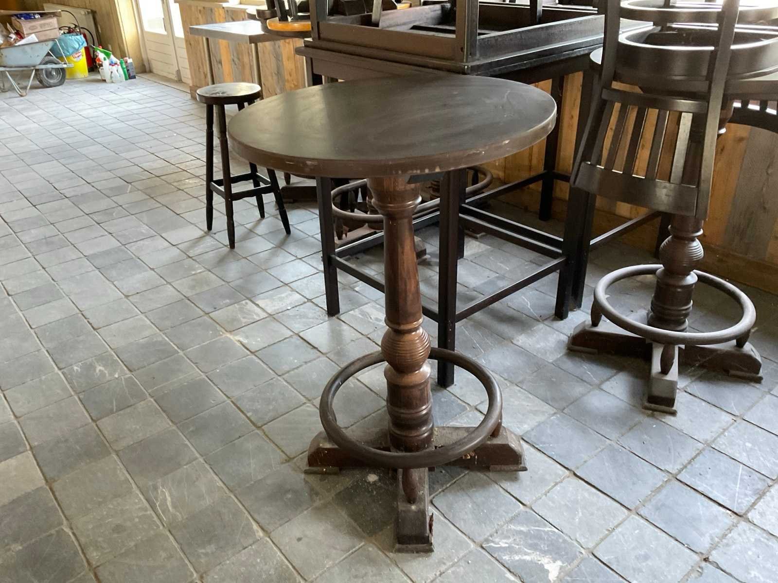 Bestaande uit: 4x 75 cm diameter, 1x 140x70 cm, 1x 70 cm muurtafel, 4x 80x80 cm, 7 krukken, 3 stoelen. Hoogte: 110cm