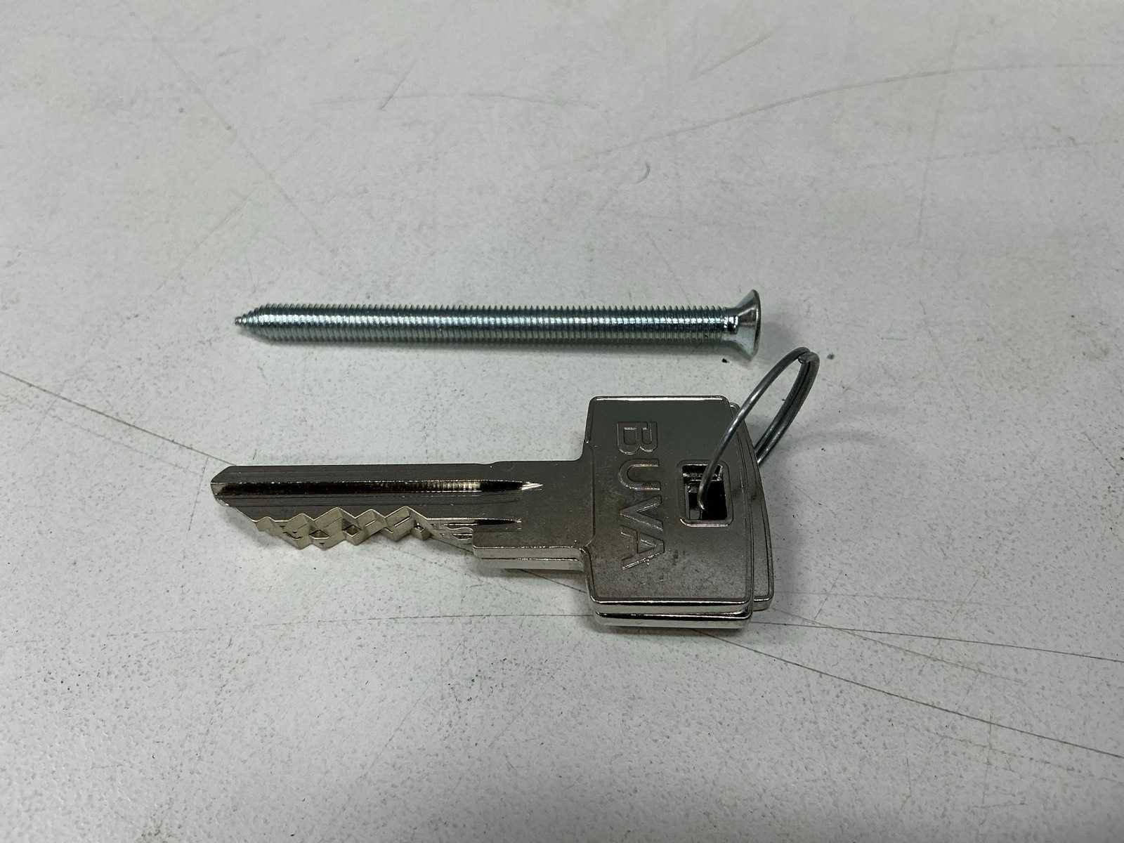 Compleet setje met slot sleutel en bijbehorende schroef Merk: Buva Model: 35-10 Product type: 452 Kleur: Zilver