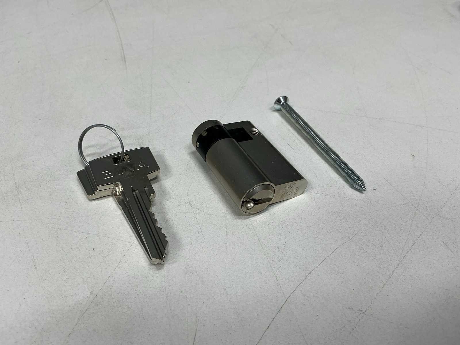 Compleet setje met slot sleutel en bijbehorende schroef Merk: Buva Model: 35-10 Product type: 452 Kleur: Zilver