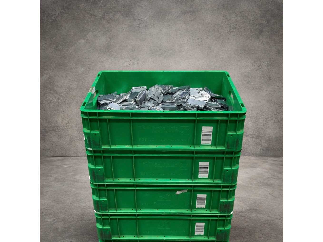Rond de 800/900 stuks, zit verpakt in de 4 groene kratten Merk: Buva Product type: 1417700 Kleur: Zilver Lengte: 7.5cm Breedte: 5.2cm Materiaal: Metaal