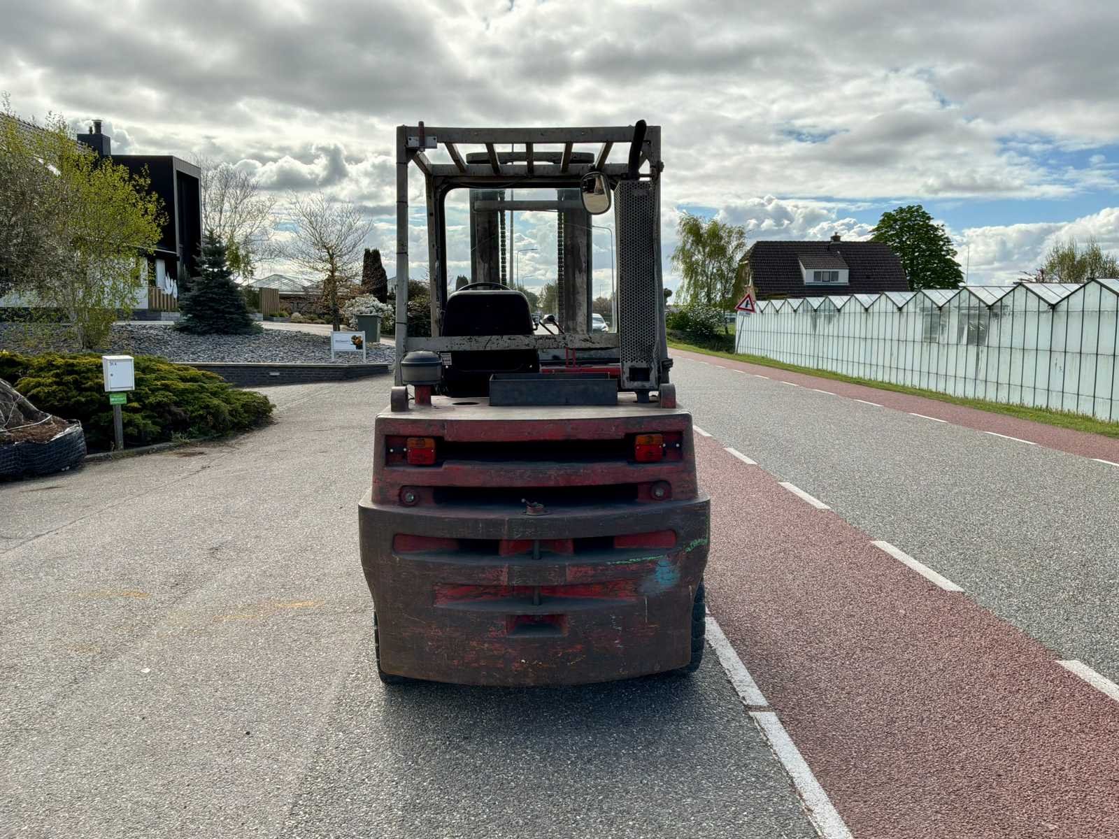 In goede staat verkerende heftruck uitgevoerd met goed lopende Mercedes Benz 5 cilinder dieselmotor. Merk: O&K Type: V40 Bouwjaar: 1984 Serienummer: 240957 Brandstof: Diesel Mast: Duplex Soort band: Volrubber banden Aantal wielen: 4 Afgelezen urenstand: 20005 Duplex mast: true Eigen gewicht: 5500kg Hefvermogen: 4000kg Lepellengte: 1200mm Vol rubber banden: true Minimale doorrijhoogte: 2420mm Totale afmeting L: 4150mm Totale afmeting Breedte: 1370mm Totale afmeting Hoogte: 2420mm Diesel: true