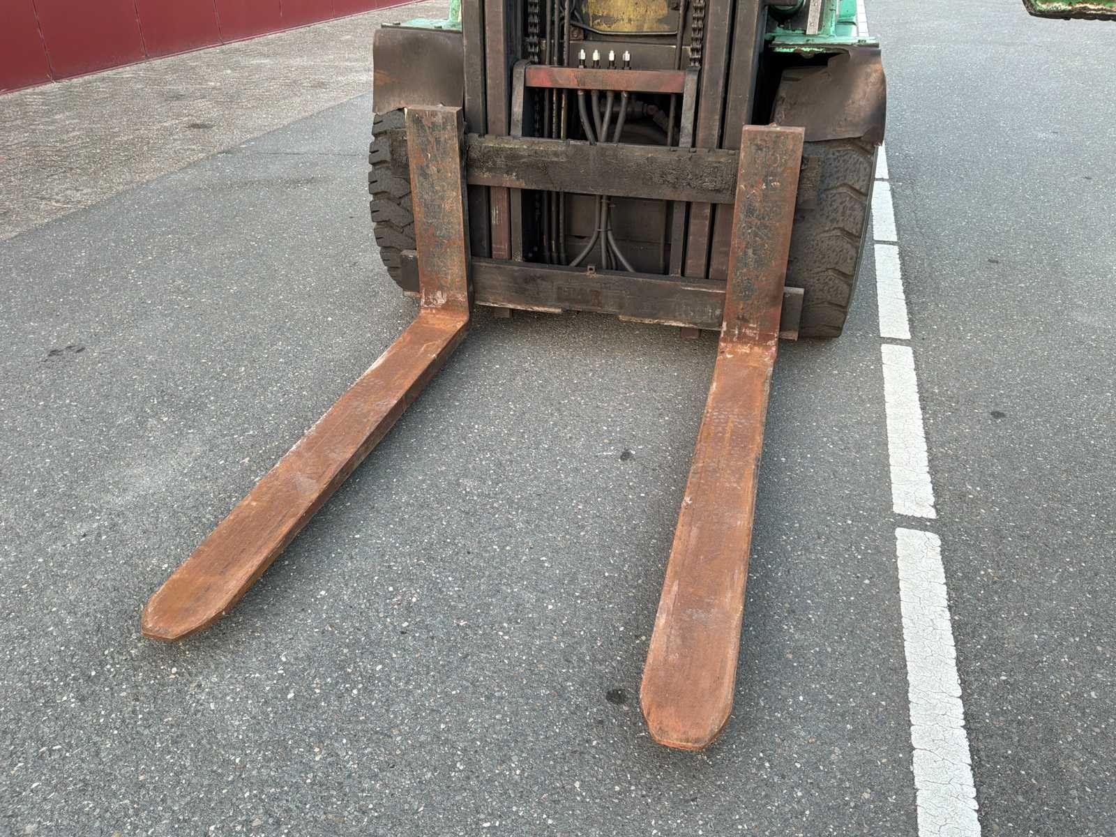Uitgevoerd met sterke 6 cilinder dieselmotor, na grote servicebeurt slechts 89 draaiuren gemaakt, start super met twee accu’s. Merk: Mitsubishi Type: FD40 Bouwjaar: 1997 Serienummer: EF19B50022 Brandstof: Diesel Mast: Duplex Aantal wielen: 4 Afgelezen urenstand: 9161 Duplex mast: true Eigen gewicht: 6020kg Hefvermogen: 4000kg Lepellengte: 1400mm Max. hefhoogte: 4500mm Minimale doorrijhoogte: 2970mm Totale afmeting L: 4600mm Totale afmeting Breedte: 1500mm Totale afmeting Hoogte: 2970mm Diesel: true