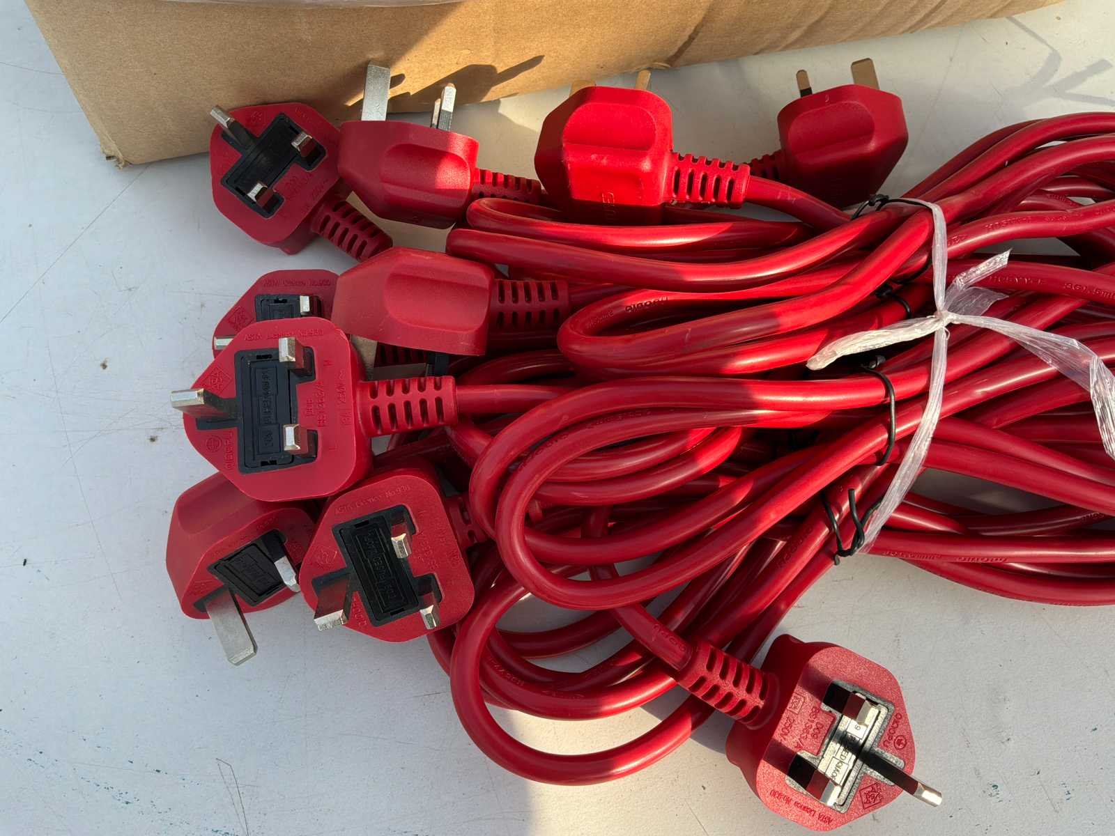 Doos met 80 stuks aansluitsnoer, dikte kabel 3x1,5 mm2 met geaarde Engelse stekker. Gewicht: 20kg Lengte: 160cm