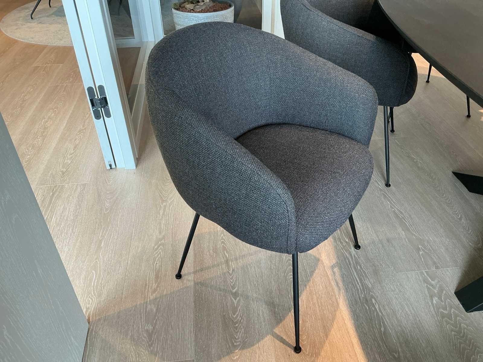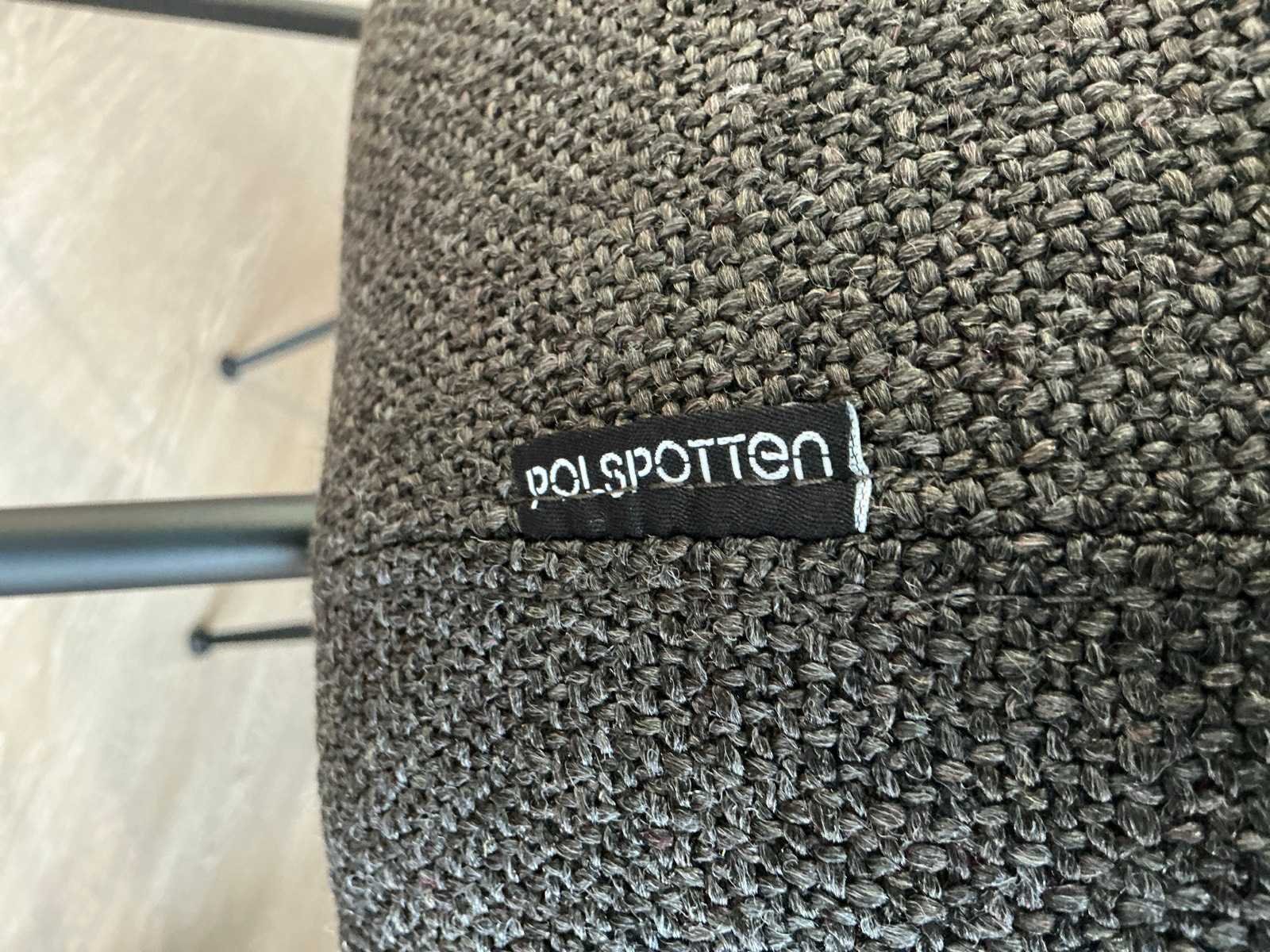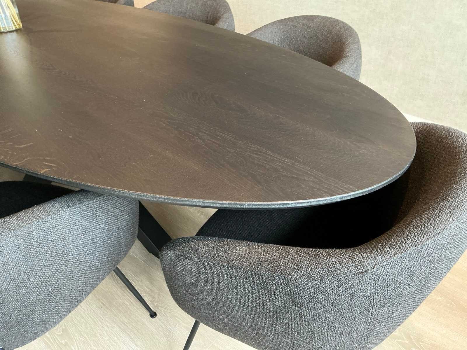 Tafel met metalen spinpoot, 8x Pols Potten stoel met stoffen kuip op metalen poot Kleur: Donkerbruin Lengte: 280cm Breedte: 119cm Hoogte: 76cm Materiaal: Hout en metaal
