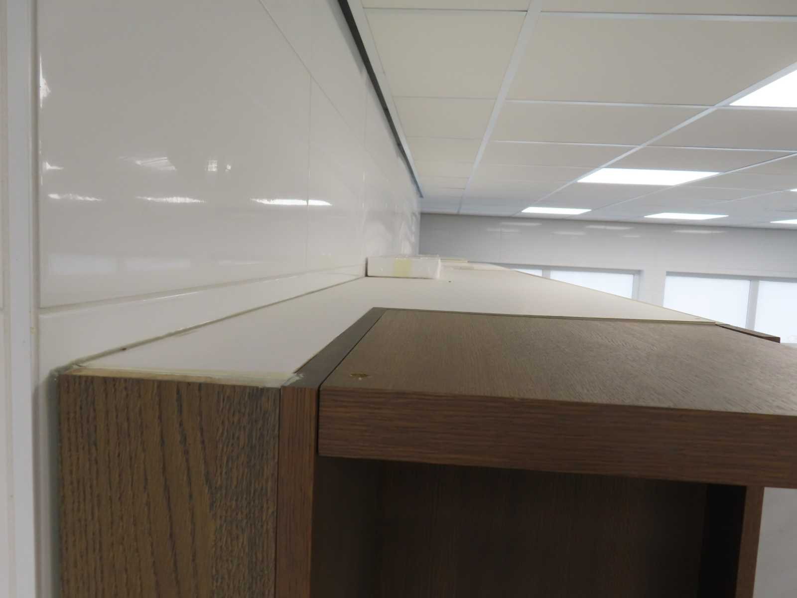 Met BSH inbouwkoelkast en vrieskast, maar zonder ovens (zie kavel 1024). Donker eiken fineer ombouw, deuren in marmer look. Weerzijde van schappen. Afmeting: ca 248x453x58 cm (hxlxd).