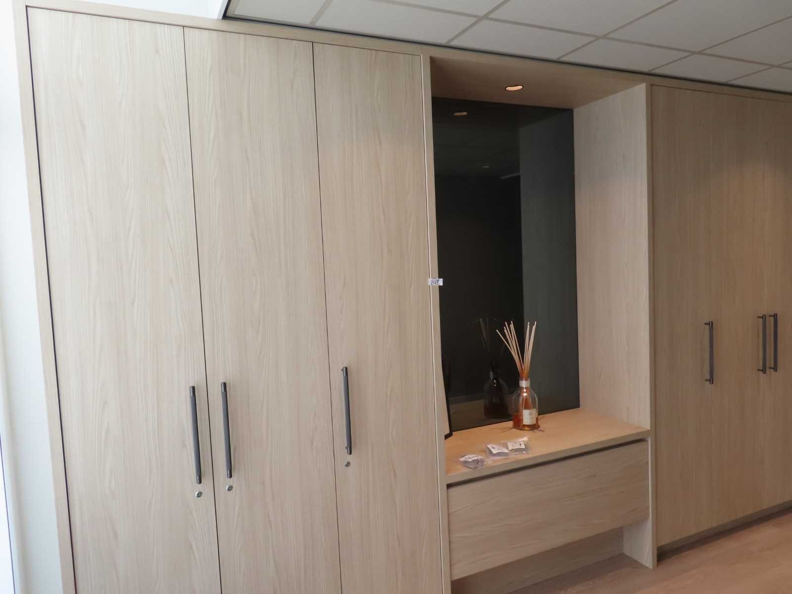 Bestaande uit deels meterkast ombouw deel, ladekast opstelling met rookglas spiegel en plafondspot en kledingkast gedeelte. Essen/Eiken decor. Totaal afmeting: circa 266x427x62 cm (hxlxd). Onbekend of het in zijn geheel gedemonteerd kan worden. Zonder sleutels.