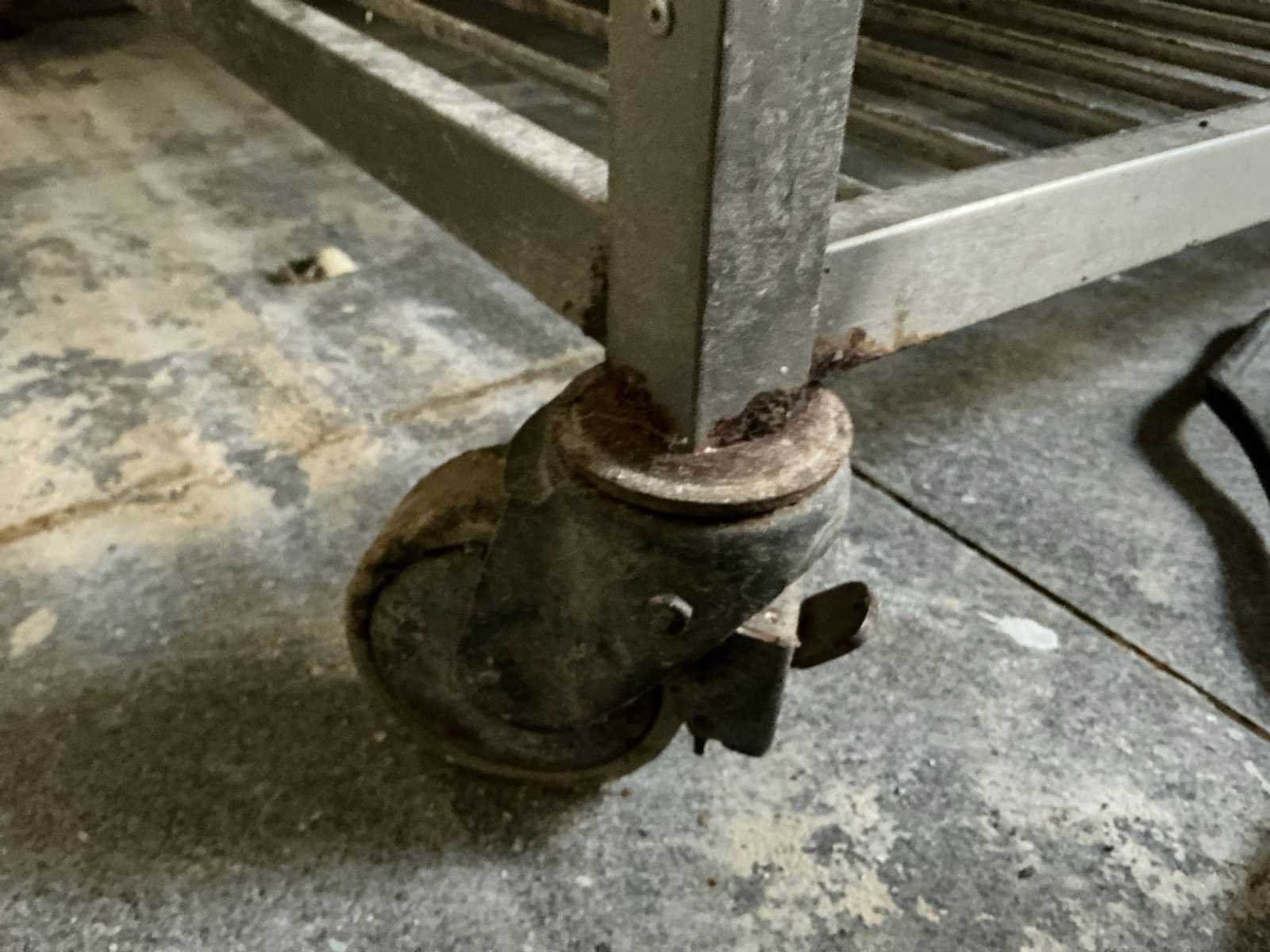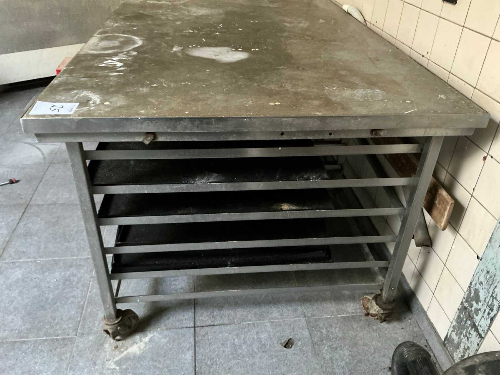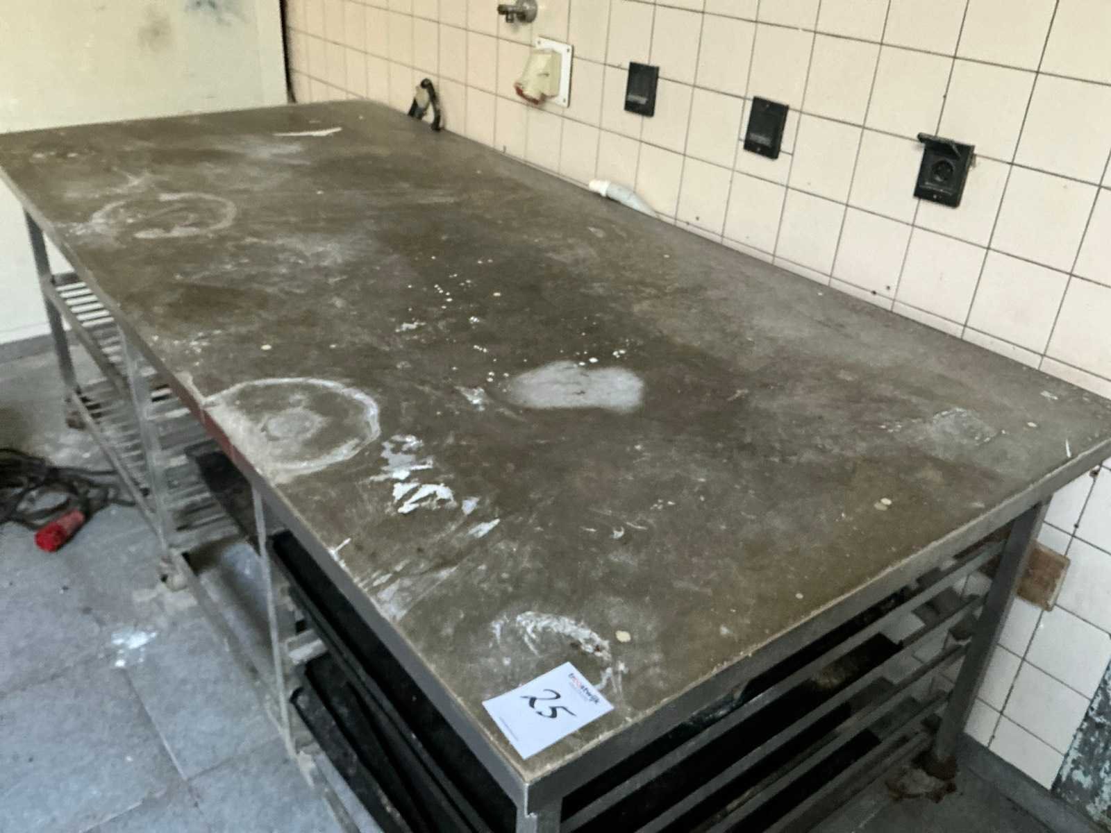 Voorzien van 2x onderlegger en 6x bakplaat; met 6x zwenkwiel Materiaal: Rvs met kunststof bovenblad Totale afmeting Breedte: 1210mm Totale afmeting L: 2610mm Totale afmeting Hoogte: 940mm