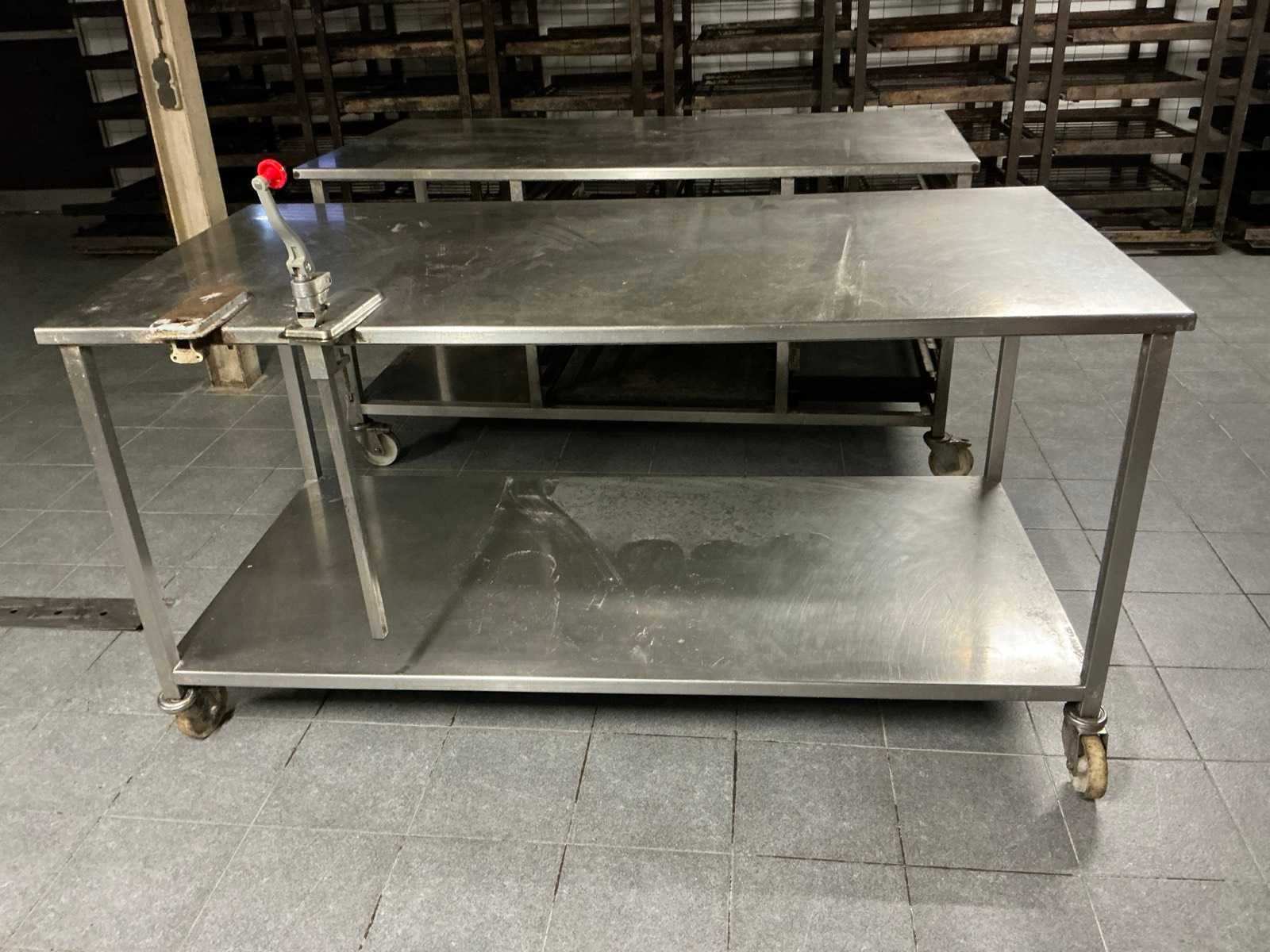 Met onderlegger; voorzien van 4 zwenkwielen waarvan 2 met rem; met blikopener Lengte: 185cm Breedte: 90cm Hoogte: 93cm Materiaal: Rvs