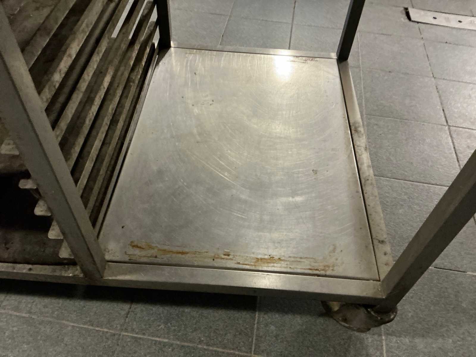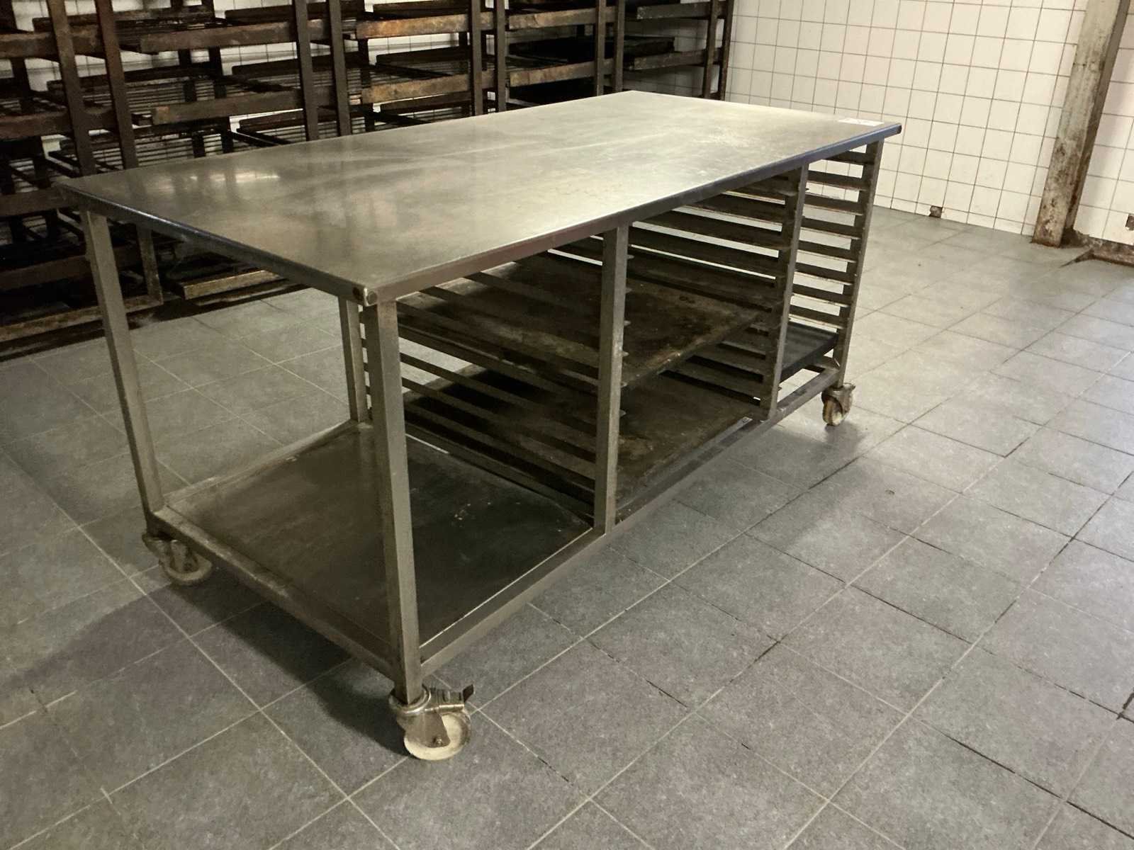 Met onderlegger en leggers voor bakplaten in twee breedtes 40 en 70cm; voorzien van 4 zwenkwielen met rem; Lengte: 185cm Breedte: 90cm Hoogte: 93cm Materiaal: Rvs