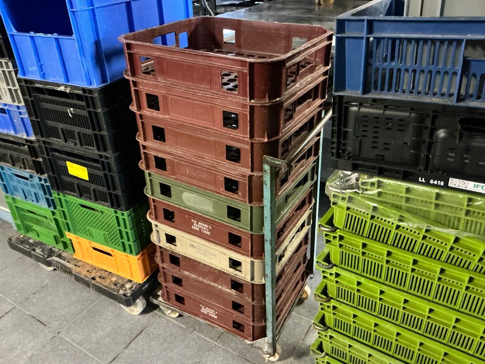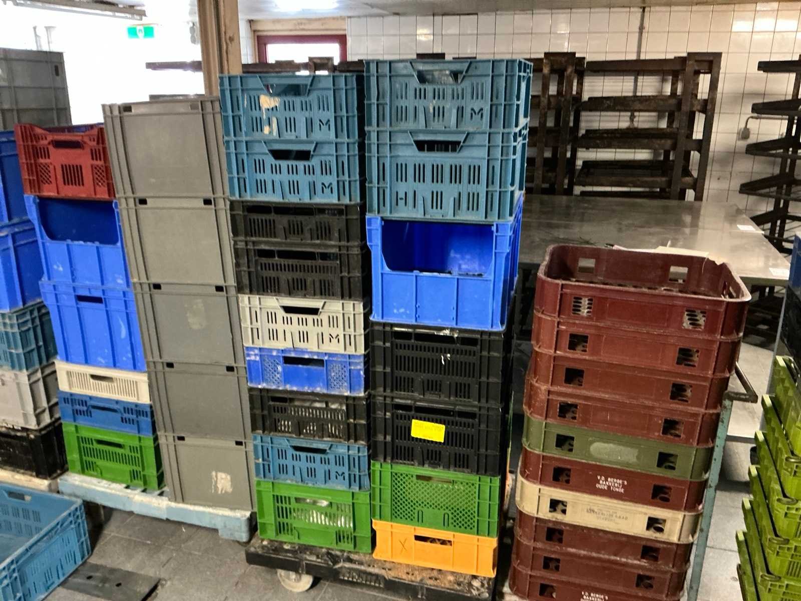 Circa 110 stuks diverse modellen; maten en kleuren: deels stapelbaar; deels kratbaar; met enkele transportwagens