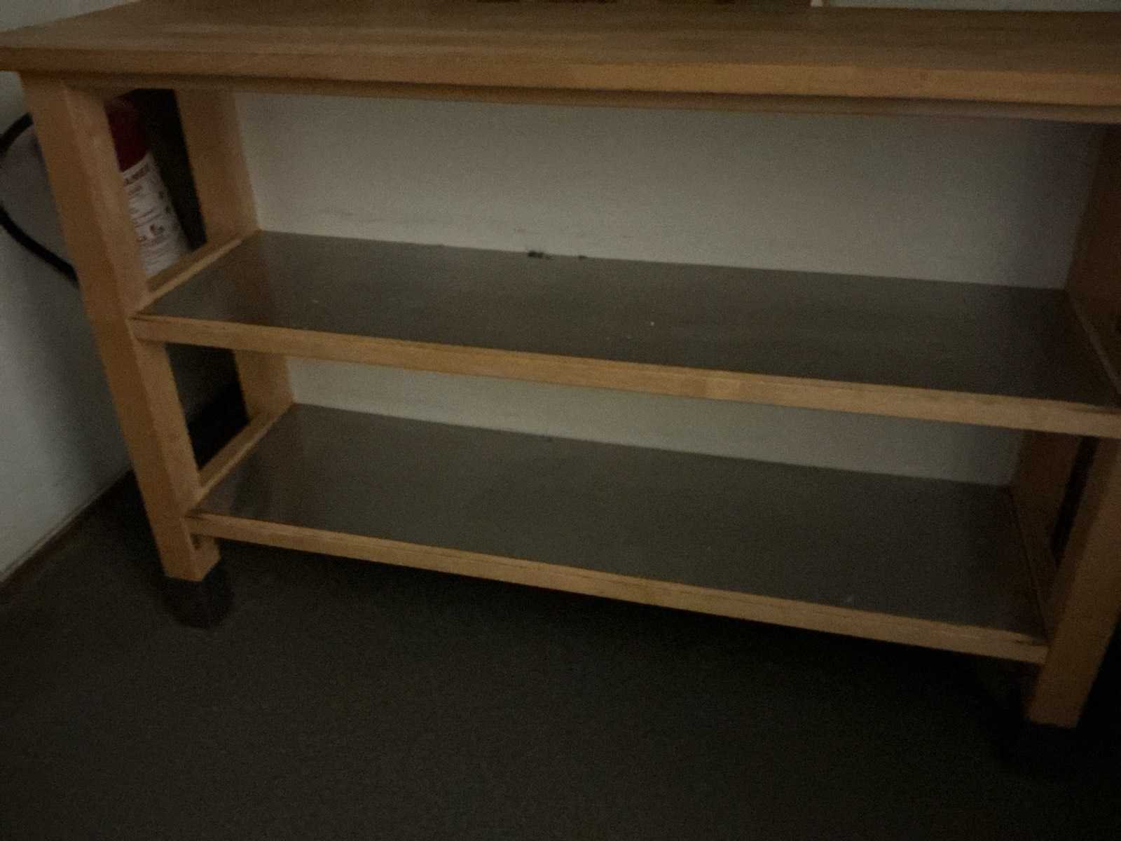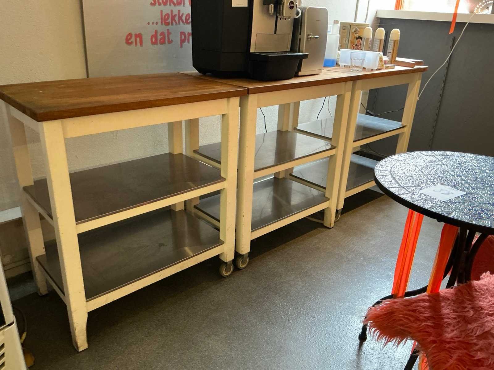 3x verrijdbare tafel 79x51x90 cm; 2x klapstoel; 1x tafel; tafelblad ø 60 cm; 1x tafel 146x40x90 cm