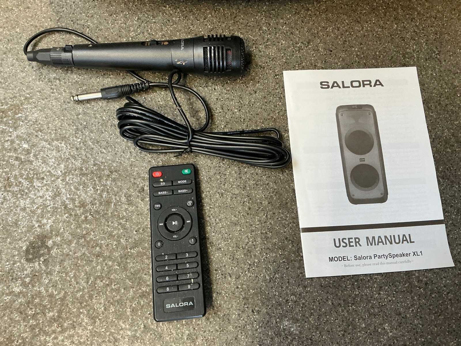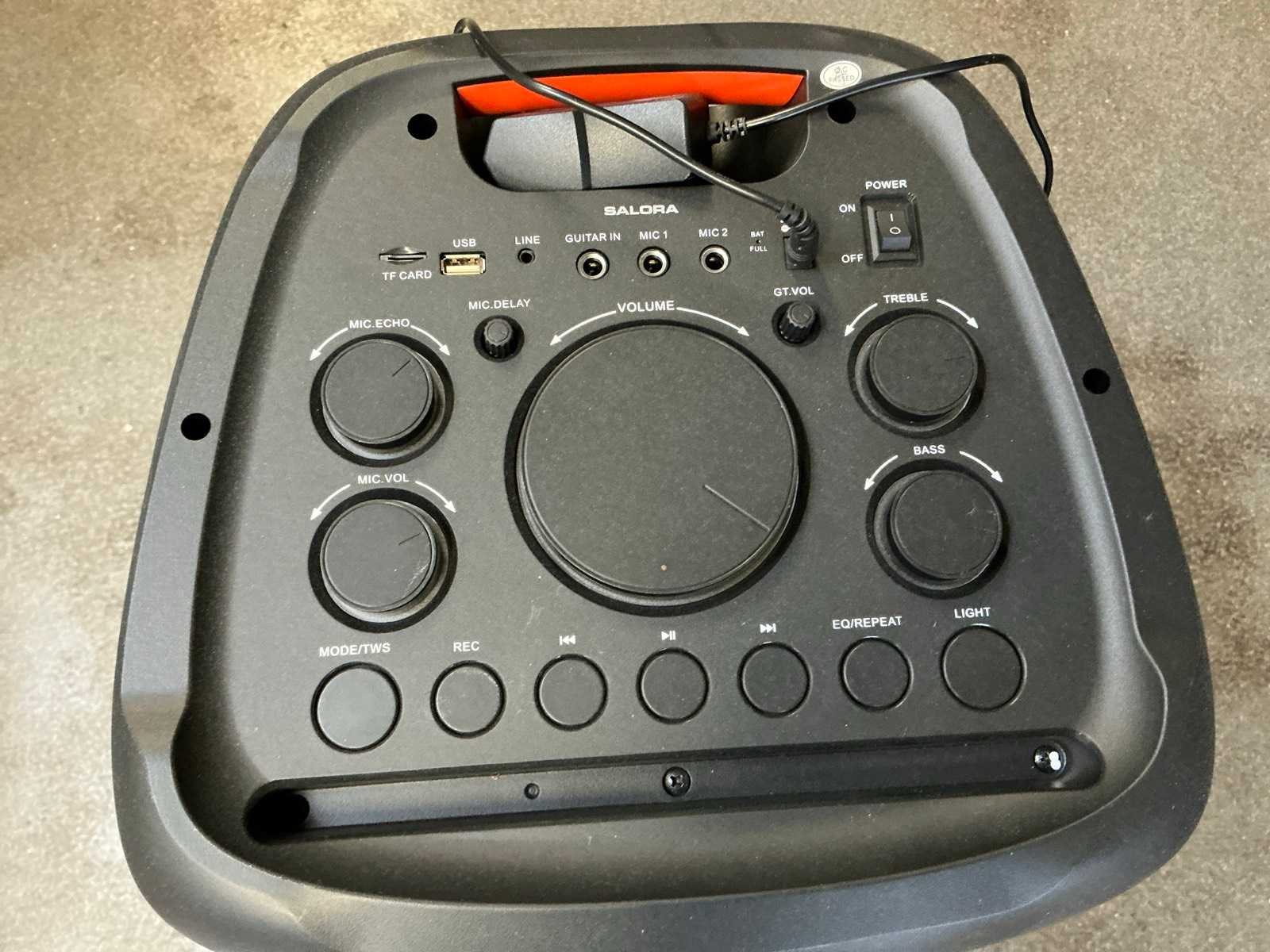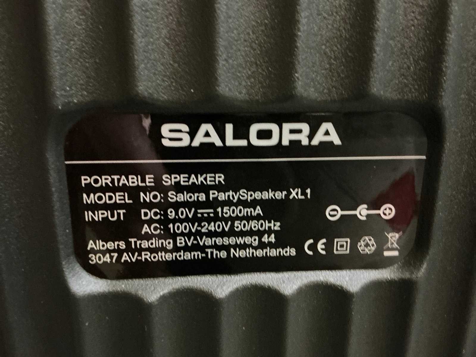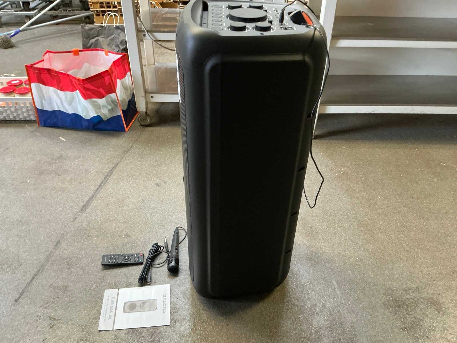 Met oplader 230v; microfoon en afstandsbediening Merk: Salora Type: Partyspeaker XL1 Actief: true Aansluiting: 230V Totale afmeting L: 370mm Totale afmeting Breedte: 350mm Totale afmeting Hoogte: 850mm
