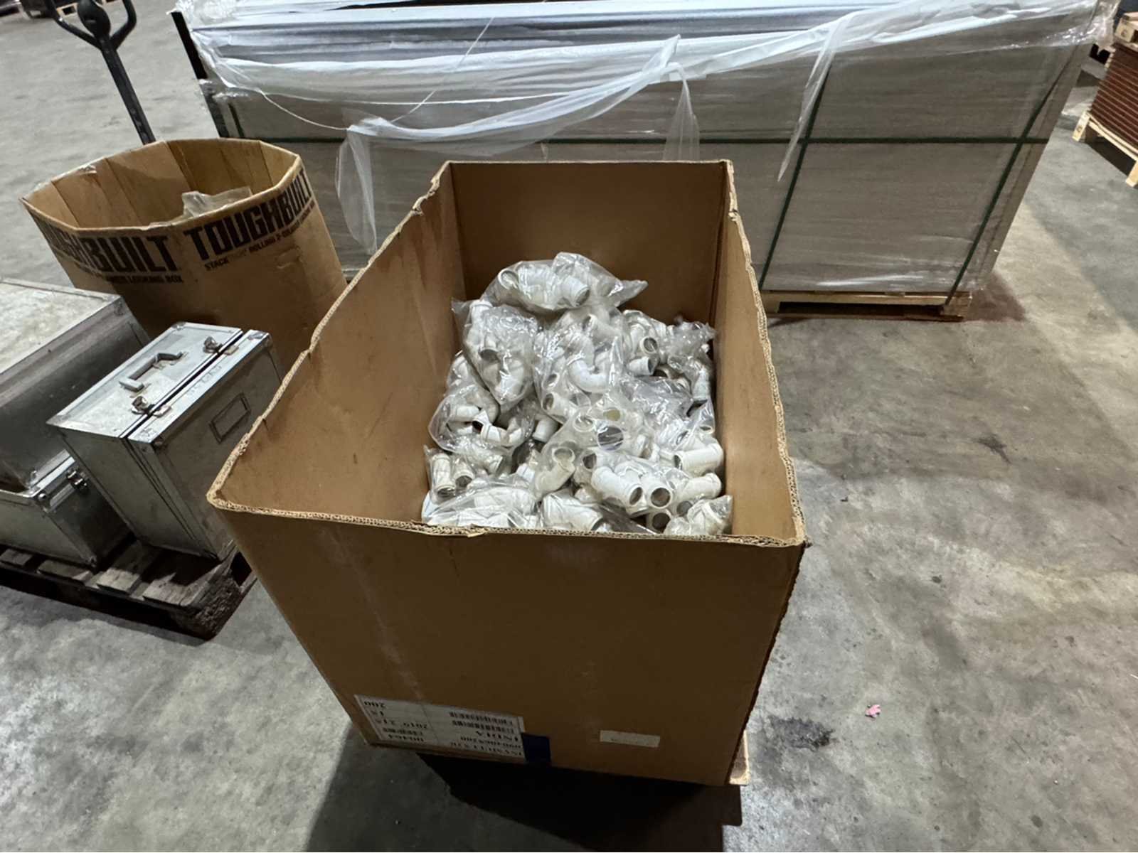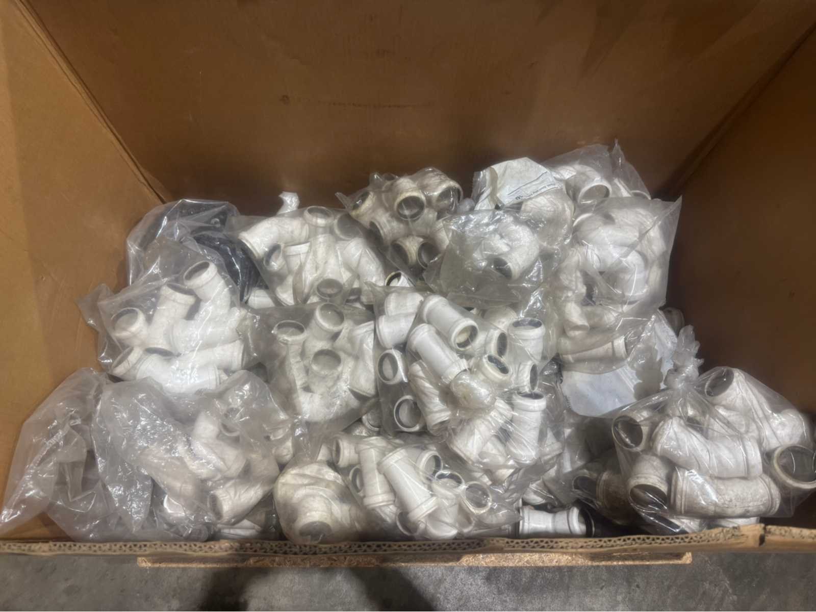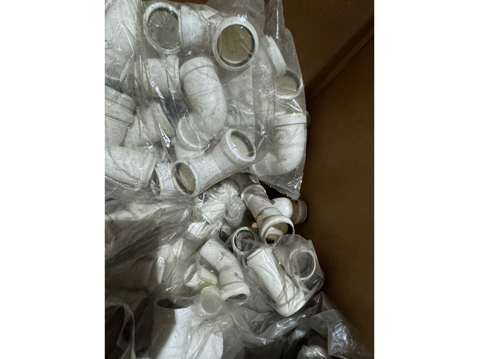 Doos met diverse ongebruikte pvc koppelingen; aantal onbekend